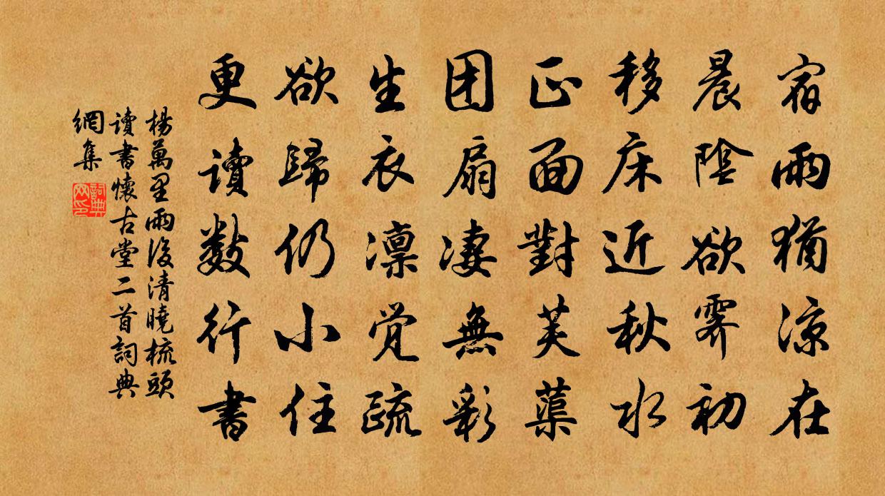 詩詞名句歷史字典書法欣賞書法字典國語詞典說文解字康熙字典古漢語字典標 題 作 者 詩 句 雨後清曉梳頭,讀書懷古堂二首作者:楊萬里 朝代:宋代原文宿雨猶涼在,晨陰欲霽初。移床近秋水,正面對芙蕖。團扇淒無彩,生衣凜覺疏。欲歸仍小住,更讀數行書。詩詞問答問:《雨後清曉梳頭,讀書懷古堂二首》的作者是誰?答:楊萬里問:該詩寫於哪個朝代?答:宋代問:楊萬里的名句有哪些?答:楊萬里名句大全書法欣賞雨後清曉梳頭,讀書懷古堂二首書法作品詩詞推薦酬張十八病中寄詩王建〔唐代〕本性慵遠行,綿綿病自生。見君綢繆思,慰我寂寞情。風幌夜不掩,秋燈照雨明。彼愁此又憶,一夕兩盈盈。第二偈頌十首釋如淨〔宋代〕無衫歌扇,花鼓拍板。總是者個戲棚,賣弄許多伎倆。咦,任他千聖出頭來,立在下風高著眼。建法幢,立宗旨,郡樓晴望二首羊士諤〔唐代〕霽色朝雲盡,亭皋露亦晞。褰開臨曲檻,蕭瑟換輕衣。地遠秦人望,天晴社燕飛。無功慚歲晚,唯念故山歸。一雨次余仲庸松風閣韻十九首 其四裘萬頃〔宋代〕不見詩仙何遜來,春風幾度早梅開。竹籬茅舍自清絕,未用移根東閣栽。處州蒼嶺翁卷〔宋代〕步步躡飛雲,初疑夢裡身。村雞數聲遠,山舍幾家鄰。不雨溪長急,非春樹亦新。自從開此嶺,便有客行人。觀梅和陳天予韻王之道〔宋代〕斷橋疏竹帶山幽,裝點詩人覓句愁。多謝雙魚傳尺素,絕勝斗酒得涼州。九江琵琶宋敏求〔宋代〕夜泊尋陽宿酒樓,琵琶亭畔獲花秋。雲沈鳥沒事已往,月白風清江自流。登巴陵開元寺西閣贈衡岳僧方外李白〔唐代〕衡岳有闡士,五峰秀真骨。見君萬里心,海水照秋月。大臣南溟去,問道皆請謁。灑以甘露言,清涼潤肌發。明湖眾人觀俳優黃庭堅〔宋代〕眾人書觀俳優,書誠有可笑書時。侏儒笑人後,所笑動未知。非桀是堯舜,諸生同一詞。不能解其會,何笑侏儒為送因大師釋重顯〔宋代〕瘦藤清對紫方袍,閒步坤維意轉高。若到慎江人借問,金輪王子是吾曹。秋吟黃庚〔宋代〕曉徑支筇步屟遲,西風吹露濕秋衣。舉頭凝望青山外,萬里江天一雁飛。水調歌頭(又孫靖州應龍生日)魏了翁〔宋代〕九十九峰下,百二十年州。西風吹起客夢,月滿驛南樓。影入天河左界,辰在壽星向上,還是去年秋。要和木蘭曲溪上羅公升〔宋代〕往歲貪奇覽,今年遂老槃。門前溪一發,我作五湖看。尤延之檢正直廬窗前紅木犀一小株盛開,戲呈楊萬里〔宋代〕水沉國里御風歸,栗玉肌虜不肯肥。元是金華學仙子,新將柿葉染秋衣。不應裝束追時好,無乃清癯悔昨非。為妒延平次鄭粹答田父詞韻陳宓〔宋代〕兒飢誰與哺,衣破誰與補。田家安樂時,尚有饑寒苦。況值久旱餘,十須逾缺五。加以瘧鬼威,空廬倍貧窶。我適句徐壽仁〔宋代〕放懷追許謝,洗耳笑巢由。偈頌一百四十一首釋師範〔宋代〕有一物,黑似漆,亘古今,無人識。卻被秋蟲知,唧唧空嘆息。而今拈出普請看,分文不直。雁南飛戴表元〔宋代〕雁南飛,飛且鳴。我不愛爾絕漢排雲之健翼,愛爾秋來意氣各有適,江湖萬里同風聲,風聲萬里秋蕭索,山鄉田荒春日田園雜興仇遠〔宋代〕一灣新綠護茅廬,草細泥忪已可鋤。野老但知分社酒,地官寧復進農書。鶯花眼界人煙外,蠶麥生涯穀雨余。我愛和季弟韻二十首劉克莊〔宋代〕荒村隨分有區廛,不在花邊即水邊。甚懶安能詩詠史,已歸不復賦思玄。提壺聲好行沽酒,撲滿身災坐貯錢。揀個名句推薦秀樾橫塘十里香,水花晚色靜年芳。蔡松年《鷓鴣天·賞荷》 妙年出補父兄處,公自才力應時須黃庭堅《送范德孺知慶州》 為奏薰琴唱,仍題寶劍名。張九齡《奉和聖制送尚書燕國公赴朔方》 春雲吹散湘簾雨,絮黏蝴蝶飛還住。納蘭性德《菩薩蠻·春雲吹散湘簾雨》 軍歌應唱大刀環,誓滅胡奴出玉關。徐錫麟《出塞》 不管垂楊珠淚進,滴碎荷聲千頃。王夫之《清平樂·詠雨》 握手西風淚不乾,年來多在別離間。納蘭性德《於中好·送梁汾南還為題小影》 擾擾馬足車塵,被歲月無情,暗消年少。元好問《玉漏遲·詠杯》 一念慈祥,可以醞釀兩間和氣;寸心潔白,可以昭垂百代清芬。洪應明《菜根譚·概論》 碧水丹山映杖藜,夕陽猶在小橋西。沈周《題畫》