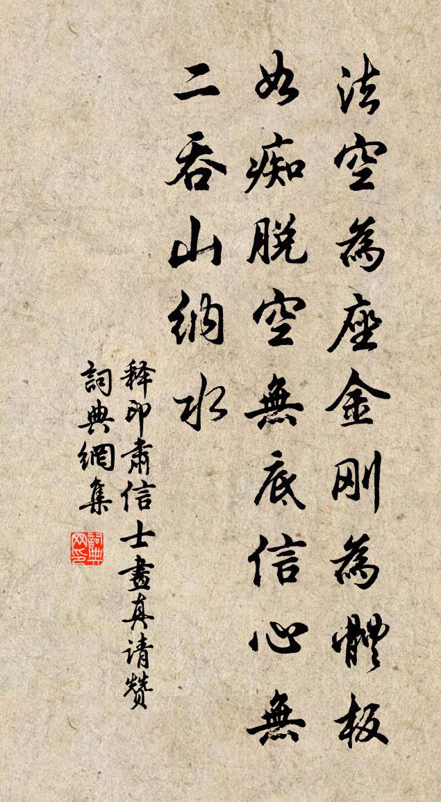 詩詞名句歷史字典書法欣賞書法字典國語詞典說文解字康熙字典古漢語字典標 題 作 者 詩 句 信士畫真請贊作者:釋印肅 朝代:宋代信士畫真請贊原文法空為座,金剛為體,板如痴脫空無底。信心無二,吞山納水。詩詞問答問:信士畫真請贊的作者是誰?答:釋印肅問:信士畫真請贊寫於哪個朝代?答:宋代釋印肅信士畫真請贊書法欣賞信士畫真請贊書法作品詩詞推薦拜明招二先生墓有感王柏〔宋代〕炯炯長空一片心,東南鼎立統斯文。卷藏萬古春歸去,只有餘光在此君。偈頌一百二十三首釋普度〔宋代〕當初已是錯投胎,鬼面神頭相賺來。裂破虛空無罅縫,龜毛拂子舞三台。孟津歲晚十首宋庠〔宋代〕隱軫分河壤,崢嶸念歲華。關雲沈鞏樹,樓月嘯羌笳。要路誰雲騁,浮生會有涯。高哉羨門子,橫海挹朝霞。次亞愚韻王諶〔宋代〕萬里春光眼界明,半處斜日醉魂醒。有時夢入廬山去,瀑布聲中拄杖行。金縷曲/賀新郎劉辰翁〔宋代〕襟淚涔涔雨。料騷魂、水解千年,依然輕舉。還看吳兒胥濤上,高出浪花幾許。絕倒是、東南旗鼓。風雨蛟龍爭何從軍詩五首·其五王粲〔兩漢〕悠悠涉荒路,靡靡我心愁。四望無煙火,但見林與丘。城郭生榛棘,蹊徑無所由。雚蒲竟廣澤,葭葦夾長流。日夕琴王昌齡〔唐代〕孤桐秘虛鳴,樸素傳幽真。仿佛弦指外,遂見初古人。意遠風雪苦,時來江山春。高宴未終曲,誰能辨經綸。州將按行堤上宋祁〔宋代〕十萬堤封限迅流,騰裝清曉徑春疇。駐車楚老漿盈野,勸築睢陽杵有謳。梅暖晚香薰宿館,雪天零霰犯輕裘。桑郊又簡張王臣趙蕃〔宋代〕留落殊方少故人,豈其再見愈情親。幾因高論興衰颯,頻藉深杯慰苦辛。只道朝天在長夏,那知奉檄又殘春。未聞水龍吟(次邛州趙守韻)京鏜〔宋代〕推移隨牒紅塵里,試問幾時肩息。家鄉何在,煙迷波渺,雲橫山屹。分閫無功,臨民有愧,褲今襦昔。想征帆萬里窮居陸游〔宋代〕仕宦初何得,窮居半士農。清宵叔夜鍛,平旦伯鸞舂。馬磨猶支日,牛衣亦過冬。湖中有嘯父,何計得相從?次韻梁尉秦碑莫濟〔宋代〕六王失國四海歸,秦皇東刻南巡碑。法因史籀有增減,名與蒼頡爭飛馳。自言功德可歌頌,黔首個個愚無知。海神漁父吳錫疇〔宋代〕笭箵儘自了生涯,雲淡風輕一杖藜。伐木詩亡交道絕,綿蠻空為盡情啼。隆興甲申歲閏月游焦山韓元吉〔宋代〕荒村日晴雪猶積,系纜焦公山下石。江翻斷崖石破碎,瘞鶴千年有遺蹟。瘦藤百級躋上方,浮玉南北法中央。檣午虞美人(臨安客店)向滈〔宋代〕酒闌欹枕新涼夜。斷盡人腸也。西風吹起許多愁。不道沉腰潘鬢、不禁秋。如今病也無人管。真箇難消遣。東鄰一不解算四首陳普〔宋代〕管晏商斯幾揣摩,盡夸掌上有山河。當身成就憑君問,孰與顏曾孔孟多。送王炎弼赴山陽守以兵衛森畫戟宴寢凝清香為曾協〔宋代〕別兄今幾時,邦人指難弟。莫誦海沂康,兩馮如魯衛。玉山嶺上作皇甫曾〔唐代〕悠悠驅匹馬,征路上連岡。晚翠深雲竇,寒台淨石樑。秋花偏似雪,楓葉不禁霜。愁見前程遠,空郊下夕陽。又寄興化徐虞部蔡襄〔宋代〕梅花狼籍拂輕舟,人日溪行動客愁。上晝去程初北首,故山歸思滿東流。垂垂朝雨隨雙槳,草草春蔬送一甌。不獨謝潘端叔惠紅梅樓鑰〔宋代〕歲晚紅英繞凍柯,玉人無那醉顏酡。廣平賦就如逢妝,鐵石心腸可柰何。名句推薦雖然不如延年妹,亦是當時絕世人。李白《中山孺子妾歌》 楊柳東風樹,青青夾御河。王之渙《送別》 蠟炬風搖簾不下,竹影半牆如畫。項鴻祚《清平樂·池上納涼》 君子戒慎乎其所不睹,恐懼乎其所不聞。莫見乎隱,莫顯乎微,故君子慎其獨也。子思《禮記·中庸》 賈傳自憐多感慨,東門何意泥孤虛。王惲《送姬仲實隱士北還》 君似孤云何處歸,我似離群雁。周紫芝《卜運算元·席上送王彥猷》 蒲生我池中,其葉何離離。甄宓《塘上行》 斷腸片片飛紅,都無人管,倩誰喚、流鶯聲住。辛棄疾《祝英台近·晚春》 三五年時三五月,可憐杯酒不曾消。黃景仁《綺懷》 山夾水,澗。陵夾水,澞。山有穴為岫。佚名《爾雅·釋山》