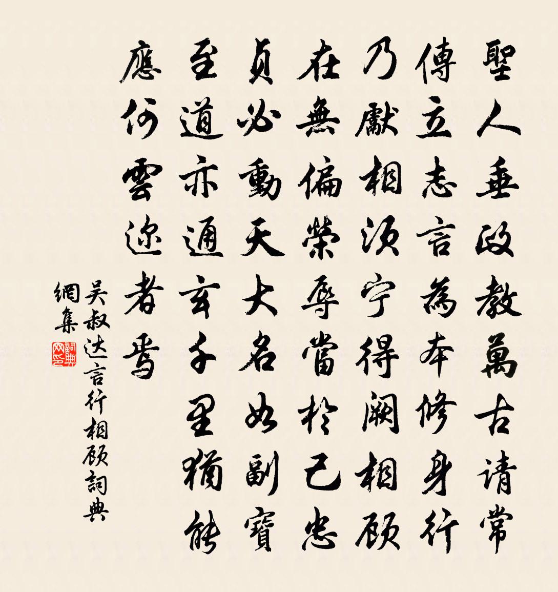 詩詞名句歷史字典書法欣賞書法字典國語詞典說文解字康熙字典古漢語字典標 題 作 者 詩 句 言行相顧作者:吳叔達 朝代:唐代言行相顧原文聖人垂政教,萬古請常傳。立志言為本,修身行乃先。相須寧得闕,相顧在無偏。榮辱當於己,忠貞必動天。大名如副寶,至道亦通玄。千里猶能應,何雲邇者焉。詩詞問答問:言行相顧的作者是誰?答:吳叔達問:言行相顧寫於哪個朝代?答:唐代問:言行相顧是什麼體裁?答:五排吳叔達言行相顧書法欣賞言行相顧書法作品注釋全唐詩:卷781-13詩詞推薦資中八首范祖禹〔宋代〕劍閣橫空鎖蜀門,資中岩岫若雲屯。天傾白日千山底,峽束長江萬里奔。峽州至喜亭范成大〔宋代〕斷崖臥水口,連岡抱城樓。下有吳蜀客,檣竿立滄洲。雨後漲江急,黃濁如潮溝。時見山峽船,鐃鼓譟中流。適從代書答開封府推官姚輔周郎中邵雍〔宋代〕世態其如與願違,必須言進是無知。遍將底事閒思處,不若西街極論時。設有奇才能動世,奈何雙鬢已如絲。天邊長沙呈趙東岩運使並簡幕中楊唯叔通判諸丈戴復古〔宋代〕日莫遠塗行未休,白頭又作長沙游。湘江一點不容俗,嶽麓四時皆是秋。香草汀洲付騷客,紅蓮幕府聚名流。吟邊台灣竹枝詞梁啓超〔清代〕綠陰陰處打檳榔,蘸得蒟醬待勸郎。願郎到口莫嫌澀,箇中甘苦郎細嘗。病中有述二首各五韻陸游〔宋代〕為國恃久安,變起最莫測。釋楚為外懼,此實計之得。吾儕學養生,事事當自克。老無聲色娛,戒懼在飲食。要須會故人集崔侍郎園池強至〔宋代〕貳卿園沼壓關西,上相篇章絕景宜。舊日宮牆流水過,至今苑地畫圖知。孤花春去猶臨岸,野蔓晴來欲占籬。荀令寒食李餘〔唐代〕玉輪江上雨絲絲,公子遊春醉不知。翦渡歸來風正急,水濺鞍帕嫩鵝兒。出鞏縣王安石〔宋代〕昭陵落月煙霧昏,篝火度谷行山根。投鞭委轡涉數村,寤出鞏縣城東門。向來宮闕不可見,但有洛水流渾渾。詠懷王績〔唐代〕故鄉行雲是,虛室坐間同。日落西山暮,方知天下空。金陵夜泊羅隱〔唐代〕冷煙輕淡傍衰叢,此夕秦淮駐斷蓬。棲雁遠驚沽酒火,亂鴉高避落帆風。地銷王氣波聲急,山帶秋陰樹影空。六代紀事二十四首梁啓超〔清代〕珍重千金不字身,完全自主到釵裙。他年世界女權史,應識 * 大有人。聖帝擊壤歌四十聲陳陶〔唐代〕百六承堯緒,艱難土運昌。太虛橫彗孛,中野斗豺狼。帝曰更吾嗣,時哉憶聖唐。英星垂將校,神岳誕忠良。鍊石菩薩蠻周紫芝〔宋代〕風頭不定雲來去。天教月到湖心住。遙夜一襟愁。水風渾似秋。藕花迎露笑。暗水飛螢照。漁笛莫頻吹。客愁人不病中宿宜陽館聞雨李約〔唐代〕難眠夏夜抵秋賒,簾幔深垂窗燭斜。風吹桐竹更無雨,白髮病人心到家。如夢令丘崈〔宋代〕門外綺羅入繡。堂上華燈入晝。領略一番春,共醉連宵歌酒。今後。今後。如此遨頭少有。與夏十二登岳陽樓李白〔唐代〕樓觀岳陽盡,川迥洞庭開。雁引愁心去,山銜好月來。雲間連下榻,天上接行杯。醉後涼風起,吹人舞袖回。晴偏好佚名〔宋代〕平湖百傾生芳草。芙蓉不照紅顛倒。東坡道。波光瀲灩晴偏好。山居雜詩元好問〔金代〕樹合秋生滿,村荒暮景閒。虹收仍白雨,雲動忽青山。秋懷十首汪莘〔宋代〕秋雲無復似春濃,天地何人到此窮。斜日淡煙今古恨,如何都付與孤鴻。名句推薦禁菸不到粵人國,上冢亦攜龐老家。趙鼎《寒食》 苦恨年年壓金線,為他人作嫁衣裳。秦韜玉《貧女》 有孫母未去,出入無完裙。杜甫《石壕吏》 豈知民力艱,顆米皆琳琅。黃燮清《秋日田家雜詠》 天涯失鄉路,江外老華發。李白《江南春懷》 嘴甜心苦,兩面三刀,上頭一臉笑,腳下使絆子,明是一盆火,暗是一把刀。曹雪芹《紅樓夢·第六十五回》 言可省時休便說,步宜留處莫胡行。馮夢龍《醒世恆言·卷十四》 知臣莫若於君,知子莫若於父。魏徵《隋書·帝紀·卷二》 寒隨一夜去,春逐五更來。史青《應詔賦得除夜》 還似舊時游上苑,車如流水馬如龍。李煜《憶江南·多少恨》