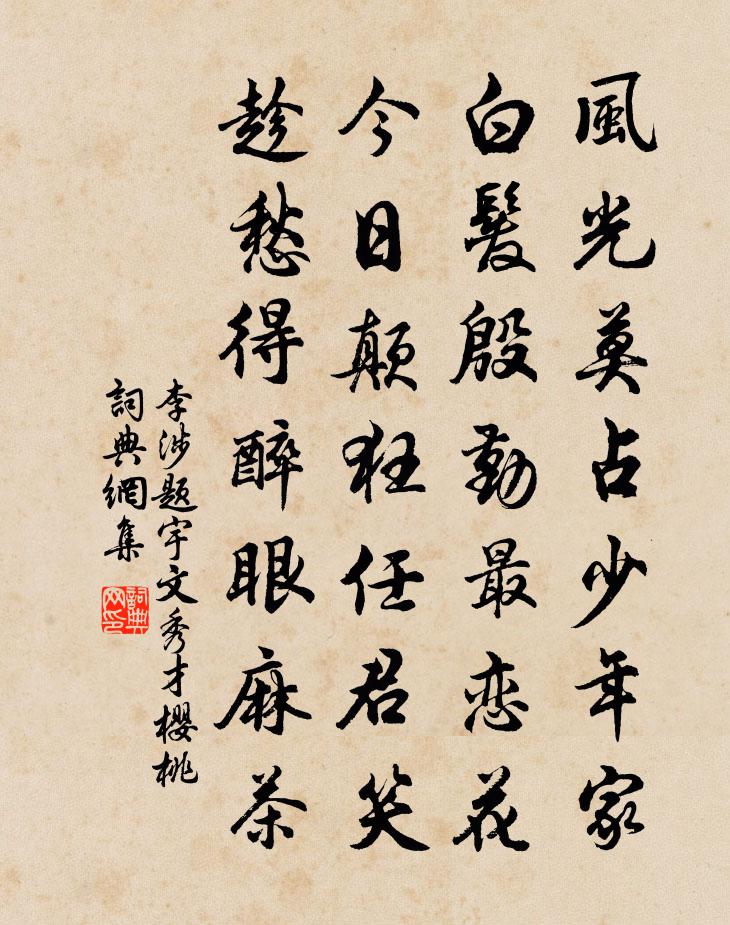 詩詞名句歷史字典書法欣賞書法字典國語詞典說文解字康熙字典古漢語字典標 題 作 者 詩 句 題宇文秀才櫻桃作者:李涉 朝代:唐代題宇文秀才櫻桃原文風光莫占少年家,白髮殷勤最戀花。今日顛狂任君笑,趁愁得醉眼麻茶。詩詞問答問:題宇文秀才櫻桃的作者是誰?答:李涉問:題宇文秀才櫻桃寫於哪個朝代?答:唐代問:題宇文秀才櫻桃是什麼體裁?答:七絕李涉題宇文秀才櫻桃書法欣賞題宇文秀才櫻桃書法作品注釋全唐詩:卷477-69詩詞推薦寓形釋文珦〔宋代〕寓形宇宙間,漢身猶治木。要在直而方,毋使圓且曲。直方固違眾,吾心以為是。圓民雖適時,吾心以為恥。人由句宋太宗〔宋代〕奉使南遊多好景。題朱氏梅芳書院姚勉〔宋代〕玉梅蒼竹擁冰壺,中有揚雄宅一區。地占清虛開境界,人從確實作工夫。窮經得趣床橫易,體道存心壁畫圖。格物無題陳杰〔宋代〕口語甘時心猶異,中邊甜處味方宜。詩情合薦東坡老,慚愧當年蜜荔枝。和蘇侍郎小園夕霽寄諸弟張九齡〔唐代〕清風閶闔至,軒蓋承明歸。雲月愛秋景,林堂開夜扉。何言兼濟日,尚與宴私違。興逐蒹葭變,文因棠棣飛。人倫句史瑜〔唐代〕齋溪從沮水流嶓冢,嶺接青泥入劍天。題汪水雲詩卷羅綺〔宋代〕南越長淮北眺燕,三書上徹九重天。氈寒驢重幽州雪,劍曉龍吟易水煙。齊好無移竽尚在,秦酬有爽璧終全。知音司馬溫公輓詞四首蘇轍〔宋代〕決策傳賢際,危言變法初。紛紛看往事,一一驗遺書。富貴終何有,清貧只自如。西州不忍過,行哭便回車。句陽枋〔宋代〕白雲無心間泫水,清風何意自開花。送范仲訥往合肥三首 其一姜夔〔宋代〕壯志只便鞍馬上,客夢長到江淮間。誰能辛苦運河裡,夜與商人爭往還。再賦簡養正范成大〔宋代〕南北梅枝噤雪寒,玉梨皴雨淚闌乾。一年春色摧殘盡,更覓姚黃魏紫看。聞雁寄故人徐鉉〔唐代〕久作他鄉客,深慚薄宦非。不知雲上雁,何得每年歸。夜靜聲彌怨,天空影更微。往年離別淚,今夕重沾衣。楊梅蘇泂〔宋代〕孫梅過盡官梅在,下番楊梅獨擅場。喚作荔枝元不是,是渠猶著小紅裳。赤壁戴復古〔宋代〕千載周公瑾,如其在目前。英風揮羽扇,烈火破樓船。白鳥滄波上,黃州赤壁邊。長江酹明月,更憶老坡仙。金華聖者贊釋宗杲〔宋代〕金華聖者誰識,撞著豬頭便吃。雖然無愛無憎,其奈有損有益。合得破落僧徒,也道逆行順行天莫測。若無末後一喻子規宗誼〔清代〕舉目無從覓蜀天,只呼歸去乞人憐。倘然當日能歸去,未必褒斜便萬年。楊柳枝侯善淵〔元代〕丱歲飄蓬住遠山。水雲閒。須知千載厭人間。欲回還。換骨脫胎歸舊路,返童顏。步虛升入古仙壇。泛雲鸞。雜詩李復〔宋代〕杯水入滄溟,浩浩通無際。原心方寸間,混合周天地。后稷勤稼穡,顏淵甘簞食。行己在一時,流芳播萬世。至道余與仲退讀書山間壬至子無一日相拾已醜仲退徐瑞〔宋代〕獨聽松風度九夏,兩發無情生二毛。渠儂翰墨流聲遠,老我山林畜眼高。往日歸從不知樂,只今說夢竟徒勞。男兒新陽改故陰紇乾諷〔唐代〕律管才推候,寒郊忽變陰。微和方應節,積慘已辭林。暗覺余澌斷,潛驚麗景侵。禁城佳氣換,北陸翠煙深。有截名句推薦處事最當熟思緩處。熟思則得其情,緩處則得其當。陳繼儒《小窗幽記·集醒篇》 尚憶先朝多樂事,孝皇曾為兩宮開。王守仁《元夕二首》 四海無閒田,農夫猶餓死。李紳《古風二首 / 憫農二首》 塞雁高飛人未還,一簾風月閒。李煜《長相思·一重山》 積土成山,風雨興焉;荀子《勸學》 妾身悔作商人婦,妾命當逢薄倖夫。徐再思《陽春曲·閨怨》 暗相思,無處說,惆悵夜來煙月。韋莊《應天長·別來半歲音書絕》 及茲春未深,數畝猶足佃。王守仁《謫居糧絕請學於農將田南山詠言寄懷》 君子敬其在己者,而不慕其在天者,是以日進也。荀子《荀子·天論》 三十功名塵與土,八千里路雲和月。岳飛《滿江紅·寫懷》