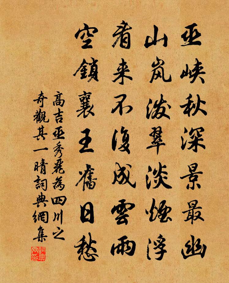 詩詞名句歷史字典書法欣賞書法字典國語詞典說文解字康熙字典古漢語字典標 題 作 者 詩 句 巫秀麗為四川之奇觀其一晴作者:高吉 朝代:宋代巫秀麗為四川之奇觀其一晴原文巫峽秋深景最幽,山嵐潑翠淡煙浮。看來不復成雲雨,空鎖襄王舊日愁。詩詞問答問:巫秀麗為四川之奇觀其一晴的作者是誰?答:高吉問:巫秀麗為四川之奇觀其一晴寫於哪個朝代?答:宋代高吉巫秀麗為四川之奇觀其一晴書法欣賞巫秀麗為四川之奇觀其一晴書法作品詩詞推薦又次韻二首周必大〔宋代〕川流元滾滾,客至喜津津。卜築新形勢,逢迎舊主人。酒杯容我醉,詩句味君醇。大隱聊城市,岩耕笑子真。靜觀堂十偈汪晫〔宋代〕我無官守無言責,自倚欄乾時一拍。只因冷眼看破來,笑殺時人空擘畫。和洪司令梅花吳泳〔宋代〕青蒲翠草望秋零,亂絮迷春困不醒。林下水邊時一見,對人應是眼中青。無題楊冠卿〔宋代〕鶯語丁寧隔曉窗,露翻紅藥斗新妝。玉笙莫作相思調,猶恐春歸得見郎。船過蘇州二首楊萬里〔宋代〕暮風似箭復如刀,落照那能暖客袍。天遠地平城更闊,千尋玉塔尺來高。虎丘新復古石井泉,太守沈虞卿舍人勸農過之范成大〔宋代〕傳聞公作新亭好,先報儂家拄杖知。便擬挈瓶來煮茗,繞闌乾角遍尋詩。蘭陵王(贛上用美成韻)佚名〔宋代〕畫闌直。餖飣千紅萬碧。無端被,怪雨狂風,僽柳僝花禁春色。尋芳遍楚國。誰識。五陵俊客。流水遠,題葉無情宿古峰驛詩四首郭印〔宋代〕故移一榻就高峰,推戶褰帷獵獵風。骨冷神清渾不寐,直疑人犯廣寒宮。贈鷺鷥陳襄〔宋代〕兩個鷺鷥相對立,江邊無物蓼花疏。知君潔白如霜雪,何必臨川更羨魚。排岸判官以荷花為貺書五十六字以謝強至〔宋代〕江國芙蕖夏最繁,臨堤每見尚盤桓。清淮況是稀疏有,江萼爭教取次看。曉艷不隨生意絕,孤根寧減舊時安。主人寄題南昌尉廳思賢亭楊萬里〔宋代〕有客棲霞外,無名涴黨中。南州一高士,東漢獨清風。舊國已禾女,荒阡猶石翁。更煩吹笛魄,端為洗榛叢。又約趙大再游小陽明其山全似峽中點菸一亭可蘇泂〔宋代〕客路心常慰,歸棲氣苦低。經行天柱北,夢想雪峰西。翠壁千岩長,蒼煙半點迷。何當同拄杖,重此聽猿啼。無雜釋妙倫〔宋代〕平常用處黑漫漫,十二時中沒兩般。大小趙州噇飯漢,斧頭返被蛀蟲鑽。戲書宋子才止足堂司馬光〔宋代〕舉世戀榮祿,夜行無乃勞。獨君年未至,止足一何高。矮制烏紗帽,寬裁白氎袍。華榱坐終日,閒按紫檀槽。首夏山中行吟祝允明〔明代〕梅子青,梅子黃,菜肥麥熟養蠶忙。山僧過嶺看茶老,村女當壚煮酒香。梅花陳景沂〔宋代〕行人立馬闖煙梢,為底寒香尚寂寥。是則孤根未回暖,已應春意到溪橋。題趙園二首宗澤〔宋代〕瑤瑛夾侍梅台,琴瑟自鳴松島。山中野服相羊,足以亡憂遣老。鑿池智有泉源,種木胸無芥蒂。螭頭吐水涓涓,端新秋獨夜寄戴叔倫方乾〔唐代〕遙夜獨不臥,寂寥庭戶中。河明五陵上,月滿九門東。萬里親朋散,故園滄海空。歸懷正南望,此夕起秋風。山前王安石〔宋代〕山前溪水漲潺潺,山後雲埋不見山。不趁雨來耕水際,即穿雲去臥山間。謁金門黃機〔宋代〕愁萬疊。春在雨條菸葉。翠袖倚風寒霎霎。傍闌看乳鴨。何處一聲啼鴂。架上荼欲雪。繡被薰香香未歇。可憐音信名句推薦時節是重陽,菊花牽恨長。徐燦《菩薩蠻·秋閨》 論如析薪,貴能破理。劉勰《文心雕龍·論說》 荷花開後西湖好,載酒來時。歐陽修《採桑子·荷花開後西湖好》 慈母手中線,遊子身上衣。孟郊《遊子吟 / 迎母漂上作》 高築牆,廣積糧張廷玉《明史·列傳·卷二十四》 雲鬢花顏金步搖,芙蓉帳暖度春宵。白居易《長恨歌》 玉露凋傷楓樹林,巫山巫峽氣蕭森杜甫《秋興八首·其一》 非信無以使民,非民無以守國。司馬光《資治通鑑·周紀·周紀二》 武皇去金閣,英威長寂寞江淹《銅爵妓》 聖人以智籠群愚,亦猶狙公之以智籠眾狙也。名實不虧,使其喜怒哉。列子及其弟子《列子·黃帝》