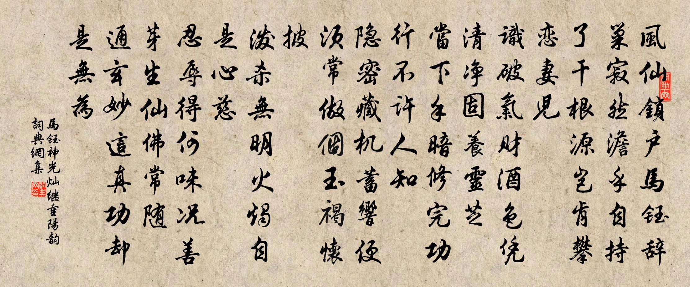 詩詞名句歷史字典書法欣賞書法字典國語詞典說文解字康熙字典古漢語字典標 題 作 者 詩 句 神光燦 繼重陽韻作者:馬鈺 朝代:元代神光燦 繼重陽韻原文風仙鎖戶,馬鈺辭巢,寂然澹乎自持。了乾根源,豈肯攀戀妻兒。識破氣財酒色,憑清淨、固養靈芝。當下手,暗修完功行,不許人知。隱密藏機蓄響,便須常做個玉褐懷披。潑殺無明火燭,自是心慈。忍辱得何味況,善芽生、仙佛常隨。通玄妙,這真功,卻是無為。詩詞問答問:神光燦 繼重陽韻的作者是誰?答:馬鈺問:神光燦 繼重陽韻寫於哪個朝代?答:元代問:神光燦 繼重陽韻是什麼體裁?答:詞馬鈺神光燦 繼重陽韻書法欣賞神光燦 繼重陽韻書法作品詩詞推薦淳熙十六年皇后冊寶十三首佚名〔宋代〕魚軒鼎來,象服是宜。班於內庭,率禮惟祗。化以婦道,時惟母德。是慶是類,於能樂兮。登柳州城樓寄漳汀封連四州柳宗元〔唐代〕城上高樓接大荒,海天愁思正茫茫。驚風亂颭芙蓉水,密雨斜侵薜荔牆。嶺樹重遮千里目,江流曲似九迴腸。共來豫章道中次韻答曾子固王安石〔宋代〕離別何言邂逅同,今知相逐似雲龍。蒼煙白霧千山合,綠樹青天一水容。已謝道塗多自放,將歸田裡更誰從。龐公酴醾李訦〔宋代〕下騰赤蛟身,上抽碧龍頭。千枝蟠一蓋,一蓋簪萬撲。花要帶月看,香要和露收。一點落衣袂,經月氣未休。一點江邊薛濤〔唐代〕西風忽報雁雙雙,人世心形兩自降。不為魚腸有真訣,誰能夜夜立清江。江行無題一百首錢珝〔唐代〕傾酒向漣漪,乘流欲去時。寸心同尺璧,投此報馮夷。江曲全縈楚,雲飛半自秦。峴山回首望,如別故鄉人。浦煙溫陵殘臘書懷寄崔尚書徐夤〔唐代〕濟川無楫擬何為,三傑還從漢祖推。心學庭槐空發火,鬢同門柳即垂絲。中興未遇先懷策,除夜相催也課詩。江上借借不借借釋正覺〔宋代〕識盡甘辛百草頭,鼻無牽纆得優遊。不知有去成知有,始信南泉喚作牛。臨安送鄭左藏陳宓〔宋代〕還家香稻薦新紅,樂歲佳辰定不空。綠醑好邀山月飲,紫鱗長與海朝通。不妨香火尋高士,只恐經綸欠此翁。我亦贈張員外兒杜荀鶴〔唐代〕張公一子才三歲,聞客吟聲便出來。喚物舌頭猶未穩,誦詩心孔迥然開。天生便是成家慶,年長終為間世才。月里虞美人(亭下桃花盛開,作長短句詠之)陳與義〔宋代〕十年花底承朝露。看到江南樹。洛陽城裡又東風。未必桃花得似、舊時紅。胭脂睡起春才好。應恨人空老。心情雖送朱玠戶曹之廣德軍梅堯臣〔宋代〕南方小兒才讀書,往往得官呵路衢。君今五十始作掾,手板青袍非壯圖。況來桐汭水上城,折腰強顏休嘆吁。城西同韋舍人早朝鄭愔〔唐代〕瑞闕龍居峻,宸庭鳳掖深。才良寄天綍,趨拜侶朝簪。飛馬看來影,喧車識駐音。重軒輕霧入,洞戶落花侵。聞有聞逆虜近淮曹勛〔宋代〕壬午收亨運,余屯未肯林。風煙淮水近,天地老身愁。虜意驕如昨,江乾景易秋。得閒如自若,心在一扁舟。仙塘茅舍利登〔宋代〕莫言賓客少,幽僻長莓苔。也有樵人到,唯無詩士來。山風花落盡,溪雨燕飛回。又覺年光暮,庭陰滿綠槐。題金陵雜興詩後十八首李璉〔宋代〕池邊石是南朝石,綠梁苔花亦可憐。今日波平人事變,白魚猶自躍天泉。宣城花蘇為〔宋代〕宣城花疊嶂,樓前族綺霞。若非翠露陶潛柳,即是紅藏小謝家。深樹見一顆櫻桃尚在李商隱〔唐代〕高桃留晚實,尋得小庭南。矮墮綠雲髻,欹危紅玉簪。惜堪充鳳食,痛已被鶯含。越鳥夸香荔,齊名亦未甘。諷諫詩韋孟〔兩漢〕肅肅我祖,國自豕韋,黼衣朱紱,四牡龍旂。彤弓斯征,撫寧遐荒,總齊群邦,以翼大商,迭披大彭,勳績惟光。次韻知常德袁尊固監丞送別四詩魏了翁〔宋代〕別來歲月爾滔滔,流落天涯忽此遭。萬木辭榮秋意澹,百川歸壑岸容高。笑看海上兩蝸角,閒禿山中千兔毫。若向名句推薦命室攜童弱,良日登遠遊陶淵明《酬劉柴桑》 山上層層桃李花,雲間煙火是人家。劉禹錫《竹枝詞九首·其九》 江海不擇小助,故能成其富。韓非及後人《韓非子·大體》 最愛湖東行不足,綠楊陰裏白沙堤。白居易《錢塘湖春行》 孤眠鸞帳里,枉勞魂夢,夜夜飛揚。佚名《鳳歸雲·閨怨》 葉落根偏固,心虛節更高。憨山德清《詠竹五首》 棘枝風哭酸,桐葉霜顏高。孟郊《秋懷十五首》 滿目山河空念遠,落花風雨更傷春,不如憐取眼前人。晏殊《浣溪沙·一向年光有限身》 同天下之利者,則得天下;擅天下之利者,則失天下。姜子牙《六韜·文韜·文師》 無可奈何花落去,似曾相識燕歸來。晏殊《浣溪沙·一曲新詞酒一杯》