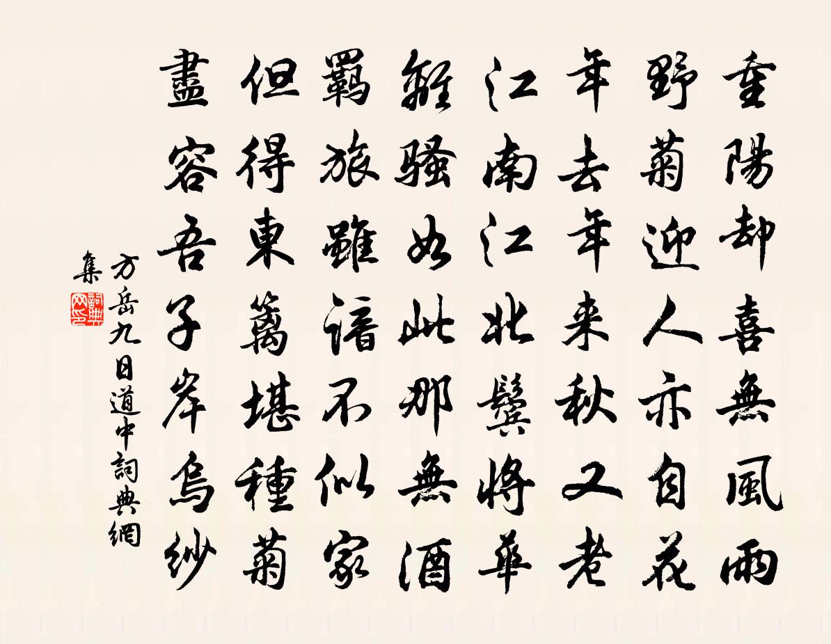 詩詞名句歷史字典書法欣賞書法字典國語詞典說文解字康熙字典古漢語字典標 題 作 者 詩 句 九日道中作者:方岳 朝代:宋代九日道中原文重陽卻喜無風雨,野菊迎人亦自花。年去年來秋又老,江南江北鬢將華。離騷如此那無酒,羈旅雖諳不似家。但得東籬堪種菊,盡容吾子岸烏紗。詩詞問答問:九日道中的作者是誰?答:方岳問:九日道中寫於哪個朝代?答:宋代方岳九日道中書法欣賞九日道中書法作品詩詞推薦挈累來當塗聞已入境感懷有作二首吳芾〔宋代〕鷗鷺相疏雁鶩親,簿書叢里度光陰。塵埃已覺胸中滿,霜雪還從鬢上侵。盡室修途方在念,連宵苦雨若為心。明朝崇恩顯義院五首宋高宗〔宋代〕都城日落馬蕭蕭,雨壓春風暗柳條。天際歸艎那可望,只將心寄海門潮。池塘晚景李群玉〔唐代〕風荷珠露傾,驚起睡??。月落池塘靜,金刀剪一聲。九月二十六日觀水杜范〔宋代〕滔滔隨岫遠,{氵亹}{氵亹}浸沙寒。萬古去不極,幾人來此看。放乎知有本,逝者若為難。瞪目斜陽里,雙鷗易從上人山亭林逋〔宋代〕湖水江灣隔數峰,籬門和竹夾西東。閒來此地行無厭,又共吾廬看不同。靈隱路歸秋色里,招賢庵在鳥行中。屏風黃兵部生辰仲並〔宋代〕早歲蜚聲應宿郎,至今雞舌尚含香。未應駟馬夸流俗,只為慈親樂故鄉。送邵彥瞻通判濠州孔武仲〔宋代〕民情極簡易,關決未應勞。佳句寧我知,為君屈揮毫。冬至後三日三首張耒〔宋代〕寒暑添線衲,朝晡折足鐺。何勞問榮辱,便是了平生。理自陰陽運,吾寧口舌爭。深居玩吾寶,不遺世人輕。讀永叔集古錄目梅堯臣〔宋代〕古史書不足,磨璞鐫美辭。周宣石鼓文已缺,秦政嶧山字苦隳。西漢都無半畫在,黃初而上猶得窺。下及隋唐莫可贈安成詩謝靈運〔南北朝〕昔在先道。垂誥亨鮮。亦曰於豹。調和韋弦。清靜有默。平正無偏。欽隆令績。慰沃願言。中秋月蝕邦人鳴鉦救月不約而齊中原舊俗猶有家鉉翁〔宋代〕風掃沈陰萬象開,斷雲扶月出陽台。萬人拭目看天眼,蟇蝕何曾蝕得來。戊寅人日黎廷瑞〔宋代〕滿飲東風酒,悠悠自醉眠。英雄悲往運,兒女樂新年。楊柳嬌無賴,梅花老更妍。半窗晴日晚,欹枕聽春鳶。讀趙張嵲〔宋代〕合德來嬪帝甚歡,溫柔鄉里勝求仙。武皇雖被白雲誤,猶得垂衣到暮年。送孫從之司業持節湖南二首楊萬里〔宋代〕金家先遯卻誰知,匹馬西歸也大奇。出盡莫嫌三宿戀,壞麻不待七年遲。風生折檻人無古,水遶圜橋士有師。六一詠史左思〔魏晉〕皓天舒白日,靈景耀神州。列宅紫宮裡,飛宇若雲浮。峨峨高門內,藹藹皆王侯。自非攀龍客,何為欻來游。被褐題羅浮石(刻於石上)李德裕〔唐代〕清景持芳菊,涼天倚茂松。名山何必去,此地有群峰。和遁澤惠豆粟韻王柏〔宋代〕秋深萬物盡歸根,五穀從來不解分。以長而食了無事,南山有種何曾勤。遁澤真情在句中,薄俗三嘆曹劉風。識得春村白居易〔唐代〕二月村園暖,桑間戴勝飛。農夫舂舊谷,蠶妾禱新衣。牛馬因風遠,雞豚過社稀。黃昏林下路,鼓笛賽神歸。小舟晚興四首楊萬里〔宋代〕潮痕初落水猶肥,雨點才來已復微。半濕岸沙危欲落,牽船稚子去如飛。蛩李中〔唐代〕月冷莎庭夜已深,百蟲聲外有清音。詩情正苦無眠處,愧爾階前相伴吟。名句推薦花自飄零水自流。一種相思,兩處閒愁。李清照《一剪梅·紅藕香殘玉簟秋》 春日宴,綠酒一杯歌一遍。馮延巳《長命女·春日宴》 未必素娥無悵恨,玉蟾清冷桂花孤。晏殊《中秋月》 仁者之為天下度也,辟之無以異乎孝子之為親度也。墨子《墨子·22章 節用(下)》 君子不以言舉人,不以人廢言。孔子弟子《論語·衛靈公篇》 何時更杯酒,再得論心胸。李白《魏郡別蘇明府因北游》 妙年出補父兄處,公自才力應時須黃庭堅《送范德孺知慶州》 松竹含新秋,軒窗有餘清。崔元翰《奉和聖制中元日題奉敬寺》 獨行獨坐,獨唱獨酬還獨臥。朱淑真《減字木蘭花·春怨》 以其行理也。行理性於染當。墨子《墨子·03章 所染》