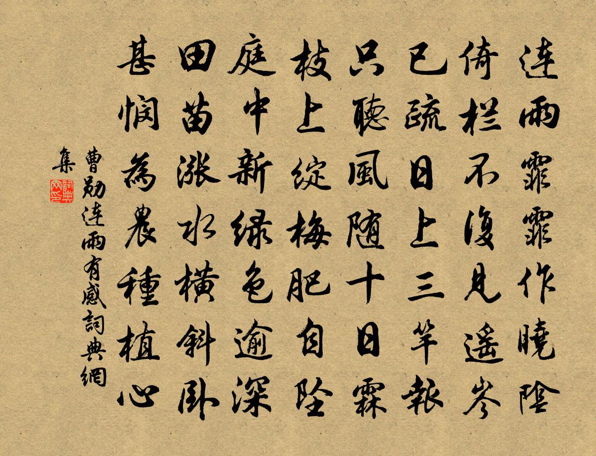 詩詞名句歷史字典書法欣賞書法字典國語詞典說文解字康熙字典古漢語字典標 題 作 者 詩 句 連雨有感作者:曹勛 朝代:宋代連雨有感原文連雨霏霏作曉陰,倚欄不復見遙岑。已疏日上三竿報,只聽風隨十日霖。枝上綻梅肥自墜,庭中新綠色逾深。田苗漲水橫斜臥,甚憫為農種植心。詩詞問答問:連雨有感的作者是誰?答:曹勛問:連雨有感寫於哪個朝代?答:宋代曹勛連雨有感書法欣賞連雨有感書法作品詩詞推薦花犯陳允平〔宋代〕報南枝、東風試暖,蕭蕭甚情味。亂瓊雕綴。幻姑 * 神,玉蕊佳麗。壽陽宴罷妝檯倚。眉顰羞鵲喜。念誤卻、何富水驛東楹有人題詩(筆跡柔媚,出自纖指)吳融〔唐代〕繡纓霞翼兩鴛鴦,金島銀川是故鄉。只合雙飛便雙死,豈悲相失與相忘。煙花夜泊紅蕖膩,蘭渚春遊碧草芳。何事燭影搖紅(盱江有懷)趙善扛〔宋代〕桃李牆頭,向人都似他年意。舞絲千丈颺晴光,駘青春無際。花氣薰人自醉。傍垂楊、行行緩轡。倦遊無奈,回首四十自詠魏野〔宋代〕閒心雖不動,記性覺潛衰。棋退難饒客,琴生卻問兒。手慵農器信,身散道裝知。筆硯將何用,除因改舊詩。和前三篇蘇頌〔宋代〕孟郊篇什況鹹池,夫子文章我所知。豈特曹劉同品目,固將蘇李是宗師。語如轉彈逢真賞,喻到鏖兵詫國棋。所集月徐夤〔唐代〕碧落誰分造化權,結霜凝雪作嬋娟。寒蟬若不開三穴,狡兔何從上九天。莫見團圓明處遠,須看灣曲鑒時偏。郄詵題三月梅花捲黃庚〔宋代〕紛紛姚魏家,顏色競嫵媚。人方眩春華,樂皇出古意。素花飾鼎實。縞袂立蒼翠。猶如喧啾中,孤鳳忽呈端。巋然剪刀徐夤〔唐代〕寶持多用繡為囊,雙日交加兩鬢霜。金匣掠平花翡翠,綠窗裁破錦鴛鴦。初栽連理枝猶短,誤綰同心帶不長。欲制東堂初寒創意作竹屏障門屏腳偶得朽梅枝截用張耒〔宋代〕丈室新屏用此君,碧琅玕插古槎根。白雲一片當空下,護此寒堂宴坐人。挽族父承務郎衡之三首陳著〔宋代〕人物瑞丹霞,翛然絕點瑕。寬心無厭客,急義不謀家。一室琴棋畫,四時風月花。晚來滿山菊,消得澹生涯。雜曲歌辭升天行僧齊己〔唐代〕身不沉,骨不重。驅青鸞,駕白鳳。幢蓋飄飄入冷空,天風瑟瑟星河動。瑤闕參差阿母家,樓台戲閉凝彤霞。五三愛玉女洞中水,既致兩瓶,恐後復取而為使者蘇軾〔宋代〕欺謾久成俗,關市有契繻。誰知南山下,取水亦置符。古人辨淄澠,皎若鶴與鳧。吾今既謝此,但視符有無。常恐送李處士南歸鄭獬〔宋代〕駕車跨馬聲嘈嘈,長劍闊佩橫滿朝。塵埃走趨顏發老,先生久客得無勞。夜來氣味有秋色,歸心鬧與秋風高。揭竿偈傾一百六十九首釋智朋〔宋代〕雪山六載自欺瞞,耿耿明星碧漢間。開眼更無迴避處,普天匝地黑漫漫。古今日月,古今星辰。若教頻下淚,滄海九日陪舊參政蔡侍郎宴潁州西湖祖無擇〔宋代〕秋晚西湖勝概多,台軒來此駐鳴珂。沙鷗散去驚絲竹,煙柳低垂間綺羅。亂擲金錢和露菊,狂搖鈿扇倚風荷。下僚平韻滿江紅(牡丹)彭元遜〔宋代〕翠袖余寒,早添得、銖衣幾重。保須怪、妍華都謝,更為誰容。銜盡吳花成鹿苑,人間不恨雨和風。便一枝、流落中秋陳藻〔宋代〕詩書讀罷問耕牛,等得時來死便休。一帶空村無潤屋,聊因社肉作中秋。到石樑觀瀑布袁枚〔清代〕天風肅肅衣裳飄,人聲漸小灘聲驕。知是天台古石橋。一龍獨跨山之凹,高聳脊背橫伸腰,其下嵌空走怒濤。濤水次韻堅大師陶夢桂〔宋代〕明時有分坐空山,終日心游天壤間。無欲始安貧里樂,是人只得睡時閒。離家便憶居家好,論事那知任事難。自快謁雙廟梅堯臣〔宋代〕八月過宋都,泊舟雙廟側。永懷此忠良,遺烈傳碑刻。五位儼朝裾,千年同血食。當時多苟生,貴爵曾誰識。縱今名句推薦布衣菜飯,可樂終身沈復《浮生六記·閨房記樂》 夫兵權者,是三軍之司命,主將之威勢。諸葛亮《將苑·卷一·兵權》 自笑堂堂漢使,得似洋洋河水,依舊只流東陳亮《水調歌頭·送章德茂大卿使虜》 雪粉華,舞梨花,再不見煙村四五家。關漢卿《大德歌·冬景》 聚如丘山,散如風雨,迅如雷電,捷如鷹鶻宋濂、王褘《元史·列傳·卷四十四》 見說馬家滴粉好,試燈風裡賣元宵。符曾《上元竹枝詞》 出其東門,有女如雲。佚名《出其東門》 客里相逢,籬角黃昏,無言自倚修竹。姜夔《暗香疏影》 星漢燦爛,若出其里。曹操《觀滄海 / 碣石篇》 繞池閒步看魚游,正值兒童弄釣舟。白居易《觀游魚》