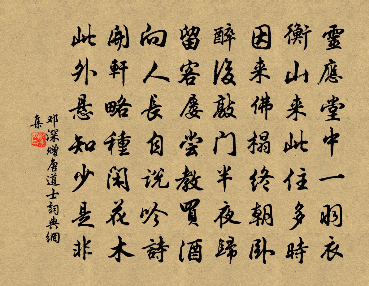 詩詞名句歷史字典書法欣賞書法字典國語詞典說文解字康熙字典古漢語字典標 題 作 者 詩 句 贈唐道士作者:鄧深 朝代:宋代贈唐道士原文靈應堂中一羽衣,衡山來此住多時,因來佛榻終朝臥,醉後敲門半夜歸。留客屢嘗教買酒,向人長自說吟詩。開軒略種閒花木,此外懸知少是非。詩詞問答問:贈唐道士的作者是誰?答:鄧深問:贈唐道士寫於哪個朝代?答:宋代鄧深贈唐道士書法欣賞贈唐道士書法作品詩詞推薦次韻斯遠見過三首趙蕃〔宋代〕語到蟬連自不休,吾曹豈亦固相求。望窮雲谷雲深處,共約驂羸向晚秋。歸途次韻黃彥平〔宋代〕霏戲點點胭脂雨,唾碧濺濺罨畫溪。送客歸來問山館,一聲啼鳥日平西。偈二首安分庵主〔宋代〕十五日已前,天上有星皆拱北。十五日已後,人間無水不朝東。已前已後總拈卻,到處鄉談各不同。人日重宴大明宮恩賜彩縷人勝應制鄭愔〔唐代〕瓊殿含光映早輪,玉鸞嚴蹕望初晨。池開凍水仙宮麗,樹發寒花禁苑新。佳氣裴回籠細網,殘霙淅瀝染輕塵。良時小飲劉克莊〔宋代〕暮年衰老讀書慵,惟有杯中興尚濃。枕菊惰人真遠祖,看花頗子亦同宗。鮆魚蝦{左魚右差}何虧汝,螺蠃螟蛉妄對菊圖唐寅〔明代〕天上秋風發,岩前菊蕊黃。主人持酒看,漫飲吸清香。寄曹都護釋重顯〔宋代〕故國休言萬里程,為官為釋且分明。道存不必曾傾蓋,俱有清風匝地生。贊崇禧丈室二仙圖張榘〔宋代〕鹿皮槲葉,容顏枯槁。於巾白袍,飄然氣貌。不同者形,所同者道。金丹一丸,天地同老。又次銛朴翁韻四首陳造〔宋代〕聞為詩魔掩貝多,辭源袞袞倒洪河。遙知傳誦日千紙,淇上高唐無善歌。送劉秀才歸河內歐陽修〔宋代〕落日古京門,車馬動行色。河上多悲風,山陽有歸客。朽篋蠹蟲篆,遺文摹鳥跡。言乾有司知,豈顧時人識。山陂東風第一枝 春來兼旬,寒氣不減。舊臘正月邵亨貞〔元代〕* 南金偶道及前作,欠然命筆次韻,故又口占為謝亂雨敲花,深鐙暈壁,孤屏相對吟影。醉余夢蝶難尋,起來睡嘲壟彥和鄒浩〔宋代〕衣領從教虱子緣,夜深拜得蓆兒穿。道鄉活計君知否,飢即須餐困即眠。巫山一段雲 棲鳳峰趙孟頫〔元代〕芍藥虛投贈,丁香漫結愁。鳳棲鸞去兩悠悠。新恨怯逢秋。山色驚心碧,江聲入夢流。何時弦管簇歸舟。蘭棹泊沙自合浦還清湘寄虛中弟陳瓘〔宋代〕曾近滄溟看颶風,波濤有盡海無窮。四年陳跡今何在,坐對湘雲豁晚空。中興寺瓊翠閣次喬夢符韻葛洪〔宋代〕蘭若憑高處,風虛閣自涼。川林輸望迥,日月對閒長。灑落幽人暇,賓士俗累忙。何時足生理,卜築並山陽。桐柏台夜作高似孫〔宋代〕東崖紫雲飛,西壁白雪炯。洞口一何邃,人閒無此靜。松風翻瀑怒,梅月逼鶴警。苔污斷闕石,茶注彭亨鼎。丈人自桃川至辰州絕句四十有二趙蕃〔宋代〕大麥雖黃草與長,趁春只用野生桑。為生可嘆微如是,應坐人稀地力荒。送友人如邊賈島〔唐代〕去日重陽後,前程菊正芳。行車輾秋岳,落葉墜寒霜。雲入漢天白,風高磧色黃。蒲輪待恐晚,求薦向諸方。贈宣大師李益〔唐代〕一國沙彌獨解詩,人人道勝惠林師。先皇詔下征還日,今上龍飛入內時。看月憶來松寺宿,尋花思作杏溪期。因論三峰王耿殿丞將移陝下通理先已同袁刑部以唱魏野〔宋代〕蜀出多才信不虛,淹翔猶未佩銀符。民間惠愛應長有,馬上歌詩豈暫無。休話卜鄰來草澤,即看得路去蓬壺。申湖名句推薦慘慘時節盡,蘭葉復凋零。徐幹《室思》 一人興善,萬人可激宋濂、王褘《元史·列傳·卷五十六》 奢侈者鮮有不敗李大師、李延壽《南史·列傳·卷四十五》 艷歌餘響,繞雲縈水蘇軾《水龍吟·黃州夢過棲霞樓》 男兒不展風雲志,空負天生八尺軀。馮夢龍《警世通言·卷四十》 泠泠七弦上,靜聽松風寒。劉長卿《聽彈琴》 仁不異遠,義不辭難班固《漢書·紀·武帝紀》 羈心積秋晨,晨積展游眺。謝靈運《七里瀨》 釣罷歸來不繫船,江村月落正堪眠。司空曙《江村即事》 講大經綸,只是實實落落;有真學問,決不怪怪奇奇。王永彬《圍爐夜話·第三一則》