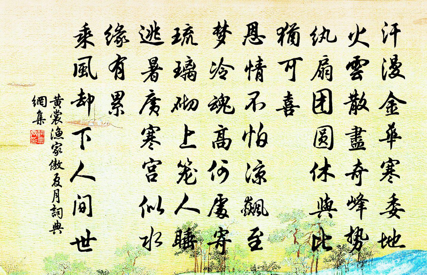 詩詞名句歷史字典書法欣賞書法字典國語詞典說文解字康熙字典古漢語字典標 題 作 者 詩 句 漁家傲(夏月)作者:黃裳 朝代:宋代漁家傲(夏月)原文汗漫金華寒委地。火雲散盡奇峰勢。紈扇團圓休與比。猶可喜。恩情不怕涼飆至。夢冷魂高何處寄。琉璃砌上籠人睡。逃暑廣寒宮似水。緣有累。乘風卻下人間世。詩詞問答問:漁家傲(夏月)的作者是誰?答:黃裳問:漁家傲(夏月)寫於哪個朝代?答:宋代問:漁家傲(夏月)是什麼體裁?答:詞黃裳漁家傲(夏月)書法欣賞漁家傲(夏月)書法作品詩詞推薦次韻子瞻記歲莫鄉俗三首其一饋歲蘇轍〔宋代〕周公制鄉禮,無有相通佐。鼎肉送子思,烝豚出陽貨。交親隨高低,豈問小與大。自從此禮衰,伏臘有飢臥。鄉人孤山寒食趙師秀〔宋代〕二月芳菲在水邊,旅人消困亦隨緣。晴舒蝶翅初勻粉,雨壓楊花未放綿。有句自題閒處壁,無錢難買貴時船。最憐望江南張繼先〔宋代〕西源好,雨霽斂紅紗。碧水靜搖招釣叟,綠苔寒迫起漁家。攜駕會春茶。風浩浩,錦蔭石屏華。濯鼎上方敲翠竹,古石硯李山甫〔唐代〕追琢他山石,方圓一勺深。抱真唯守墨,求用每虛心。波浪因文起,塵埃為廢侵。憑君更研究,何啻直千金。賢者之孝二百四十首謝{嚼口換日}林同〔宋代〕一家感兒孝,不俗使親驚。盡作屏氣語,鹹為納屢行。龍潭方丈樓鑰〔宋代〕又因寒食此中來,窗戶虛明絕點埃。山里春風無閒斷,海棠開過地棠開。次韻陳文仲探梅二絕葛立方〔宋代〕小園邈在古城陰,為愛寒葩杖履尋。卻笑含章檐下客,對花熟睡亦何心。滿庭芳秦觀〔宋代〕北苑研膏,方圭圓璧,名動萬里京關。碎身粉骨,功合上凌煙。尊俎風流戰勝,降春睡、開拓愁邊。纖纖捧,香泉竹枝歌孫嵩〔宋代〕光浪砰雷蛇飲溪,陰崖天暗虎丘泥。萬里中原那有此,憐君更過鬼門西。季夏郊墅即事程公許〔宋代〕事業悠悠雪滿頭,流光那會與人謀。作勞輸與田間叟,紫芋黃雞滿意秋。入梅周南〔宋代〕地濕衣生醭,天涼葛未裁。暴暄偏壞藥,微灑似成梅。苦筍相將盡,良朋久不來。若無書作伴,那得好懷開。雁和韋侍御薛能〔唐代〕肅肅雍雍義有餘,九天鶯鳳莫相疏。唯應靜向山窗過,激發英雄夜讀書。春日山中感懷強至〔宋代〕春中酣酣破宿霾,春心袞袞瀉長淮。無情草樹相看久,得意親朋一笑乖。世俗冰霜誰暖眼,古人金石已枯骸。愁來止宿寮趙蕃〔宋代〕雖雲居異方,政自生同宇。不但擷園蔬,仍須催釀黍。用韻簡黃元輔二首王邁〔宋代〕不愛螭頭一點青,片言檢鑒拂衣行。但憂負我平生學,豈願爭渠堅子名。天駿出閒駑飽秣,國蘭卻佩艾敷榮。想君句范元作〔宋代〕山連巫峽幾千里,水闊沅湘三四州。巴東西仇遠〔宋代〕巴東有杜鵑,杜鵑啼春花正妍。巴西有杜鵑,杜鵑啼血花可憐。巴東巴西久為客,目斷江南歸未得,月明滿地山花浪淘沙周密〔宋代〕芳草碧茸茸。染恨無窮。一春心事雨聲中。窄索宮羅寒尚峭,閒倚熏籠。猶記粉闌東。同醉香叢。金鞍何處驟驊驄湘漢旅懷翁傑周賀〔唐代〕一宿空江聽急流,仍同賈客坐歸舟。遠書來隔巴陵雨,衰鬢去經彭蠡秋。不擬為身謀舊業,終期斷谷隱高丘。吾宗寄畫松僧王建〔唐代〕天香寺里古松僧,不畫枯松落石層。最愛臨江兩三樹,水禽棲處解無藤。名句推薦一曲新詞酒一杯,去年天氣舊亭台。晏殊《浣溪沙·一曲新詞酒一杯》 黃雲連白草,萬里有無間。王鎡《塞上曲》 記得別伊時,桃花柳萬絲。納蘭性德《菩薩蠻·新寒中酒敲窗雨》 孤舟向廣武,一鳥歸成皋。岑參《鞏北秋興寄崔明允》 節用儲蓄,以備凶災范曄《後漢書·本紀·肅宗孝章帝紀》 青山飛起不壓物,野水流來欲濕人牛殳《琵琶行》 君子養心莫善於誠荀子《荀子·不苟》 舉頭紅日白雲低,四海五湖皆一望。唐寅《伯虎扮乞兒,作詩騙酒》 還始覺、留情緣眼,寬頻因春。吳文英《渡江雲三犯·西湖清明》 世人解聽不解賞,長飆風中自來往。李頎《聽安萬善吹觱篥歌》