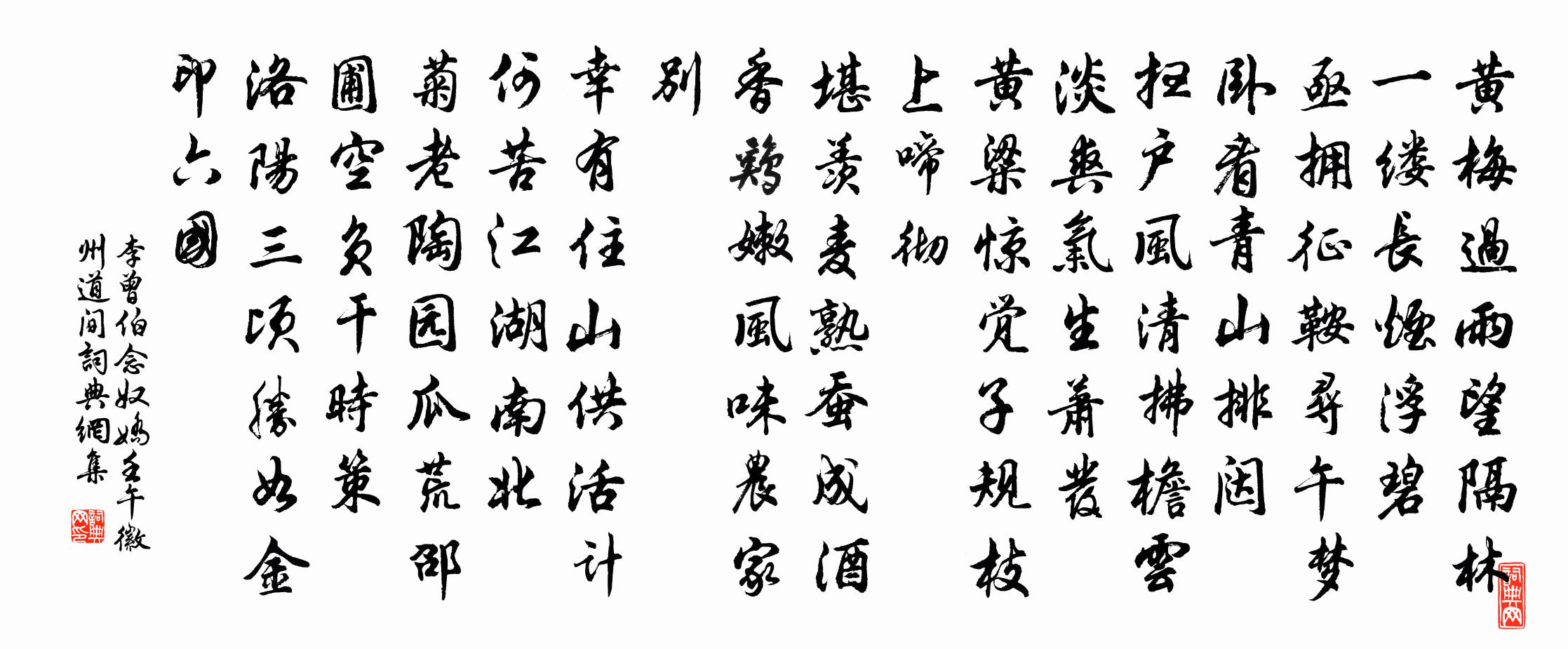 詩詞名句歷史字典書法欣賞書法字典國語詞典說文解字康熙字典古漢語字典標 題 作 者 詩 句 念奴嬌(壬午徽州道間)作者:李曾伯 朝代:宋代念奴嬌(壬午徽州道間)原文黃梅過雨,望隔林、一縷長煙浮碧。亟擁征鞍尋午夢,臥看青山排闥。掃戶風清,拂檐雲淡,爽氣生蕭發。黃粱驚覺,子規枝上啼徹。堪羨麥熟蠶成,酒香雞嫩,風味農家別。幸有住山供活計,何苦江湖南北。菊老陶園,瓜荒邵圃,空負乾時策。洛陽三頃,勝如金印六國。詩詞問答問:念奴嬌(壬午徽州道間)的作者是誰?答:李曾伯問:念奴嬌(壬午徽州道間)寫於哪個朝代?答:宋代問:念奴嬌(壬午徽州道間)是什麼體裁?答:詞李曾伯念奴嬌(壬午徽州道間)書法欣賞念奴嬌(壬午徽州道間)書法作品詩詞推薦陸嚴州赴召喜成三詩張鎡〔宋代〕精舍欣聞已解驂,風檣不易到汗乾。一緘試讀幽人語,莫作時情賀禮看。貽釣魚李處士譚用之〔唐代〕罷吟鸚鵡草芊芊,又泛鴛鴦水上天。一棹冷涵楊柳雨,片帆香掛芰荷煙。綠搖江澹萍離岸,紅點雲疏橘滿川。何處雜歌謠辭。李夫人歌李商隱〔唐代〕一帶不結心,兩股方安髻。慚愧白茅人,月沒教星替。剩結茱萸枝,多擘秋蓮的。獨自有波光,彩囊盛不得。蠻絲見蕭侍御憶舊山草堂詩,因以繼和白居易〔唐代〕琢玉以為架,綴珠以為籠。玉架絆野鶴,珠籠鎖冥鴻。鴻思雲外天,鶴憶松上風。珠玉信為美,鳥不戀其中。台中上疏齋慮按察楊公遠〔宋代〕歙境爭先睹使星,玉川風致是前生。壯懷學富五千卷,明月光分十一城。吏立寒冰驚號令,民沾和氣樂耘耕。政聲偈頌七十八首釋正覺〔宋代〕衲僧須瀝髑髏乾,透出威音世外看。歲月不能遷變處,個人肯共你同盤。仙人李賀〔唐代〕彈琴石壁上,翻翻一仙人。手持白鸞尾,夜掃南山雲。鹿飲寒澗下,魚歸清海濱。當時漢武帝,書報桃花春。再次前韻六首張嵲〔宋代〕齋國饋時堪出走,東山攜處未生憎。道人莫謂全無念,行樂須知此日曾。送將官梁左藏赴莫州蘇軾〔宋代〕燕南垂,趙北際,其間不合大如礪。至今父老哀公孫,烝土為城鐵作門。城中積穀三百萬,猛士如雲驕不戰。一朝讀董卓傳吳龍翰〔宋代〕巨妖吐毒氣如蒸,誰遣腥膻漢帝陵。煙斷洛陽殘火在,為他吹著點臍燈。雜詠園中果子陸游〔宋代〕山杏溪桃本看花,累累成實亦堪夸。鹽收蜜漬饒風味,送與山僧下夜茶。黃山席上別當塗僚友賀鑄〔宋代〕自昔有宇宙,便應有此山。如我與君者,幾輩來躋攀。聲跡兩磨滅,寥寥千古間。短生一浮漚,妄比金石頑。五福贈別河南李功曹(宏辭登科拜官)韋應物〔唐代〕耿耿抱私戚,寥寥獨掩扉。臨觴自不飲,況與故人違。故人方琢磨,瑰朗代所稀。憲禮更右職,文翰灑天機。聿來皇帝合春帖子周南〔宋代〕萬里長城漢有人,羽書漸少捷書頻。君王軫念春寒重,更解貂裘賜將臣。小曲新詞二首白居易〔唐代〕霽色鮮宮殿,秋聲脆管弦。聖明千歲樂,歲歲似今年。紅裾明月夜,碧簟早秋時。好向昭陽宿,天涼玉漏遲。誡言權德輿〔唐代〕言之或未行,前哲所不取。方寸雖浩然,因之三緘口。夜坐楊萬里〔宋代〕欲雪天還惜,不風寒自生。燈搖無定影,火作始然聲。又遣庭闈訊,懸知骨肉情。履端猶幾日,有夢未歸程。楊秘書新居賈島〔唐代〕城角新居鄰靜寺,時從新閣上經樓。南山泉入宮中去,先向詩人門外流。寄中條道者貫休〔唐代〕柏梯杉影里,頭白藥山孫。今古管不得,是非爭肯論。虎鬚懸瀑滴,禪衲帶苔痕。常恨龍鍾也,無因接話言。宋初祀神州地祗三首佚名〔宋代〕獻奠雲畢,純嘏祁祁。威靈藏用,邈矣何之。名句推薦荷葉出地尋丈,因列坐其下,上不見日。姜夔《念奴嬌·鬧紅一舸》 峨嵋山下少人行,旌旗無光日色薄。白居易《長恨歌》 向淺洲遠渚,亭亭清絕。張炎《疏影·詠荷葉》 潦倒不通世務,愚頑怕讀文章。曹雪芹《紅樓夢·第三回》 明犯強漢者,雖遠必誅。班固《漢書·傳·傅常鄭甘陳段傳》 苕之華,其葉青青。佚名《苕之華》 一別家山音信杳,百種相思,腸斷何時了。施耐庵《蝶戀花·一別家山音信杳》 昔去雪如花,今來花似雪。范雲《別詩》 故百工從事,皆有法所度。今大者治天下,其次治大國,而無法所度,此不若百工辯也。墨子《墨子·04章 法儀》 拜華星之墜幾,約明月之浮槎。文天祥《回董提舉中秋請宴啟》