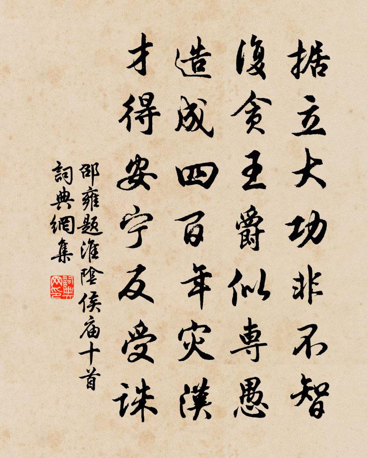 詩詞名句歷史字典書法欣賞書法字典國語詞典說文解字康熙字典古漢語字典標 題 作 者 詩 句 題淮陰侯廟十首作者:邵雍 朝代:宋代題淮陰侯廟十首原文據立大功非不智,復貪王爵似專愚。造成四百年災漢,才得安寧反受誅。詩詞問答問:題淮陰侯廟十首的作者是誰?答:邵雍問:題淮陰侯廟十首寫於哪個朝代?答:宋代邵雍題淮陰侯廟十首書法欣賞題淮陰侯廟十首書法作品詩詞推薦哭周晉仙劉克莊〔宋代〕君在詩人里,功夫用最深。古如神禹鑄,清似鬼仙吟。死定無高塚,生惟有破衾。長安酒樓上,猶記昔相尋。奉留楚金長老黃庭堅〔宋代〕長安甚鬧不須驚,好與牛兒著鼻繩。方便把他悲願滿,斬新然佛大明燈。皇帝冬至御大慶殿舉第一盞酒三慶雲之曲王珪〔唐代〕乾坤順夷,皇有嘉德。爰施慶雲,承日五色。輪囷下垂,萬物皆飾,維天祚休,長被無極。和王仲儀楸花十二韻梅堯臣〔宋代〕春陽發草木,美好一同時。桃李雜山櫻,紅白開繁枝。楸英獨步媚,淡紫相參差。大葉與勁乾,簇萼密自宜。圖出別留少策兼呈玉黨先生陳元晉〔宋代〕四海弟兄能有幾,平生臭味許誰同。遙知夜雨連天際,應說南中有客窮。古鑒鮑溶〔唐代〕古鑒含靈氣象和,蛟龍盤鼻護金波。隱山道士未曾識,負局先生不敢磨。曾向春窗分綽約,誤回秋水照蹉跎。世間春日同會衛尉崔少卿宅姚合〔唐代〕詩家會詩客,池閣曉初晴。鳥盡山中語,琴多譜外聲。映花相勸酒,入洞各題名。疏野常如此,誰人信在城。閒居復遇重九悠然興懷頗謂此節特宜於貧蓋富蘇泂〔宋代〕風淒日薄鬢毛新,歲歲年年樂此辰。多少昔賢留賦詠,大都九日稱清貧。甕頭無酒心仍醉,籬下看山意愈真。自采題興化小閣李新〔宋代〕迎馬玉簪看作竹,浸籬鴨綠已盈溝。田園秀潤吾無著,卻要江湖一小舟。缽囊有潤何癯瘠,魚鼓無聲太寂寥。更向馬頭渡董嗣杲〔宋代〕幾回問渡野陰濃,趁早相呼艤短篷。千里晚沈鴻翼信,片帆涼卸馬頭風。官坊酒濁秋旗破,客店人荒晚釜空。量取送陳器之張耒〔宋代〕投身落窮谷,默默類囚拘。情忘侶木石,機謝友禽魚。粲粲陳夫子,文章德行俱。雖雲相知晚,既合乃不渝。我官秋末江上望貫休〔唐代〕莽莽古江濱,紛紛墜葉頻。煙霞誰是主,丘隴自傷神。吞併寧唯漢,淒涼莫問陳。盡隨流水去,寂莫野花春。湖州歌九十八首 其一汪元量〔宋代〕丙子正月十有三,撾鞞伐鼓下江南。臯亭山上青煙起,宰執相看似醉酣。宮詞楊皇后〔宋代〕一簾小雨 * ,禦深沉白晝閒。滿地落紅花不掃,黃鸝枝上語綿蠻。寒山余靖〔宋代〕空翠紛紛冷不流,風雲常是護靈湫。山神鞭起龍行雨,散作炎州六月秋。十月二十日馬廷鸞〔宋代〕強提簪笏睇觚稜,再拜焚蕤淚雨零。千古陳橋仁聖事,不堪重勘舊編青。長安即事寄友人李遠〔唐代〕綺陌千年思斷蓬,今來還宿鳳城東。瑤台鐘鼓長依舊,巫陝煙花自不同。千結故心為怨網,萬條新景作愁籠。何時溪亭林景熙〔宋代〕清秋有餘思,日暮尚溪亭。高樹月初白,微風酒半醒。獨行穿落葉,閒坐數流螢。何處漁歌起?孤燈隔遠汀。郊居即事賈島〔唐代〕住此園林久,其如未是家。葉書傳野意,檐溜煮胡茶。雨後逢行鷺,更深聽遠蛙。自然還往裡,多是愛煙霞。福昌雜詠五首張耒〔宋代〕滿目淒涼供客愁,斷霞殘照想滄洲。風雲蕭瑟三川夜,星斗縱橫萬壑秋。騎省衰遲空作賦,荊蠻留滯感登樓。 * 名句推薦眾人助之以力,近者結之以成,遠者譽之以名,尊者載之以勢。韓非及後人《韓非子·功名》 春田龜坼苗不滋,猶賴立春三日雪。王士禎《春不雨》 露清枕簟藕花香,恨悠揚。顧敻《虞美人·觸簾風送景陽鍾》 亂世用能,平則去患。來俊臣《羅織經·控權卷第四》 便做無情,莫也愁人苦朱淑真《蝶戀花·送春》 便縱有千種風情,更與何人說?柳永《雨霖鈴·寒蟬淒切》 知者不惑,仁者不憂,勇者不懼。孔子弟子《論語·子罕篇》 蛺蝶飛來過牆去,卻疑春色在鄰家。王駕《雨晴》 花似伊。柳似伊。花柳青春人別離。歐陽修《長相思·花似伊》 一物不成,兩物見在。施耐庵《水滸傳·第十二回二》