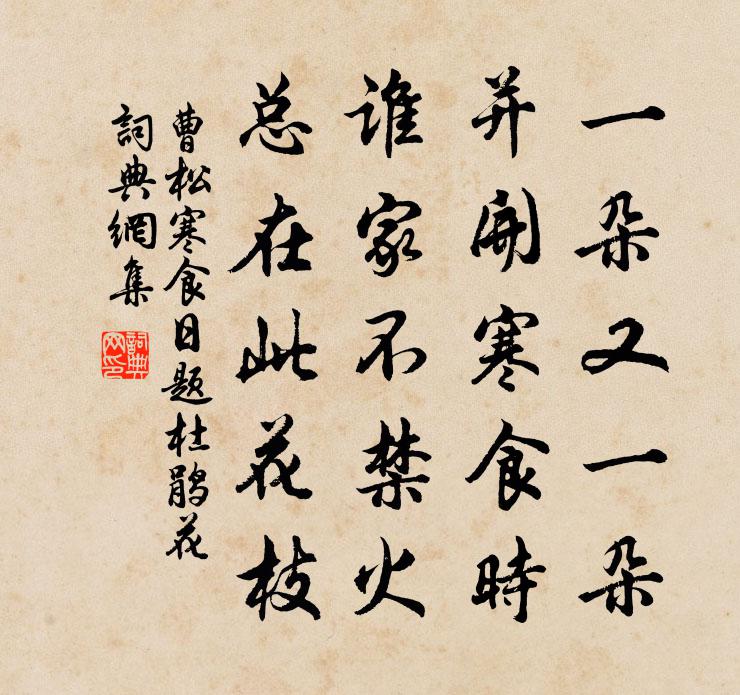 詩詞名句歷史字典書法欣賞書法字典國語詞典說文解字康熙字典古漢語字典標 題 作 者 詩 句 寒食日題杜鵑花作者:曹松 朝代:唐代寒食日題杜鵑花原文一朵又一朵,並開寒食時。誰家不禁火,總在此花枝。詩詞問答問:寒食日題杜鵑花的作者是誰?答:曹松問:寒食日題杜鵑花寫於哪個朝代?答:唐代問:寒食日題杜鵑花是什麼體裁?答:五絕曹松寒食日題杜鵑花書法欣賞寒食日題杜鵑花書法作品注釋全唐詩:卷717-27詩詞推薦酬李補闕皇甫冉〔唐代〕十年歸客但心傷,三徑無人已自荒。夕宿靈台伴煙月,晨趨建禮逐衣裳。偶因麋鹿隨豐草,謬荷鴛鸞借末行。縱有相和歌辭。對酒崔國輔〔唐代〕行行日將夕,荒村古冢無人跡。朦朧荊棘一鳥吟,屢唱提壺沽酒吃。古人不達酒不足,遺恨精靈傳此曲。寄言世上送蔡德輝教授三首周必大〔宋代〕天馬元從西極來,頻年伏櫪伴駑駘。如今始覺升沉異,萬里追風道路開。汀州陳映〔宋代〕元豐陳汀州,見謂黃太史。年登境無蝗,政恐不相似。同劉監丞步觀長乾寺後諸園項安世〔宋代〕遊人塞道不容車,千古金陵少婦居。朱雀大桁春雨後,鳥衣深巷曉風初。紅紅白白花無數,下下高高意有餘。此景和趙晦之司戶三首鄭剛中〔宋代〕文士務悅目,常患器局卑。余雖嗜古勁,而乏撫媚姿。袖繹起深愧。漸摩賴良規。溫言謾相訹,何以慰所思。玉泉瀑蔡必勝〔宋代〕珠箔飛空澗布流,卷舒曾不用銀鉤。懸崖灑灑清涵雪,越壑溶溶冷澀秋。勢動羽鱗應若是,韻諧宮徵亦相侔。水晶淳熙己亥歲傅子淵勸予無弄文墨自是絕意筆研項安世〔宋代〕兒時月露與風雲,半世調場罷策勛。老子今年新有興,良朋嗔我久無文。不妨翰墨鳴斯事,聊遣篇章記所云。不見題無訟堂屏上袁安臥雪圖楊萬里〔宋代〕雲窗避三伏,竹床橫一丈。退食急祖跣,病身聊偃仰。有夢元無夢,似想亦非想。滿堂變冥晦,寒陰起森爽。門外門有車馬客行陸機〔魏晉〕門有車馬客。駕言發故鄉。念君久不歸。濡跡涉江湘。投袂赴門塗。攬衣不及裳。拊膺攜客泣。掩淚敘溫涼。借問題歙山棲霞寺顧況〔唐代〕明徵君舊宅,陳後主題詩。跡在人亡處,山空月滿時。寶瓶無破響,道樹有低枝。已是傷離客,仍逢靳尚祠。杏花雜詩元好問〔金代〕杏花牆外一枝橫,半面宮妝出曉晴。看盡春風不回首,寶兒元自太憨生。送劉道原學士歸南康蘇轍〔宋代〕大川傾流萬物俱,根旋腳脫爭奔徂。流萍斷梗誰複數,長林巨石曾須臾。軒昂顛倒唯恐後,嗟予何獨強根株。三年次韻王彥昭感秋三首張耒〔宋代〕年來詩酒最關身,滿酌休論薄與醇。愁見洛陽秋夜月,無情偏照不眠人。陪張燕公行郡竹籬趙冬曦〔唐代〕良臣乃國寶,麾守去承明。外戶人無閉,浮江獸已行。隨來晉盜逸,民化蜀風清。郛郭從彝典,州閭荷德聲。小人醉蓬萊 九月十八日西虢劉氏醮丘處機〔元代〕乍三清鶴降,萬里雲收,昊天空翠。玉磬琅琅,動乾坤聲銳。盡日修齋,虛堂設醮,慶大仙恩惠。滿獻霞觥,長歌別虞守鄧肅〔宋代〕閩山去天惟尺五,傍立怪石如蹲虎。點額龍墀萬里歸,未能赤腳走風雨。慚愧使君肯相延,十日傾酒如流泉。文字醉和范景仁賦子華東軒樹次其韻梅堯臣〔宋代〕樹影落東牆,影微人已醉。休看枝上綠,但對眉間翠。舜洞秋風劉志行〔宋代〕當年大駕巡南中,薰兮時兮歌南風。太音九奏鳳凰集,真與塵世開盲聾。重華遠矣成飛仙,湘靈灑淚秋風前。天荒謫居王禹偁〔宋代〕親老復嬰孩,吾生自可哀。無田得歸去,有俸是嗟來。直道雖已矣,壯心猶在哉。端居寡儔侶,懷抱向誰開。名句推薦白鳥一雙臨水立,見人驚起入蘆花。戴復古《江村晚眺》 用人之道,又當以心術為本也。宋濂、王褘《元史·列傳·卷六十八》 今歲早梅開,依舊年時月。張孝祥《卜運算元·雪月最相宜》 日日深杯酒滿,朝朝小圃花開。朱敦儒《西江月·日日深杯酒滿》 天地無全功,聖人無全能,萬物無全用。故天職生覆,地職形載,聖職教化,物職所宜。列子及其弟子《列子·天瑞》 胡人吹笛戍樓間,樓上蕭條海月閒。高適《和王七玉門關聽吹笛 / 塞上聞笛》 心無備慮,不可以應卒。墨子《墨子·05章 七患》 帝鄉三千里,杳在碧雲間。李白《登敬亭北二小山余時送客逢崔侍御並登此地》 燈火萬家城四畔,星河一道水中央。白居易《江樓夕望招客》 明月照高樓,流光正徘徊。曹植《七哀》
