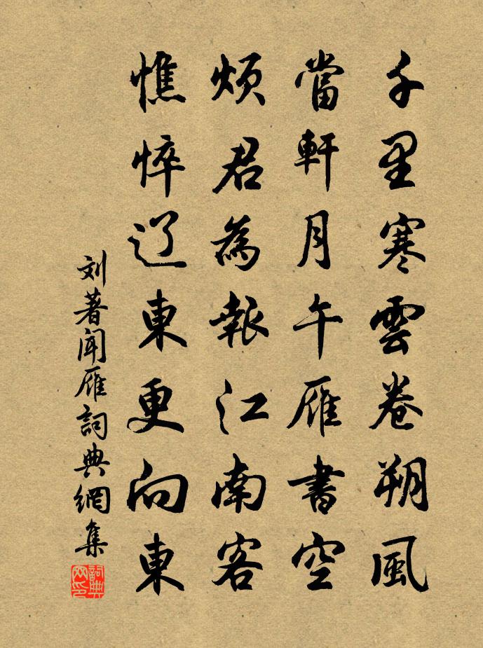 詩詞名句歷史字典書法欣賞書法字典國語詞典說文解字康熙字典古漢語字典標 題 作 者 詩 句 聞雁作者:劉著 朝代:金代聞雁原文千里寒雲卷朔風,當軒月午雁書空。煩君為報江南客,憔悴遼東更向東。詩詞問答問:聞雁的作者是誰?答:劉著問:聞雁寫於哪個朝代?答:金代問:聞雁是什麼體裁?答:七絕劉著聞雁書法欣賞聞雁書法作品詩詞推薦冬日送暹上人梅堯臣〔宋代〕霜風颳地如刀鎌,鳥不遠飛魚已潛。何況削髮冷入骨,草屨不畏冰雪沾。緣山涉水去幾里,晝缽野飯誰來添。毘陵題茶陵縣門伊用昌〔唐代〕茶陵一道婦長街,兩畔栽柳不栽槐。夜後不聞更漏鼓,只聽錘芒織草鞋。次韻酬屯田陳丈見寄李覯〔宋代〕老年才到病還催,老病成叢撥不開。腹冷有時如咽雪,耳虛終日獨聞雷。半生辛苦歸三徑,萬恨銷磨向一桮。賴得贈人蘇軾〔宋代〕別後休論信息疏,仙凡自古亦殊途。蓬山路遠人難到,霜柏威高道轉孤。舊賞未應亡楚國,新詩聞已滿皇都。誰憐和野渡家園雜興衛宗武〔宋代〕幽人非嗜石,適意在嶙峋。萬形何足多,一卷未為貧。山奚必泰華,水奚必海濱。藏珠川乃媚,韞玉璞足珍。儻存秋夜對月寄僧特鮑溶〔唐代〕憶見特公賞秋處,涼溪看月清光寒。今夕深溪又相映,特公何處共團圓。上知府大同王太尉六首魏野〔宋代〕兩地曾辭最重權,功如溫樹懶能言。從來富貴知何限,少有元戎是狀元。寄林可山胡仲弓〔宋代〕相去各天涯,江湖會面遲。數年不通問,一見便言詩。近世無和靖,今人說項斯。孤山梅已熟,滋味獨君知。晨起自山園歸書室陸游〔宋代〕世事苦紛紛,村墟寂不聞。穿林拾蟬蛻,隔浦數鷗群。搖落初飄葉,高舂未散雲。歸來書滿眼,猶足肆吾勤。滾繡球王實甫〔元代〕恨相見得遲,怨歸去得疾。柳絲長玉驄難系,恨不倩疏林掛住斜暉。馬兒遲遲的行,車兒快快的隨,卻告了相思回和潘仲嚴八絕鄭剛中〔宋代〕露薄雲輕物色佳,平平綠水映人家。鳩鳴村暗開桑葉,燕舞風斜落杏花。句張潞〔宋代〕江漢西來天地白。菊花新葛長庚〔宋代〕渺渺煙霄風露冷,夜未艾、涼蟾似水。海山外、五雲散彩,三峰凝翠。一鶴橫空何縹緲,見殿閣、笙歌擁羅綺。笑贈僧曹汝弼〔宋代〕一從叨命服,乘興入天台。院接石橋住,門臨瀑布開。松閒應獨坐,雪裡更誰來。時復攜藜杖,看雲上古台。詠史上李斯三首陳普〔宋代〕太華終南只磨青,渭流一日肯為涇。豺狼不食茅焦肉,水火安能熄六經。和顏長官百詠朱門朱繼芳〔宋代〕紅雨聲乾未作泥,繡成十里綠楊堤。金杯緩勸玲瓏唱,玉勒催歸腰褭嘶。瓊芝軒黃庭堅〔宋代〕卓僊在時養瓊芝,深根固蒂活人命。憧憧來問此何草,但告渠是唐婆鏡。武康溪居即事寄實印大師四首釋智圓〔宋代〕偶來溪上縱閒吟,泉石深藏便有心。莫擬他年訪幽跡,白雲青嶂更難尋。題清隱祠陳宓〔宋代〕高標千載有誰攀,風雨祠堂尚一間。寄語當年詹令尹,吾今亦欲早歸山。千秋歲(和尚學林壽筵節席)劉辰翁〔宋代〕新篘熟也,借問誰家早。梅影里,蜂兒繞。三更殘月上,一夜霜天曉。溪橋小,春風有意年年到。當年青鳥去,落名句推薦數萼初含雪,孤標畫本難。崔道融《梅花》 憂勤是美德,太苦則無以適性怡情;淡泊是高風,太枯則無以濟人利物。洪應明《菜根譚·概論》 自從一閉風光後,幾度飛來不見人。李益《隋宮燕》 白頭空負雪邊春,著意問春春不語。劉鎮《玉樓春·東山探梅》 社下燒錢鼓似雷,日斜扶得醉翁回。范成大《春日田園雜興》 縱使文章驚海內,紙上蒼生而已。龔自珍《金縷曲·癸酉秋出都述懷有賦》 渡口雙雙飛白鳥,煙裊,蘆花深處隱漁歌。閻選《定風波·江水沉沉帆影過》 以繩墨取木,則宮室不成矣。呂不韋《呂氏春秋·覽·離俗覽》 一晌憑欄人不見,鮫綃掩淚思量遍。馮延巳《鵲踏枝·梅落繁枝千萬片》 城上高樓接大荒,海天愁思正茫茫。柳宗元《登柳州城樓寄漳汀封連四州》