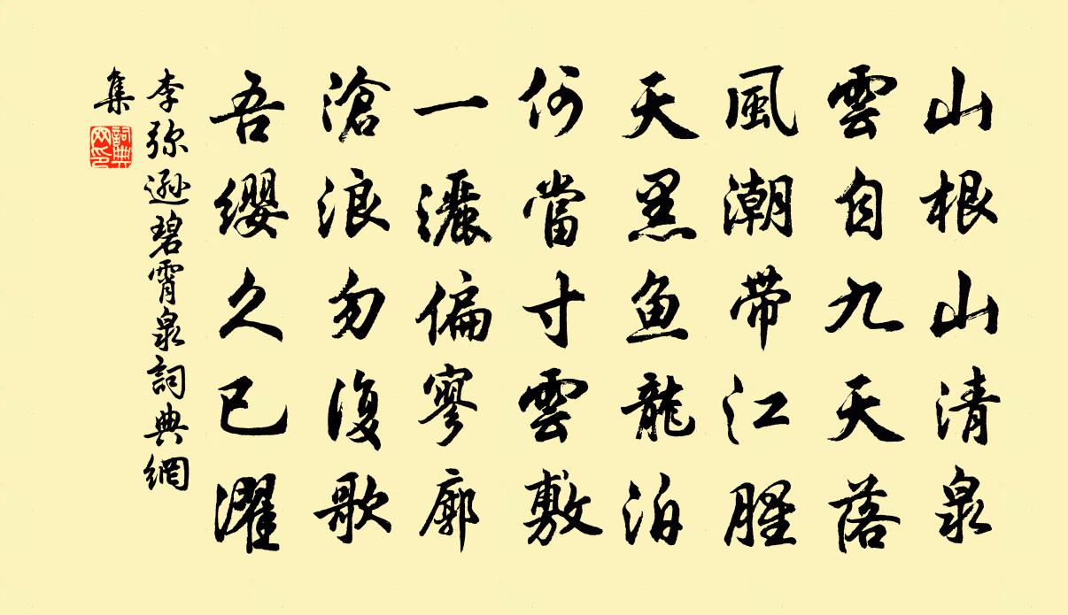 詩詞名句歷史字典書法欣賞書法字典國語詞典說文解字康熙字典古漢語字典標 題 作 者 詩 句 碧霄泉作者:李彌遜 朝代:宋代碧霄泉原文山根山清泉,雲自九天落。風潮帶江腥,天黑魚龍泊。何當寸雲敷,一灑偏寥廓。滄浪勿復歌,吾纓久已濯。詩詞問答問:碧霄泉的作者是誰?答:李彌遜問:碧霄泉寫於哪個朝代?答:宋代李彌遜碧霄泉書法欣賞碧霄泉書法作品詩詞推薦夏日李公見訪杜甫〔唐代〕遠林暑氣薄,公子過我游。貧居類村塢,僻近城南樓。帝舍頗淳樸,所願亦易求。隔屋喚西家,借問有酒不。牆頭病後游青龍寺李端〔唐代〕病來形貌穢,齋沐入東林。境靜聞神遠,身羸向道深。芭蕉高自折,荷葉大先沈。題李商叟半村壁徐照〔宋代〕一徑蒼苔合,連年不出門。風高松有韻,溪滿石無痕。不自知名重,令人覺有尊。更憂徵詔至,移室向深村。南柯子·山冥雲陰重王炎〔宋代〕山冥雲陰重,天寒雨意濃。數枝幽艷濕啼紅。莫為惜花惆悵、對東風。蓑笠朝朝出,溝塍處處通。人間辛苦是三農句諶祜〔宋代〕一日又從頭上過,百年多在夢中行。送喻鳧及第歸陽羨無可〔唐代〕姓字載科名,無過子最榮。宗中初及第,江上覲難兄。月向波濤沒,茶連洞壑生。石橋高思在,且為看東坑。從軍行·其二李白〔唐代〕百戰沙場碎鐵衣,城南已合數重圍。 突營射殺呼延將,獨領殘兵千騎歸。行後園陸游〔宋代〕霜風吹枯桑,落葉乾有聲。陂池日已涸,沙水見底清。人生非金石,歲暮難為情。安得天邊鵠,駕之以遐征!偈頌二百零五首釋正覺〔宋代〕雲門老子能施設,胡餅佛祖俱超越。哆哆和和兩片皮,狤狤獠獠三寸舌。不是特地展家風,也非投機應時節。生鐵從軍行孫銳〔宋代〕邊笳動地吹,鐵衣寒未卸。壯士冢累累,骨香千載下。陳保之訪宿徐照〔宋代〕不作王侯客,一身如散仟。少聞人世事,多欠酒家錢。省語初如傲,高文舊已傳。去燈燒蠟炬,相對坐茫然。點絳唇 探花王惲〔元代〕春雨添花,繞闌來看花開否。海棠紅瘦。綠葉花如豆。梨雪生香,近在清明候。花為友。莫輕孤負。預問鄰家酒。憶秦娥·中齋上元客散感舊劉辰翁〔宋代〕中齋上元客散感舊,賦憶秦娥見屬一讀悽然,隨韻寄情不覺悲甚燒燈節。朝京道上風和雪。風和雪。江山如舊,朝寄題朱元晦武夷精舍十二止宿寮楊萬里〔宋代〕一老說談話,諸君未要眠。開窗放山月,把酒奏溪泉。又和後九首劉克莊〔宋代〕入槐見蟻群聚,賦芧覺狙怒喜。脫離黑蟬獄中,透入光明境裡。和吳處士題村叟壁李鹹用〔唐代〕因閱鄉居景,歸心寸火然。吾家依碧嶂,小檻枕清川。遠雨籠孤戍,斜陽隔斷煙。沙虛遺虎跡,水洑聚蛟涎。糲曲村居馮時行〔宋代〕飛蛾故故撲燈光,風雨蕭蕭打紙窗。人為官方搔白首,虎來村落渡清江。猿啼冷日誰家夢,故國愁牽幾曲腸。籬菊怨回紇歌二首皇甫冉〔唐代〕白首南朝女,愁聽異域歌。收兵頡利國,飲馬胡蘆河。毳布腥膻久,穹廬歲月多。雕巢城上宿,吹笛淚滂沱。祖席贈惟了侍者陸游〔宋代〕雪中僵臥不須悲,徹骨清寒始解詩。一等人間閒草木,月窗君看早梅枝。頌古三十八首釋從瑾〔宋代〕當面非暗投,應機皆直說。乾峰與雲門,兩口同一舌。若是續貂人,弄巧便成拙。名句推薦刻薄成家,理無久享;倫常乖舛,立見消亡。朱柏廬《朱子家訓·全文》 我行殊未已,何日復歸來。宋之問《題大庾嶺北驛》 六出飛花入戶時,坐看青竹變瓊枝。高駢《對雪》 斑騅只系垂楊岸,何處西南任好風。李商隱《無題·鳳尾香羅薄幾重》 秋夜訪秋士,先聞水上音。袁枚《夜過借園見主人坐月下吹笛》 天涯地角有窮時,只有相思無盡處。晏殊《玉樓春·春恨》 好人之所惡,惡人之所好,是謂拂人之性,災必逮夫身。曾子《大學·第十一章》 朝見馬嶺黃沙合,夕望龍城陣雲起。盧思道《從軍行》 此身行作稽山土,猶吊遺蹤一泫然。陸游《沈園二首》 短長亭子短長橋,橋外垂楊一萬條。錢枚《憶王孫·短長亭子短長橋》