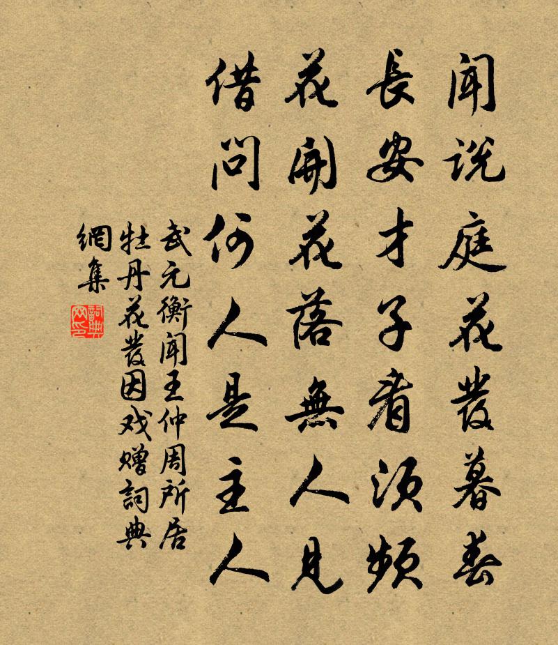詩詞名句歷史字典書法欣賞書法字典國語詞典說文解字康熙字典古漢語字典標 題 作 者 詩 句 聞王仲周所居牡丹花發,因戲贈作者:武元衡 朝代:唐代原文聞說庭花發暮春,長安才子看須頻。花開花落無人見,借問何人是主人。詩詞問答問:《聞王仲周所居牡丹花發,因戲贈》的作者是誰?答:武元衡問:該詩寫於哪個朝代?答:唐代書法欣賞聞王仲周所居牡丹花發,因戲贈書法作品注釋全唐詩:卷317-105詩詞推薦晚秋西園宋祁〔宋代〕西園來最數,要是使君閒。塢有常眠石,台無未識山。池光兼日動,楓影帶林殷。鳥沒蒼茫外,天垂搖落閒。歸雲次前韻蘇轍〔宋代〕閉門何所事,毛髮日青青。齒折登山屐,塵生貰酒瓶。調心開貝葉,救病讀《難經》。定起無人見,寒燈一點星。染絲上春機李賀〔唐代〕玉罌泣水桐花井,蒨絲沉水如雲影。美人懶態燕脂愁,春梭拋擲鳴高樓。彩線結茸背復疊,白袷玉郎寄桃葉,為君山居詩釋延壽〔宋代〕千途盡向空源出,萬景終歸一路通。忽爾有心成大患,坦然無事卻全功。春開小岫調新綠,水漾漂霞蘸晚紅。莫道諭亡了姜特立〔宋代〕死固汝可憐,生亦我所愛。生死兩相繆,吾將解其會。爛柯山四首。石室二禪師劉迥〔唐代〕繩床宴坐久,石窟絕行跡。能在人代中,遂將人代隔。白雲風颺飛,非欲待歸客。戲答聖俞持燭之句歐陽修〔宋代〕辱君贈我言雖厚,聽我酬君意不同。病眼自憎紅蠟燭,何人肯伴白須翁。花時浪過如春夢,酒敵先 * 下風。惟有從軍樂二首姚合〔唐代〕每日尋兵籍,經年別酒徒。眼疼長不校,肺病且還無。僮僕驚衣窄,親情覺語粗。幾時得歸去,依舊作山夫。朝朝逍遙詠宋太宗〔宋代〕鼎內蓮花出,如塵發絳紅。坎鉛將匹配,離火好相逢。陰散何優劣,陽歸自契約。消停方可信,輝華大道雄。題夏珪夜潮風景圖宋理宗〔宋代〕定知玉兔十分圓,已作霜風九月寒。寄語重門休上鑰,夜潮留向月中看。菱花董嗣杲〔宋代〕珠團綠錦趁晴攤,涼蔭龜魚六月寒。背日開花非芡比,荒年收實當蔬餐。一方錦里消清暑,五瓣闌乾俯碧瀾。漠漠剔銀燈(仙呂調)柳永〔宋代〕何事春工用意。繡畫出、萬紅千翠。艷杏夭桃,垂楊芳草,各斗雨膏煙膩。如斯佳致。早晚是、讀書天氣。漸漸園春詞毛滂〔宋代〕曉光開鄉幄,晴色上金除。初進春衣窄,猶應澣濯余。庶草將蕃廡,群陰自退消。遲遲杏梁日,長照紫宸朝。棋盤仙跡韓信同〔宋代〕唐山絕頂棋盤石,戲局流傅名自昔。仇勒細間白髮翁,雲是仙人曾對奕。苔封石燈不敢多,竹引清風時拂試。箇中水龍吟劉辰翁〔宋代〕看人削樹成槎,布帆海上秋風浪。白頭坡老,知津水手,倚桄榔杖。九點齊州,半生髀肉,煙塵蒼莽。但北窗夢轉餘蓄石屏風十游稚宜喜而求之輒遺其一侑以五曾豐〔宋代〕大道要為天下公,割吾所愛以歸儂。北窗不在西湖上,驚見飛來湖上峰。朝中措(雙頭芍藥)侯置〔宋代〕翻階紅藥競芬芳。著意巧成雙。須信揚州國艷,舊時曾在昭陽。盈盈背立,同心對綰,聯萼飛香。牢貯深沈金屋,次韻和謝江陵楊縣丞投贈四首項安世〔宋代〕賣臣五十貴何疑,衣錦懷章亦未遲。苕霅有情依替轂,簪纓無數足親知。只消笑同長安得,何用歌穿郢市為。江漢題招提院靜照堂張芻〔宋代〕槜李舊禪扉,叢林自翠微。寺居天外靜,僧向日邊歸。野水涵齊幾,閒雲宿釣磯。庭前祖來意,誰為相依依。望中許月卿六〔宋代〕望中惟有山平遠,山外更連天泬寥。好著個亭管煙水,夜涼明月舉杯邀。名句推薦迎天意,揣利害,不如其已。列子及其弟子《列子·力命》 親愛我,孝何難。親憎我,孝方賢。李毓秀《弟子規·入則孝》 鞭個馬兒歸去也,心急馬行遲。辛棄疾《武陵春·走去走來三百里》 松月生夜涼,風泉滿清聽。孟浩然《宿業師山房期丁大不至 / 宿業師山房待丁大不至》 驚鳥去無際,寒蛩鳴我傍。馬戴《楚江懷古三首》 菊花何太苦,遭此兩重陽?李白《九月十日即事》 當年不肯嫁春風,無端卻被秋風誤。賀鑄《芳心苦·楊柳回塘》 海水夢悠悠,君愁我亦愁。佚名《西洲曲》 紅旗捲起農奴戟,黑手高懸霸主鞭。 * 《七律·到韶山》 謝亭離別處,風景每生愁。李白《謝公亭·蓋謝朓范雲之所游》