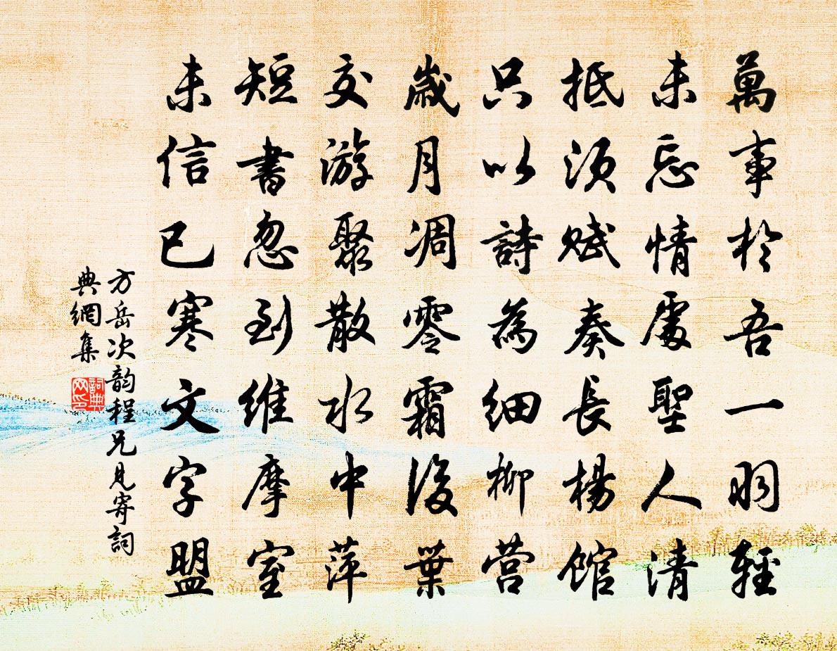 詩詞名句歷史字典書法欣賞書法字典國語詞典說文解字康熙字典古漢語字典標 題 作 者 詩 句 次韻程兄見寄作者:方岳 朝代:宋代次韻程兄見寄原文萬事於吾一羽輕,未忘情處聖人清。抵須賦奏長楊館,只以詩為細柳營。歲月凋零霜後葉,交遊聚散水中萍。短書忽到維摩室,未信已寒文字盟。詩詞問答問:次韻程兄見寄的作者是誰?答:方岳問:次韻程兄見寄寫於哪個朝代?答:宋代方岳次韻程兄見寄書法欣賞次韻程兄見寄書法作品詩詞推薦乾寧三年丙辰在奉天重圍作韓偓〔唐代〕仗劍夜巡城,衣襟滿霜霰。賊火遍郊坰,飛焰侵星漢。積雪似空江,長林如斷岸。獨憑女牆頭,思家起長嘆。武陵別文瑩上人張師正〔宋代〕憶昔荊州屢過從,當時心已慕冥鴻。渚宮禪伯唐齊己,淮甸詩豪宋惠崇。老格疏間松倚澗,清談瀟灑坐生風。史官送梅子明通判餘杭張耒〔宋代〕東南山水窟,錢塘吳越都。吾人神仙后,厭直承明廬。一舸去莫挽,落帆風月湖。蹁躚青衿子,能誦先生書。借問漫述黃庚〔宋代〕眼前萬事等一夢,世上幾人能百年。千古英雄今已矣,北邙荒冢草芊芊。頌古三十三首釋師觀〔宋代〕弟應兄呼畫不成,誰人肯向裡頭行。自從家破人亡後,直至如今事轉生。關山月盧照鄰〔唐代〕塞坦通碣石,虜障抵祁連。相思在萬里,明月正孤懸。影移金岫北,光斷玉門前。寄言閨中婦,時看鴻雁天。閣上招友人邵雍〔宋代〕清風正藹如,小閣枕通衢。不欲久獨擅,能來同享無。發岐亭宿故鎮三首張耒〔宋代〕乘月入秋山,月午山蹊靜。森森松竹林,夾道散疏影。陰風留暗壑,白露蒙朝嶺。耿耿村雞鳴,坐感單衣冷。呈同行諸丈洪咨夔〔宋代〕秋風俱白髮,萬里錦城官。箭貫雙鵰易,琴隨一鶴難。國寬同是福,民病獨何安。前見乖崖老,煩君舉似看。送徑山圓兄亂後歸鄉釋紹曇〔宋代〕故國類塵慘甲兵,勞生終日望昇平。軍持帶得龍淵水,歸去何妨一洗清。【仙呂】一半兒_佳人才子共佚名〔元代〕佳人才子共雙雙,紈扇輕搖玉體涼,荷錢貼水滿池塘。拭羅裳,一半兒斜披一半兒敞。 南樓昨夜雁聲悲,良夜獸之窮吳泳〔宋代〕獸之窮,逼我牆,韓盧走兔無窟藏。江麋假息尚撲朔,穴鼠無技猶張皇。我{左飠右甘}豈不甘,我纓豈不長。貍泊姑蘇城外大雪二首楊萬里〔宋代〕今日晴光滿碧空,也無霧雨也無風。寂然窗戶黃昏後,霍地瓊瑤一望中。千里湖山銀作地,半篙舴艋玉為宮。丁寧題韓乾馬呂量〔宋代〕何年供奉仙,寫此真乘黃。矯矯天骨起,爛爛隅目光。豈無萬里姿,御者非王良。青衫老奚官,肉眼空倀倀。飲秣幽居雜興真山民〔宋代〕松桂小菟裘,山扉幽更幽。蜂王衙早晚,燕子社春秋。鬢禿難庶老,心寬不貯愁。年來把鋤手,無復揖公侯。浣溪沙(韓彥古)韓彥古〔宋代〕一縷金香永夜清。殘編未掩古琴橫。繡衾寒擁寶缺明。坐聽竹風敲石磴,旋傾花水漱春酲。落梅和雨打簾聲。浣溪沙晏幾道〔宋代〕小杏春聲學浪仙。疏梅清唱替哀弦。似花如雪繞瓊筵。腮粉月痕妝罷後,臉紅蓮艷酒醒前。今年水調得人憐。書案上三種梅三首趙蕃〔宋代〕翠袖佳人倚竹詩,昔人比興乃陳辭。我今顧欲求真相,綠萼梅花並竹枝。熙寧望祭岳鎮海瀆十七首佚名〔宋代〕盛德惟木,勾芒御神。沂貸淮海,厥功在民。爰熙壇坎,主對庶神。於以歆格,靈貽具臻。望蓬萊 以上道藏仙樂集卷四劉處玄〔元代〕修行好,應化學齋科。旦望焚香參禮聖,書閒夜靜眾吟喔。智慧性明多。無為理,萬法弗能過。外行內功真了了,名句推薦我是人間惆悵客,知君何事淚縱橫,斷腸聲里憶平生。納蘭性德《浣溪沙·殘雪凝輝冷畫屏》 還將兩行淚,遙寄海西頭。孟浩然《宿桐廬江寄廣陵舊遊》 君知妾有夫,贈妾雙明珠。張籍《節婦吟·寄東平李司空師道》 驪山四顧,阿房一炬,當時奢侈今何處?張養浩《山坡羊·驪山懷古》 恐是仙家好別離,故教迢遞作佳期。李商隱《辛未七夕》 君子懷德,小人懷土;君子懷刑,小人懷惠。孔子弟子《論語·里仁篇》 江東子弟今雖在,肯與君王卷土來?王安石《疊題烏江亭》 河水洋洋,北流活活詩經《碩人》 淡中交耐久,靜里壽延長。王永彬《圍爐夜話·第一一六則》 楊柳陰陰細雨晴,殘花落盡見流鶯。武元衡《春興》