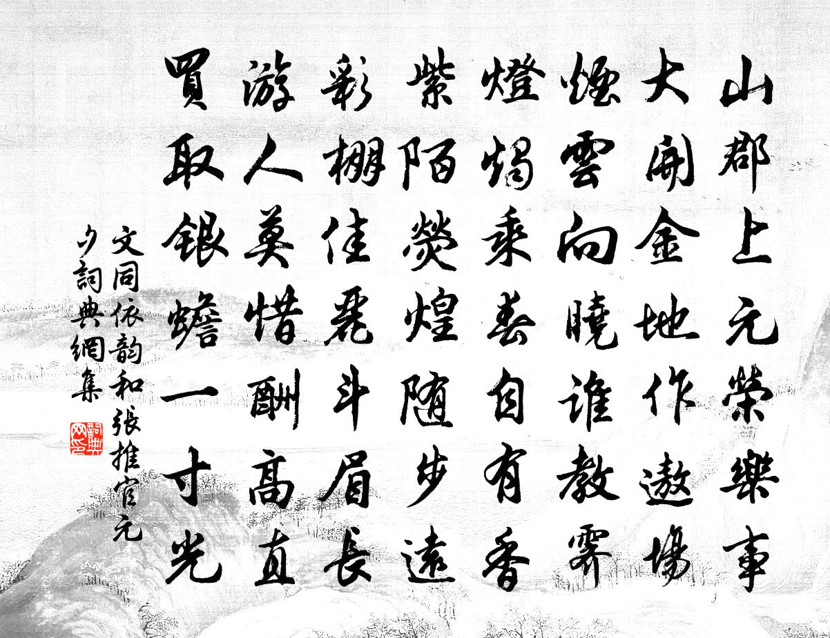 詩詞名句歷史字典書法欣賞書法字典國語詞典說文解字康熙字典古漢語字典標 題 作 者 詩 句 依韻和張推官元夕作者:文同 朝代:宋代依韻和張推官元夕原文山郡上元榮樂事,大開金地作遨場。煙雲向曉誰教霽,燈燭乘春自有香。紫陌熒煌隨步遠,彩棚佳麗斗眉長。遊人莫惜酬高直,買取銀蟾一寸光。詩詞問答問:依韻和張推官元夕的作者是誰?答:文同問:依韻和張推官元夕寫於哪個朝代?答:宋代文同依韻和張推官元夕書法欣賞依韻和張推官元夕書法作品詩詞推薦和題李公麟陽關圖二首蘇頌〔宋代〕渭城淒咽不堪聽,曾送征人萬里行。今日玉關長不閉,誰將舊曲變新聲。擬古六首曾協〔宋代〕孤峰郁嵯峨,千古常峻峙。下有迴環水,流浪無定止。如何深遠意,盡寄七弦裹。妾意極高山,君心甚流水。贈解禹玉陳造〔宋代〕讀書只博雙鬢斑,詩好豈解留朱顏。平時無客憐轍鮒,觸處有人嘲飯山。相府略嘗喚宜祿,木門不夢窺銅環。多病雨後十小絕以一雨洗殘暑萬家生早涼為韻章甫〔宋代〕卻扇情未忍,補衣計當早。騷人愛悲秋,秋色政自好。菩薩蠻 賈君彥明為陽丘丞,三年職揚政舉,劉敏中〔元代〕挈家來吃山城水。三年不剩公田米。何物辦歸裝。一車風滿箱。吾人垂淚嘆。過客回頭看。誰不愛清官。清官似子餞儲秀野赴廣西制司參議胡仲弓〔宋代〕時艱急似救頭燃,快趁春風著一鞭。人道輕車諳路熟,我疑重閫得君賢。狨衣便帶楊花雪,鶴骨猶勝桂嶺煙。兵畫十一二用喜雪韻四首吳潛〔宋代〕長安貧者再炊難,臛肉蒼頭飫舌端。食雪自應還猛將,飲水只合付清官。尚興塞外鳴弦想,賸欲江頭把釣看。只恐素梅 其十王冕〔元代〕玉雪玲瓏瘦影重,不同桃李媚春風。十分清致無人解,猶在舊家池館中。小沖山/小重山宋豐之〔宋代〕花樣妖嬈柳樣柔。眼波流不斷、滿眶秋。窺人佯整玉搔頭。嬌無力,舞罷卻成羞。無計與遲留。滿懷禁不得、許多賦得秋柳顧炎武〔清代〕昔日金枝間白花,只今搖落向天涯。條空不系長征馬,葉少難藏覓宿鴉。老去桓公重出塞,罷官陶令乍歸家。先皇阻雪連句遙贈和佚名〔南北朝〕積雪皓陰池,北風鳴細枝。九逵密如繡,何異遠別離。(謝朓)風庭舞流霰,冰沼結文澌。飲春雖以燠,欽賢紛若壽安宣相吳泳〔宋代〕上謂無官可報卿,延登左棘倍恩榮。勛存社稷身俱泰,志在生靈物轉輕。平蜀以前誰磊落,渡江而後獨光明。蚤令探芳訊(湖上春遊,繼草窗韻)李彭老〔宋代〕對芳晝。甚怕冷添衣,傷春疏酒。正緋桃如火,相看自依舊。閒簾深掩梨花雨,誰問東陽瘦。幾多時,漲綠鶯枝,己酉中秋喻良能〔宋代〕磬湖秋半溢青波,一歲月明今夕多。剩辦新詩娛老境,滿傾太白醉冰娥。一天風露寒衣袂,舉室兒童雜笑歌。不是陋居一首蘇籀〔宋代〕平生瓮牖蔀茆菁,江左那無雨土寧。遊宦飄然紆幕燕,陋居粗有讀書螢。浮生佛腳須當抱,亂世儒衣便欲停。天定寄史景正教授陳著〔宋代〕物表樓前話一番,晨星落落破痴昏。詩書非事口儒學,韋布不知身相門。壹是古心交耐友,多將新意發陳言。吾今禪人並化主寫真求贊釋正覺〔宋代〕智須轉色,淨還發光。活眼唯自照,喜眉為誰揚。巍巍堂堂,煒煒煌煌,莫道儂家兮觸事面牆。寄題興國倅廳湖山偉觀樓陳杰〔宋代〕華表歸威可手攀,新亭風景落眉間。千年宇宙千年事,萬里湖山萬里天。庭蠡水來仍水落,衡廬雲起復雲閒。古今水調歌頭·題劍閣崔與之〔宋代〕萬里雲間戍,立馬劍門關。亂山極目無際,直北是長安。人苦百年塗炭,鬼哭三邊鋒鏑,天道久應還。手寫留屯奏又觀音贊釋道璨〔宋代〕如嶼兮媚川,如山兮倚天。大哉圓通之道,民無得而名焉。名句推薦一山飛峙大江邊, 躍上蔥蘢四百旋 * 《七律·登廬山》 綠陰青子老溪橋。羞見東鄰嬌小。吳文英《西江月·賦瑤圃青梅枝上晚花》 分明一覺華胥夢,回首東風淚滿衣。趙鼎《鷓鴣天·建康上元作》 謂學不暇者,雖暇亦不能學矣。劉安及其門客《淮南子·說山訓》 念去來、歲月如流,徘徊久、嘆息愁思盈。周邦彥《綺寮怨·上馬人扶殘醉》 何當金絡腦,快走踏清秋。李賀《馬詩二十三首》 胡風吹代馬,北擁魯陽關。李白《豫章行》 天寒水鳥自相依,十百為群戲落暉。秦觀《還自廣陵》 遙望洞庭山水色,白銀盤裡一青螺劉禹錫《望洞庭》 歸時休放燭光紅,待踏馬蹄清夜月。李煜《木蘭花·曉妝初了明肌雪》