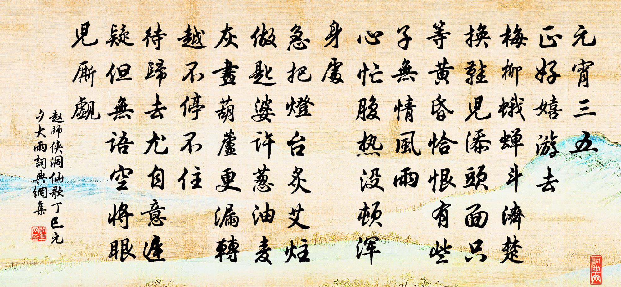 詩詞名句歷史字典書法欣賞書法字典國語詞典說文解字康熙字典古漢語字典標 題 作 者 詩 句 洞仙歌(丁巳元夕大雨)作者:趙師俠 朝代:宋代洞仙歌(丁巳元夕大雨)原文元宵三五。正好嬉遊去。梅柳蛾蟬斗濟楚。換鞋兒、添頭面,只等黃昏,恰恨有、些子無情風雨。心忙腹熱,沒頓渾身處。急把燈台炙艾炷。做匙婆、許蔥油,麥灰畫葫蘆,更漏轉,越不停不住。待歸去、尤自意遲疑,但無語空將,眼兒廝覷。詩詞問答問:洞仙歌(丁巳元夕大雨)的作者是誰?答:趙師俠問:洞仙歌(丁巳元夕大雨)寫於哪個朝代?答:宋代問:洞仙歌(丁巳元夕大雨)是什麼體裁?答:詞趙師俠洞仙歌(丁巳元夕大雨)書法欣賞洞仙歌(丁巳元夕大雨)書法作品詩詞推薦秋日偶題杜牧〔唐代〕荷花兼柳葉,彼此不勝秋。玉露滴初泣,金風吹更愁。綠眉甘棄墜,紅臉恨飄流。嘆息是遊子,少年還白頭。賦情慧姞〔宋代〕自憐新髻好,對鏡久夷猶。回首瞥見郎,含羞整搔頭。花間並郎行,低說夜來話。蝴蝶學嬌閣,飛來傍裙帶。羨殺雜劇·劉夫人慶賞五侯宴關漢卿〔元代〕楔子(沖末扮李嗣源領番卒子上,李嗣源雲)野管羌笛韻,英雄戰馬嘶。擂的是鏤金畫面鼓,打的是雲月皂雕旗。和高吉父六絕杜范〔宋代〕世事紛紛起笑端,五雲深處最高寒。與君便好尋前約,霽月難同俗眼看。渚宮晚春寄秦地友人溫庭筠〔唐代〕風華已眇然,獨立思江天。鳧雁野塘水,牛羊春草煙。秦原曉重疊,灞浪夜潺湲。今日思歸客,愁容在鏡懸。今歲試士竟置酒起文堂延主司且作詩送之晁公溯〔宋代〕吾州俗近古,他邦那得如。飲食猶俎豆,傭販皆詩書。今年屬賓興,詔下喧里閭。白袍五千人,崛起塞路衢。入門生查子(同前感舊)晁補之〔宋代〕宮裡妒娥眉,十載辭君去。翠袖怯天寒,修竹無人處。今日近君家,望極香車騖。一水是紅牆,有恨無由語。紹興以後祀感生帝十六首佚名〔宋代〕[黃鐘為角]宋德惟火,神實司之。上們申惹,迎方重離。瑤幣告法,秀畢金支。啾啾神在,彝介繁禧。偈頌七十八首釋正覺〔宋代〕青山白雲父,白雲青山兒。白雲終日倚,青山總不知。九日廣陵同陳十五先輩登高懷林十二先輩歐陽詹〔唐代〕客路重陽日,登高寄上樓。風煙今令節,台閣古雄州。泛菊聊斟酒,持萸懶插頭。情人共惆悵,良久不同游。句榮倪〔宋代〕多謝喧喧雀,時來破寂寥。登望雲亭招友朱慶餘〔唐代〕日日恐無雲可望,不辭逐靜望來頻。共知亭下眠雲遠,解到上頭能幾人。袁居士來自桐廬索詩贈二絕句林季仲〔宋代〕霜髯垂臆杖過眉,得得桐廬江上來。對我休談釣台好,姓名方掛北山移。贈鞏疇鄭薰〔唐代〕密雪松桂寒,書窗導余清。風撼冰玉碎,階前琴磬聲。榻靜幾硯潔,帙散縑緗明。高論展僧肇,精言資鞏生。立意倣歸去來辭晃逈〔宋代〕陶令釣魚曾言歸去釣魚來,解釣魚還家不回首。屏貴都遺身外名,忘憂酷嗜杯中釣魚。白傳曾言歸去來,了知浮世浣溪沙·獨立寒階望月華張泌〔五代〕獨立寒階望月華,露濃香泛小庭花,繡屏愁背一燈斜。雲雨自從分散後,人間無路到仙家,但憑魂夢訪天涯。賀新郎(和狄志父秋日述懷)廖行之〔宋代〕玉宇□蓬戶。渺涼聲、箾槮梧井,亂零楓浦。得得西山朝來爽,碧瘦千崖萬樹。清興在、煙霞深處。拄笏風流今誰平湖俞桂〔宋代〕平湖一景堪圖畫,舟子煙波去復歸。舊日玄真無覓處,西山長見鷺鸞飛。漁家薛師石〔宋代〕小舟輕似葉,曾不畏風濤。自說磻溪好,翻疑釣瀨高。晚來魚換酒,歸去子持篙。定是逃名者,時聞歌楚騷。立春內中帖子詞溫成皇后閣王珪〔唐代〕遙聞碧海有三山,雲鎖瓊樓日月間。花下玉顏常不老,也應春色勝人間。名句推薦師之所處,荊棘生焉。大軍之後,必有凶年。老子《老子·道經·第三十章》 河橋送人處,涼夜何其。周邦彥《夜飛鵲·河橋送人處》 此時相望不相聞,願逐月華流照君。張若虛《春江花月夜》 病骨支離紗帽寬,孤臣萬里客江乾。陸游《病起書懷》 推手遽止之,濕衣淚滂滂韓愈《聽穎師彈琴》 為學不外靜敬二字,教人先去驕惰二字。王永彬《圍爐夜話·第一四八則》 微雨靄芳原,春鳩鳴何處。韋應物《東郊》 齊有倜儻生,魯連特高妙。李白《古風·齊有倜儻生》 清夜何湛湛,孤燭映蘭幕。江淹《銅爵妓》 暖風熏得遊人醉,直把杭州作汴州。林升《題臨安邸》