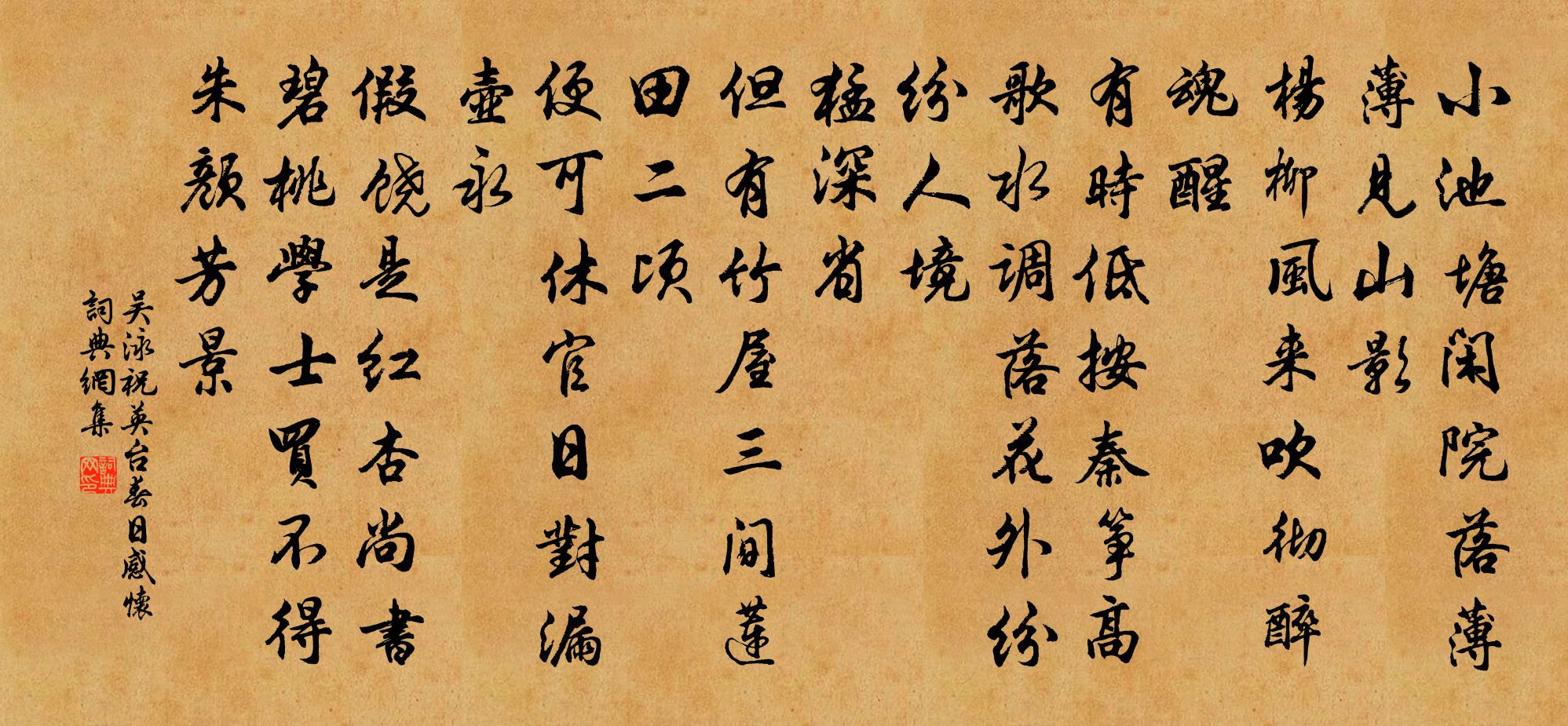 詩詞名句歷史字典書法欣賞書法字典國語詞典說文解字康熙字典古漢語字典標 題 作 者 詩 句 祝英台(春日感懷)作者:吳泳 朝代:宋代祝英台(春日感懷)原文小池塘,閒院落,薄薄見山影。楊柳風來,吹徹醉魂醒。有時低按秦箏,高歌水調,落花外、紛紛人境。猛深省。但有竹屋三間,蓮田二頃。便可休官,日對漏壺永。假饒是、紅杏尚書,碧桃學士,買不得、朱顏芳景。詩詞問答問:祝英台(春日感懷)的作者是誰?答:吳泳問:祝英台(春日感懷)寫於哪個朝代?答:宋代問:祝英台(春日感懷)是什麼體裁?答:詞吳泳祝英台(春日感懷)書法欣賞祝英台(春日感懷)書法作品詩詞推薦和李次仲韻曹勛〔宋代〕先生酒柱史後,酒道價連城酒重。火龍酒燎金鼎,玉樓詎可凍。扁舟造交舊,已奏少微動。藹然交風暢,舉世士莫秋夜趙汝鐩〔宋代〕秋到情懷惡,美人天一方。夜深窗轉月,夢斷角吹霜。讀吳怡詩卷二首張耒〔宋代〕疏梅半落雪中香,想子孤吟對酒缸。野水荒山半猿鳥,跨驢誰問賈長江。暮春聞鶯張玉孃〔宋代〕膏雨初乾風日晴,綠陰深處一聲鶯。喚回午枕傷春夢,起向薔薇花下行。舟還浯溪再留二絕留筠〔宋代〕自笑塵埃賦□忙,佳山招我莫徜徉。何當了卻痴兒事,來伴高人枕碧湘。次雲見過留宿有詩因賡其韻二首黃公度〔宋代〕惜別情無賴,狂吟意有餘。琴尊閒院落,花柳暗村墟。行樂真聊爾,論交莫後予。裹糧山下約,來往未應疏。冬狩行四韻連句應詔詩庾信〔南北朝〕三川羽檄馳。六郡良家選。觀兵細柳城。校獵長楊苑。驚雉逐鷹飛。騰猿看箭轉。鳴笳河曲還。猶憶南皮返。淳熙戊戌在家聚徒期以秋冬隨子赴任作詩二絕孫介〔宋代〕為學須當及少年,莫言愚智盡由天。青春若不勤耕種,秋熟徒嗟有廢田。頌古九首釋思岳〔宋代〕時清休唱太平歌,大冶紅罏著一毛。試向其中撮灰燼,亘天紅焰已周遭。詩一首趙師訓〔宋代〕慶元宰相事紛紛,說著令人暗斷魂。好聽當時劉弼語,分些官職乞平原。游列真觀劉道士拉上潮際觀漁趙汝回〔宋代〕珠宮何岧嶢,前江後層嶂。開山者何人,蕭梁山中相。竊惟經營初,豈曰此幽賞。地靈宜仙事,境寂銷俗相。既積偈頌三十首釋慧暉〔宋代〕靈劍刃輝在匣中,清光所照侵虛空。密通訊息不傳句,天上人間功不同。濱州道中四首晁補之〔宋代〕林下囊裝夙興,雲間鴻雁悲鳴。行役正嗟予弟,言旋當復諸兄。祈雨於石〔宋代〕六月不雨至七月,草木脆乾石欲裂。方士畫符如畫鴉,呵叱風伯鞭雷車。九天雲垂海水立,驕陽化為雨三日。萬口北村吳園雨中賞牡丹主人留飲仇遠〔宋代〕不謂村園見此花,嬌紅數朵眩晴霞。可憐國色天香種,竟落田夫野老家。略具杯盤供筍蕨,已拚杖屨污泥沙。莫愁周梅所還譚山舒岳祥〔宋代〕柴門萬物靜,秋色棲四山。風篁自灑掃,雲鳥相往還。而有玄寂士,冷然鳴轡環。此客不喜飲,舉瓢酌潺湲。來即都梁北鄉士多好學有向君敏衡者一日訪予語甚牟巘五〔宋代〕廉崖千仞孰能幹,一見令人毛髮寒。可以人而不如石,我當為石共衣冠。有懷介然偶作因記之吳則禮〔宋代〕介然平生三隻襪,意行跛跛復挈挈。上懶把椎拂拿卻,過淮來昔伴僧伽。聞蟬五絕句奉呈諸幕友曾豐〔宋代〕炎帝乘風馭氣行,前驅警蹕羽仙輕。胸中一部鈞天樂,吐作衙字唱道星。和龍圖王學士經塗洛邑見寄宋庠〔宋代〕謝病台階別邃旒,更榮符鑰守司州。篋書已辯恩難報,台禮雖頒政未修。潄石洛波鳴佩曉,插雲嵩色紺屏秋。煩君名句推薦匹馬南來渡浙河,汴城宮闕遠嵯峨。于謙《岳忠武王祠》 獨抱濃愁無好夢,夜闌猶剪燈花弄。李清照《蝶戀花·暖雨晴風初破凍》 柳花驚雪浦,麥雨漲溪田。李賀《南園十三首》 人過留名,雁過留聲。佚名《增廣賢文·下集》 君王遊樂萬機輕,一曲霓裳四海兵。李約《過華清宮》 城中桃李愁風雨,春在溪頭薺菜花。辛棄疾《鷓鴣天·陌上柔桑破嫩芽》 夜雨連明春水生,嬌雲濃暖弄陰晴。蘇舜欽《初晴游滄浪亭》 惠遠祠前晉溪水,翠葉銀花清見底。元好問《過晉陽故城書事》 愛故不二,威故不犯。 故善將者,愛與威而已。尉繚《尉繚子·攻權》 不可以身相得見如來。鳩摩羅什譯《金剛經·如理實見》