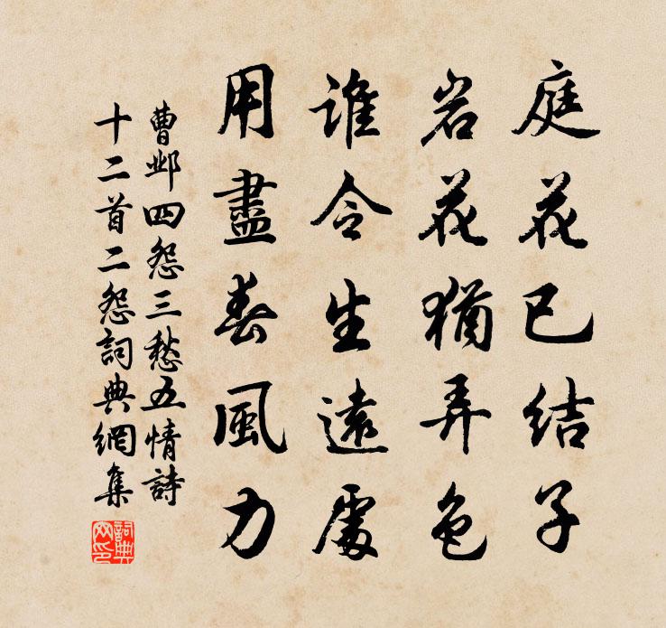 詩詞名句歷史字典書法欣賞書法字典國語詞典說文解字康熙字典古漢語字典標 題 作 者 詩 句 四怨三愁五情詩十二首。二怨作者:曹鄴 朝代:唐代原文庭花已結子,岩花猶弄色。誰令生遠處,用盡春風力。詩詞問答問:《四怨三愁五情詩十二首。二怨》的作者是誰?答:曹鄴問:該詩寫於哪個朝代?答:唐代書法欣賞四怨三愁五情詩十二首。二怨書法作品注釋全唐詩詩詞推薦節惠劉克莊〔宋代〕醉似東皋子,愚於北谷去。何當節一惠,單謚作愚翁。郊居言志韋應物〔唐代〕負暄衡門下,望雲歸遠山。但要尊中物,餘事豈相關。交無是非責,且得任疏頑。日夕臨清澗,逍遙思慮閒。出去潯陽與孫郎中宴回周賀〔唐代〕別酒已酣春漏前,他人扶上北歸船。潯陽渡口月未上,漁火照江仍獨眠。放鶴雍陶〔唐代〕從今一去不須低,見說遼東好去棲。努力莫辭仙路遠,白雲飛處免群雞。郡齋水閣閒書靜觀文同〔宋代〕十許紋魚弄水,一雙花鴨眠沙。靜觀只恐驚去,無語憑欄日斜。紹興淳熙分命館職定撰十七首佚名〔宋代〕[黃鐘為角]合宮盛禮,金商令時。務成熙事,蒐揚上余。駿奔在庭,精意肅祗。來享嘉成,神靈燕娭。句翁卷〔宋代〕官曆春猶淺。題范蠡五湖圖李曾伯〔宋代〕美婦天下有,忠臣古來稀。去國不潔名,避世良知幾。寧侶我舟楫,毋著君宮闈。平生萬事足,偕老五湖歸。天門泉詩李廌〔宋代〕昔聞天門泉,石竇注澄澈。行人口生煙,可救萬夫渴。為惠胡不竟,吾來值源竭。仙都山劉參〔宋代〕古帝此登仙,霓旌不復還。孤標蒼嶺外,屹立紫煙間。上下形端柱,周回影轉環。根疑連海嶠,頂欲突天關。蓮出和宋英叟先塋建亭作何夢桂〔宋代〕誰表新阡瞰石關,要將孝義軌人寰。千年永宅歸元亮,百尺豐碑葬魯山。旌旐尚存青檟外,亭台半在白雲間。兒孫餈韻楊公濟奉議梅花十首蘇軾〔宋代〕君知早落坐先開,莫著新詩句句催。嶺北霜枝最多思,忍寒留待使君來。雨夜宿淨行院蘇軾〔宋代〕芒鞋不踏利名場,一葉輕舟寄渺茫。林下對床聽夜雨,靜無燈火照淒涼。相逢行李白〔唐代〕相逢紅塵內,高揖黃金鞭。萬戶垂楊里,君家阿那邊。朝中措張掄〔宋代〕蕭蕭蘆葉暮寒生。雪厭凍雲平。密灑一篷煙火,驚鴻飛起沙汀。收綸罷釣,空江有浪,短棹無聲。便是天然圖畫,讀東坡玉糝詩因成一絕續去年芋莖羹後寄丘林陳藻〔宋代〕味有酥陀出自天,芋成玉糝卻同然。此羹若使東坡見,尤怪枯莖化得偏。輞川集木蘭柴王維〔唐代〕秋山斂餘照,飛鳥逐前侶。彩翠時分明,夕嵐無處所。頌古三十八首釋從瑾〔宋代〕當面非暗投,應機皆直說。乾峰與雲門,兩口同一舌。若是續貂人,弄巧便成拙。李氏園陳藻〔宋代〕開方數畝地,委曲多門牆。咫尺闤闠間,縈帶豀山傍。入巷見顏子,簞瓢想淒涼。變化若夢中,忽成摩詰莊。主人河北諺佚名〔唐代〕山東一條葛,無事莫撩撥。名句推薦悲莫悲生離別,樂莫樂新相識,兒女古今情。辛棄疾《水調歌頭·壬子三山被召陳端仁給事飲餞席上作》 舉大事,必慎其終始戴聖《禮記·文王世子》 青山依舊在,幾度夕陽紅。楊慎《臨江仙·滾滾長江東逝水》 世事短如春夢,人情薄似秋雲。朱敦儒《西江月·世事短如春夢》 深山畢竟藏猛虎,大海終須納細流。佚名《增廣賢文·上集》 輪台九月風夜吼,一川碎石大如斗,隨風滿地石亂走。岑參《走馬川行奉送出師西征 / 走馬川行奉送封大夫出師西征》 鄉思不堪悲橘柚,旅遊誰肯重王孫。譚用之《秋宿湘江遇雨》 海榴花發應相笑,無酒淵明亦獨醒貝瓊《已酉端午》 一枕新愁,殘夜花香月滿樓。項鴻祚《減字木蘭花·春夜聞隔牆歌吹聲》 孤村芳草遠,斜日杏花飛。寇準《江南春·波渺渺》