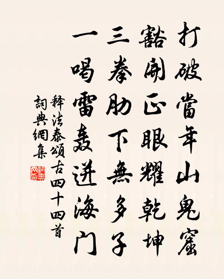 詩詞名句歷史字典書法欣賞書法字典國語詞典說文解字康熙字典古漢語字典標 題 作 者 詩 句 頌古四十四首作者:釋法泰 朝代:宋代頌古四十四首原文打破當年山鬼窟,豁開正眼耀乾坤。三拳肋下無多子,一喝雷轟迸海門。詩詞問答問:頌古四十四首的作者是誰?答:釋法泰問:頌古四十四首寫於哪個朝代?答:宋代釋法泰頌古四十四首書法欣賞頌古四十四首書法作品詩詞推薦次韻張公遠二首張耒〔宋代〕襄王坐上微詞客,子建車前步水妃。瞥過低鬟流盼處,爭先含笑獨來時。東邊日下終無雨,闕上書時合有碑。腸斷玉晨口占周文璞〔宋代〕風鳴長史升天柏,草護仙翁瘞劍塋。瑞像殿前亡馬跡,養龍池上有鼉鳴。至日題江山驛黃公度〔宋代〕客里萍蓬愧此身,天涯風俗對茲辰。雲容山意商量雪,梅蕾葭灰漏洩春。歲晚旅懷元自惡,夜長歸夢為誰頻。遙憐送張五諲歸宣城王維〔唐代〕五湖千萬里,況復五湖西。漁浦南陵郭,人家春谷谿。欲歸江淼淼,未到草萋萋。憶想蘭陵鎮,可宜猿更啼。送鏡山僧游雪峰張至龍〔宋代〕海風迎鐵錫,半是水為程。故國往來熟,空門宿食清。舊房雲借住,早路月同行。象骨最高處,師今履似平。金鳳花趙蕃〔宋代〕既知梧留鳳,寧令鳳在笯。胡為五色羽,散作一庭花。贈惟政禪師蔣堂〔宋代〕禪客尋常入舊都,黃牛角上掛瓶盂。有時帶笠穿雲去,便好和雲作畫圖。雪十二韻李鹹用〔唐代〕六出凝陰氣,同雲指上天。結時風乍急,集處霰長先。草穗翹祥燕,陂樁葉白蓮。犬狂南陌上,竹醉小池前。樵徑柳梢青(玉水明沙)韓淲〔宋代〕玉水明沙。峰迴路轉,城倚橋斜。老我登臨,同誰酩酊,一望還賒。飛鴻杳靄天涯。但拚取、心情酒家。紫菊枝枝雨後有感戴復古〔宋代〕逐日愁聞雨,今朝喜遇晴。雲開山賣狀,月出海生明。天地有常理,古今無限情。靜中觀世變,安得見河清。依韻和元參政喜雨四首王珪〔唐代〕紫殿宵祈感聖憂,玉毫曾降梵王州。慈深三界雲常聚,法遍諸天雨自流。襏襫趁耕皆帝力,污邪滿載為民求。年年書憤蘇泂〔宋代〕黃葉冷颼颼,臨風搔白頭。江湖無老伴,天地有新愁。橐禁行鴛曉,榆關戰馬秋。平生忠孝意,到死不能休。效陶劉駕〔唐代〕兩曜無停馭,蓬壺應有墓。何況北邙山,只近市朝路。大恢生死網,飛走無逃處。白髮忽已新,紅顏豈如故。我有從潘丈求字二首趙蕃〔宋代〕摩挲石刻嘆微茫,孰若汗青移硬黃。几淨窗明肯遊戲,千金便當橐中裝。七十翁吟七言十首方回〔宋代〕莫笑衰頹七十翁,老來柔外尚剛中。評詩青眼時雖白,借酒蒼顏也自紅。輕薄交遊翻手雨,艱難仕宦打頭風。休官自靜教院晚步潩上韓維〔宋代〕雪盡岡頭路,風和臘後天。人安閒淡內,鳥下寂寞前。凍水晴初浪,荒城晚自煙。西橋車馬急,歸意尚留連。至新息寄信州王守孔武仲〔宋代〕熙熙樂國似登台,北圃南亭春事催。惆悵音塵難再會,瑞香應已繞檐開。公肅在東南三有書來未報聞其除司直以詩寄賀史堯弼〔宋代〕江北江南罷戰塵,兩階乾舞作昇平。河東五色真毛羽,九奏簫韶看一鳴。野趣亭汪莘〔宋代〕晚唐多處士,林亭足娛嬉。吾鄉盛儒冠,何園可棲遲。負者有不能,富者有不為。我窮不出門,出門復坐馳。此事送相里秀才之匡山國子監李中〔唐代〕氣秀情閒杳莫群,廬山游去志求文。已能探虎窮騷雅,又欲囊螢就典墳。目豁乍窺千里浪,夢寒初宿五峰雲。業成名句推薦深居俯夾城,春去夏猶清。李商隱《晚晴》 欲往從之雪雰雰,側身北望涕沾巾。張衡《四愁詩》 何處相逢,登寶釵樓,訪銅雀台。劉克莊《沁園春·夢孚若》 誰人背後無人說,哪個人前不說人?佚名《增廣賢文·上集》 專一則勝,離散則敗。尉繚《尉繚子·兵令上》 越人語天姥,雲霞明滅或可睹。李白《夢遊天姥吟留別 / 別東魯諸公》 諸葛大名垂宇宙,宗臣遺像肅清高。杜甫《詠懷古蹟五首·其五》 狡兔有三窟,僅得免其死耳。劉向《戰國策·齊四·齊人有馮諼者》 記得那年花下,深夜,初識謝娘時。韋莊《荷葉杯·記得那年花下》 三日柴門擁不開,階平庭滿白皚皚。柳宗元《酬王二十舍人雪中見寄》