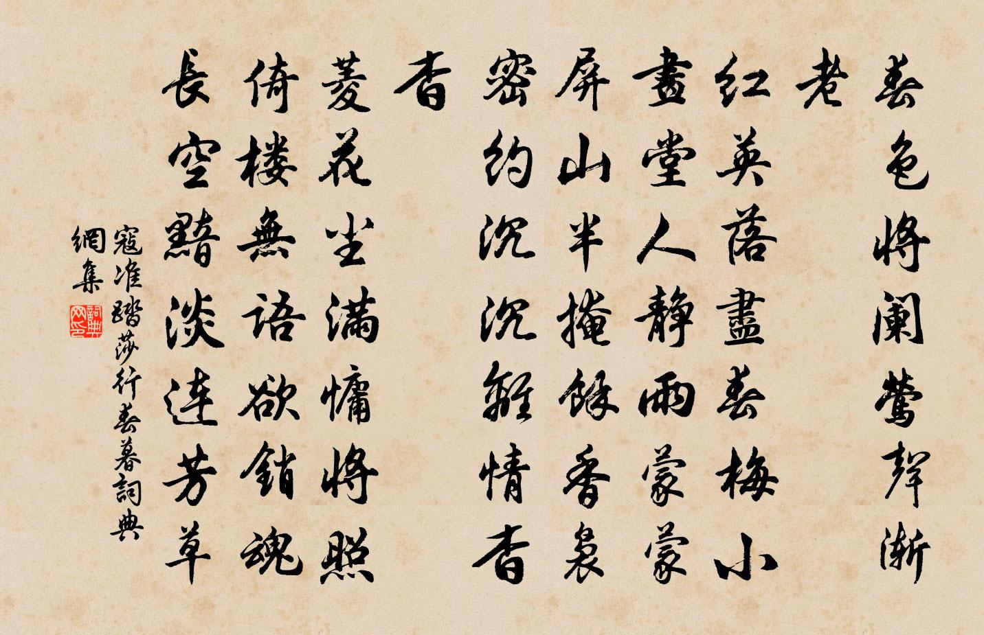 這首詞即景寫閨情,上片描繪暮春季節,微雨濛濛,寂寥無人的景象。下片寫兩地音書隔絕,閨中人倚樓遠望,只見芳草連天,陰雲蔽空,心中更覺憂鬱愁苦。詞風婉麗悽惻,清新典雅。