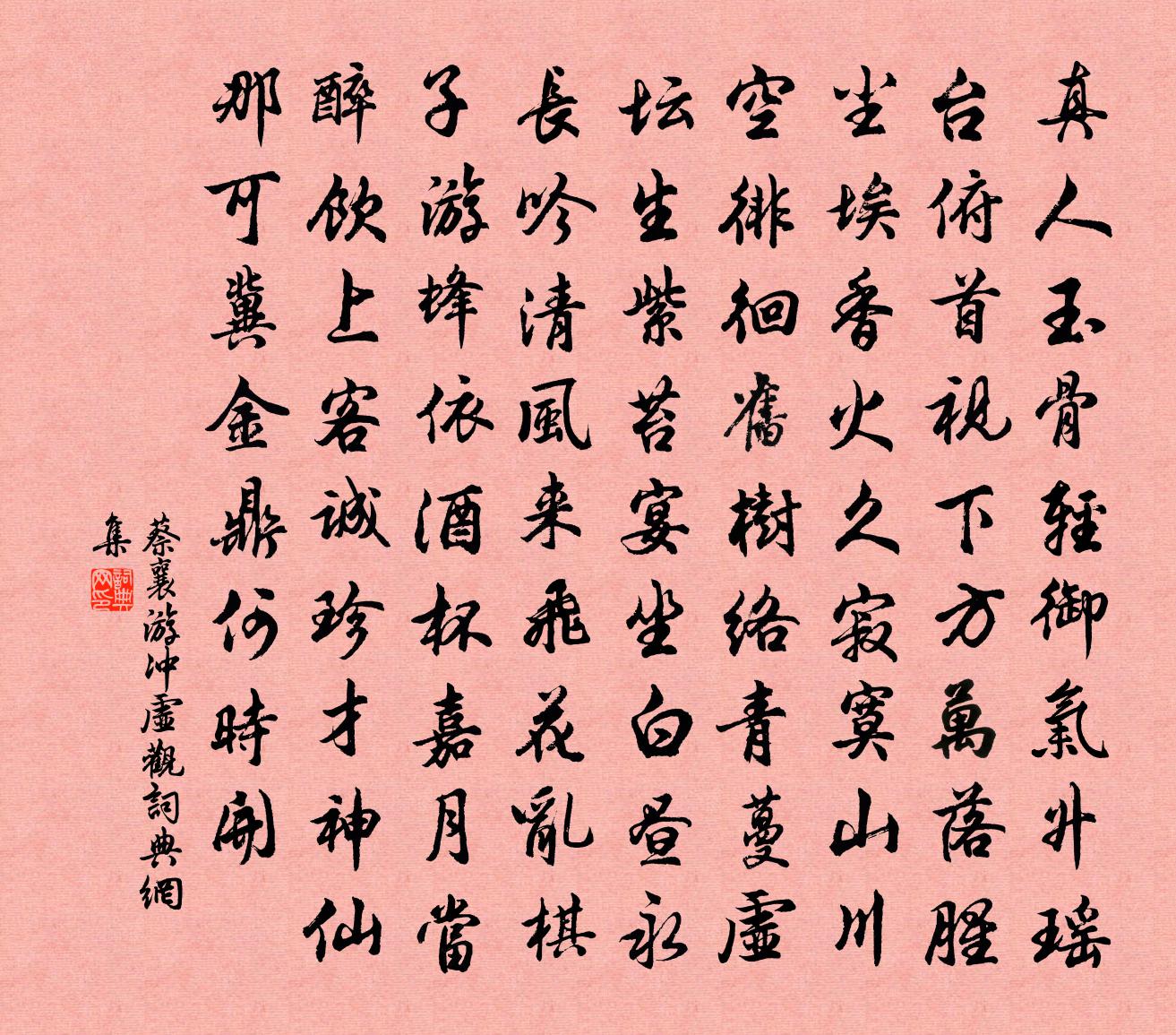 詩詞名句歷史字典書法欣賞書法字典國語詞典說文解字康熙字典古漢語字典標 題 作 者 詩 句 游沖虛觀作者:蔡襄 朝代:宋代游沖虛觀原文真人玉骨輕,御氣升瑤台。俯首視下方,萬落腥塵埃。香火久寂寞,山川空徘徊。舊樹絡青蔓,虛壇生紫苔。宴坐白晝永,長吟清風來。飛花亂棋子,游蜂依酒杯。嘉月當醉飲,上客誠珍才。神仙那可冀,金鼎何時開。詩詞問答問:游沖虛觀的作者是誰?答:蔡襄問:游沖虛觀寫於哪個朝代?答:宋代蔡襄游沖虛觀書法欣賞游沖虛觀書法作品詩詞推薦讀老莊張祜〔唐代〕等閒緝綴閒言語,夸向時人喚作詩。昨日偶拈莊老讀,萬尋山上一毫釐。思佳客陳亮〔宋代〕花拂闌乾柳拂空。花枝綽約柳鬟松。蝶翻淡碧低邊影,鶯囀濃香杪處風。深院落,小簾櫳。尋芳猶憶舊相逢。橋邊句朱京〔宋代〕削成雙峰玉骨清。省試夜(一作韋承貽詩)薛能〔唐代〕白蓮千朵照廊明,一片承平雅頌聲。更報第三條燭盡,文昌風景畫難成。杏園即席上同年曹鄴〔唐代〕岐路不在天,十年行不至。一旦公道開,青雲在平地。枕上數聲鼓,衡門已如市。白日探得珠,不待驪龍睡。匆匆譚賀州勉賦水仙花四絕曾豐〔宋代〕玉女瓊姬暫謫居,水中無可與為徒。蓮花固與六郎似,貞女終輕賤丈夫。游九曲方岳〔宋代〕掀蓬仰看玉崢嶸,借得漁船一日晴。九曲水窮山雨急,老仙於我豈無情。虞美人沈端節〔宋代〕去年寒食初相見。花上雙飛燕。今年寒食又花開。垂下重簾不許、燕歸來。隔簾聽燕呢喃語。似說相思苦。東君都醜奴兒慢盧祖皋〔宋代〕湘筠展夢,還是帶恨欹枕。對千頃、風荷涼艷,水竹清陰。半掩龜紗,幾回小語月華侵。娉婷何處,回首畫橋,朱送李寺丞宰藍田韓維〔宋代〕君誠岩壑徒,出宰亦山縣。尚喜終南峰,蒼翠不去眼。春風吹徵車,千里度灞滻。到日勝事繁,花光老秦甸。往時予有湖湘之游同年黃東發提舉以清江楮衾舒岳祥〔宋代〕我昔向湘潭,故人貽我別。珍於錦鯨贈,未數綈袍脫。溫如陽春曦,白似臘天雪。香收禪榻雲,光映書齋月。政爾嘉興九日寄丹陽親故權德輿〔唐代〕窮年路岐客,西望思茫茫。積水曾南渡,浮雲失舊鄉。海邊尋別墅,愁里見重陽。草露荷衣冷,山風菊酒香。獨謠悼色龍府君卷剛中〔宋代〕自古英豪在釣耕,先生傳後豈其卿。筆端不合窮天巧,名下須還缺勢榮。已見春風稱世夢,所留賢子是家聲。細吟排悶陸游〔宋代〕萬里風中寄斷蓬,古來虛死幾英雄?拔山力與回天勢,不滿先生一笑中。和答詩十首。答桐花白居易〔唐代〕山木多蓊鬱,茲桐獨亭亭。葉重碧雲片,花簇紫霞英。是時三月天,春暖山雨晴。夜色向月淺,暗香隨風輕。行者秋懷五首孫嵩〔宋代〕疇昔旅江湖,夜夜南飛雁。山園柿栗秋,出戶望河漢。祗今寒雁時,中夕起三嘆。山中雜興 其三王冕〔元代〕居山還有趣,□地本無謀。相顧誰青眼?同盟盡白頭。豺狼迷道路,猿鳥傍林丘。休問巢由樂,吾心自可求。無題韓偓〔唐代〕小檻移燈灺,空房鎖隙塵。額波風盡日,簾影月侵晨。香辣更衣後,釵梁攏鬢新。吉音聞詭計,醉語近天真。妝好舟中有賦陸游〔宋代〕一枝柔櫓聽咿啞,炊稻來依野老家。山寺日中齋鼓動,江樓風急酒旗斜。綠梢嫋嫋搖新竹,翠蔓離離熟早瓜。閒客紙被歌訓行童釋印肅〔宋代〕一片白雲掛在身,披時不許染紅塵。輕羅細想應難比,重錦尋思未可親。豈非顏色白如玉,成現都盧只一幅。紅窗名句推薦欲持一瓢酒,遠慰風雨夕。韋應物《寄全椒山中道士》 隋堤上、曾見幾番,拂水飄綿送行色。周邦彥《蘭陵王·柳》 無端嫁得金龜婿,辜負香衾事早朝。李商隱《為有》 四月清和雨乍晴,南山當戶轉分明。司馬光《客中初夏》 靖安宅里當窗柳,望驛台前撲地花。白居易《望驛台》 妙極生知,睿哲惟宰。精理為文,秀氣成采。劉勰《文心雕龍·徵聖》 山上層層桃李花,雲間煙火是人家。劉禹錫《竹枝詞九首·其九》 存科名之心者,未必有琴書之樂王永彬《圍爐夜話·第二六則》 人迷洞庭水,雁度瀟湘煙。李白《郢門秋懷》 今歲今宵盡,明年明日催。史青《應詔賦得除夜》