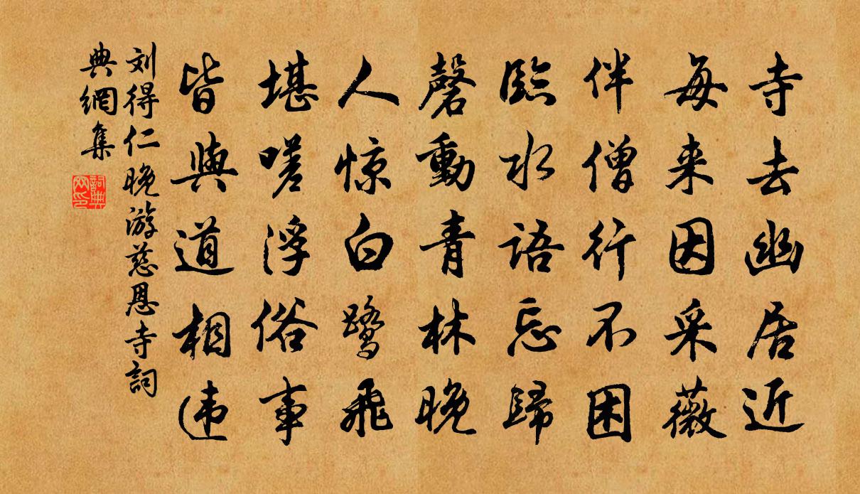 詩詞名句歷史字典書法欣賞書法字典國語詞典說文解字康熙字典古漢語字典標 題 作 者 詩 句 晚游慈恩寺作者:劉得仁 朝代:唐代晚游慈恩寺原文寺去幽居近,每來因採薇。伴僧行不困,臨水語忘歸。磬動青林晚,人驚白鷺飛。堪嗟浮俗事,皆與道相違。詩詞問答問:晚游慈恩寺的作者是誰?答:劉得仁問:晚游慈恩寺寫於哪個朝代?答:唐代問:晚游慈恩寺是什麼體裁?答:五律劉得仁晚游慈恩寺書法欣賞晚游慈恩寺書法作品注釋全唐詩:卷544-7詩詞推薦文叔轉送畏知初到長沙寄諸弟及示同志二詩次趙蕃〔宋代〕聞道湖南幕,人無第二流。文書有餘暇,風月可銷憂。夢遠寧能續,詩成謾益愁。幽庭步春草,雞撼屋山頭。次韻鄧成彥鄧肅〔宋代〕槍榆不羨貼天飛,冷落柴門半掩扉。花榭水軒催客老,飯囊酒瓮與心違。風流沈約自應瘦,美好陳平今已非。誰似劉仙石祖無擇〔宋代〕支機莫問君平肆,取履誰收黃石祠。深洞自開人不見,何須惆悵憶當時。西太一宮樓王安石〔宋代〕草際芙蕖零落,水邊楊柳欹斜。日暮炊煙孤起,不知魚網誰家。宮詞王珪〔唐代〕新供御馬可曾騎,青鬣連錢碧玉蹄。每到殿前祗候駕,金鞍卸下不聞嘶。奉和族祖紫嚴翁謾興十首汪炎昶〔宋代〕寒士勱苦行,不能動灶里。彼或外貌飾,即興時發齒。激獎道已微,孰振頹波起。和希深晚泛伊川梅堯臣〔宋代〕放溜下平波,舟移不知遠。稍回溪口風,恣愛雲中巘。水鳥靜相依,蘆洲藹將晚。歸路莫言賒,何妨乘月返。題藍道人畫梅詩軸任希夷〔宋代〕湖海知君歲月多,欲尋笙鶴問煙蘿。相逢一笑江南陌,聽徹絲桐聽踏歌。路傍樹馬戴〔唐代〕古樹何人種,清陰減昔時。莓苔根半露,風雨節偏危。蟲蠹心將穴,蟬催葉向衰。樵童不須翦,聊起邵公思。滿庭芳(木犀)李洪〔宋代〕香滿千岩,芳傳叢桂,小山曾詠幽菲。仙姿冷淡,不奈此香奇。翠葆層層障日,深愛惜、早被風吹。秋英嫩,夜來扇子詩李石〔宋代〕戰葉初收兩點稀,入簾花影碎晴暉。莫留一物遮人眼,展出青天放鶴飛。八月二十日曉起方回〔宋代〕夜闌不能寐,雞鳴垂欲三。起步秋月影,寒發何毿毿。斗柄落山北,參旗掛庭南。三五忽四五,蛙蚓眾喙緘。獨有題史子仁碧沚呂祖儉〔宋代〕相家小有四明山,更葺桃源渺莽間。四面樓台相映發,一川煙水自彎環。哭劉連江劉克莊〔宋代〕晚唐才調晉風期,一片胸襟頗涉奇。每過鄰家因貰酒,偶添別墅為贏棋。議郎秩淺無超拜,令尹官清有去思。種得七月十五日競傳有鐵騎八百來屠寧海人懼罹仙舒岳祥〔宋代〕年來避世羨漁郎,全載妻兒雲水張。隔葦鳴榔分細火,帶苔收網曬斜陽。一絲寒雨鱸腮紫,半箔歸潮蟹斗黃。欲逐武陵春(藤州江月樓)向滈〔宋代〕長記酒醒人散後,風月滿江樓。樓外煙波萬頃秋。高檻冷颼颼。想見雲鬟香霧濕,斜墜玉搔頭。兩處相思一樣愁。全真教隨喜方回〔宋代〕全真遺教契清寧,蕭散無為養性靈。百歲萍蓬無定跡,一身土木已忘形。陳言不用參同契,祠法何須急律令。中有曉霜成花日色淒淡炙背南檐記所聞見舒岳祥〔宋代〕十月二十月二日,霜凇成花泥淈淈。黑旗一點飛過村,成民縮頭那敢出。又聞鄞騎入連山,搜捕鄉兵火廬室。台明宿城南盛本道懷皇甫冉戴叔倫〔唐代〕暑夜宿南城,懷人夢不成。高樓邀落月,疊鼓送殘更。隔浦雲林近,滿川風露清。東碕不可見,矯首若為情。堂前種二桃詩示秬秸張耒〔宋代〕平昔殷勤向物華,誰知憔悴客天涯。雙桃栽罷還惆悵,憶得淮陽舊種花。名句推薦示上以足,示下以惠,怨自削減。來俊臣《羅織經·固榮卷第六》 君不見,高堂明鏡悲白髮,朝如青絲暮成雪。李白《將進酒》 三五明月滿,四五蟾兔缺。佚名《孟冬寒氣至》 八年十二月,五日雪紛紛。白居易《村居苦寒》 得成比目何辭死,願作鴛鴦不羨仙。盧照鄰《長安古意》 玉樹歌殘猶有曲,錦帆歸去已無家。曾棨《維揚懷古》 叩枻長歌,嫦娥欲下,萬里揮冰雪。趙秉文《大江東去·用東坡先生韻》 長江千里,煙淡水雲闊。李綱《六么令·次韻和賀方回金陵懷古鄱陽席上作》 君人者不可以不慎取臣,匹夫不可不慎取友。友者,所以相有也。荀子《荀子·大略》 長風連日作大浪,不能廢人運酒舫。元結《石魚湖上醉歌》