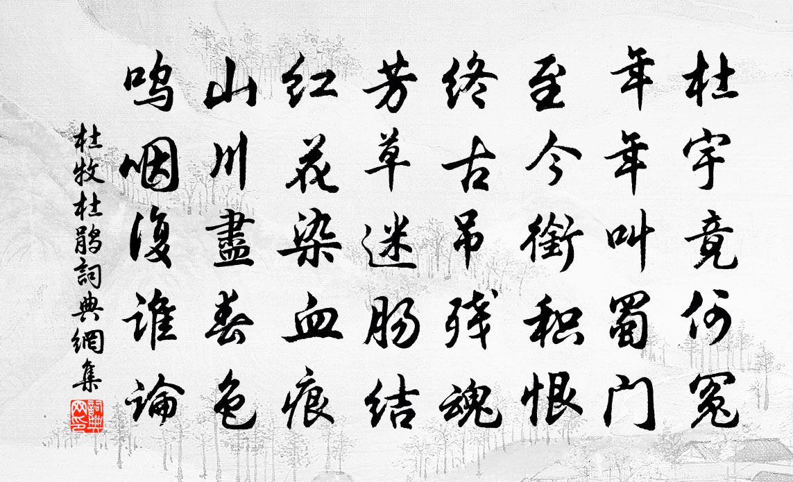 杜宇竟何冤,年年叫蜀門?至今銜積恨,終古吊殘魂。芳草迷腸結,紅花染血痕。