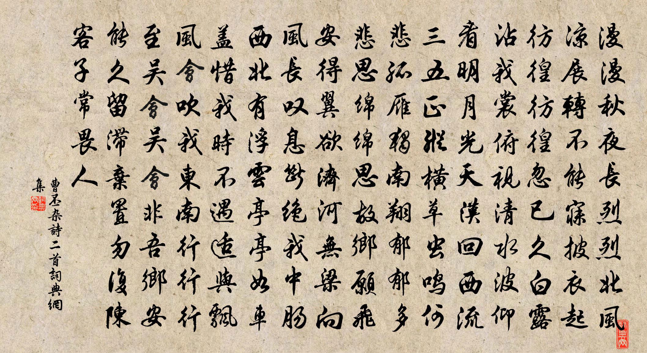 用“雜詩”做題名,開始於建安時期。《文選》李善註解釋這一題名說:“雜者,不拘流例,遇物即言,故云雜也。”也就是說,觸物興感,隨興寓言,總雜不類。所以,題為“雜詩,等於是無題,賦物言情,都是比較自由的。曹丕這兩首雜詩則是抒寫他鄉遊子的情懷。
