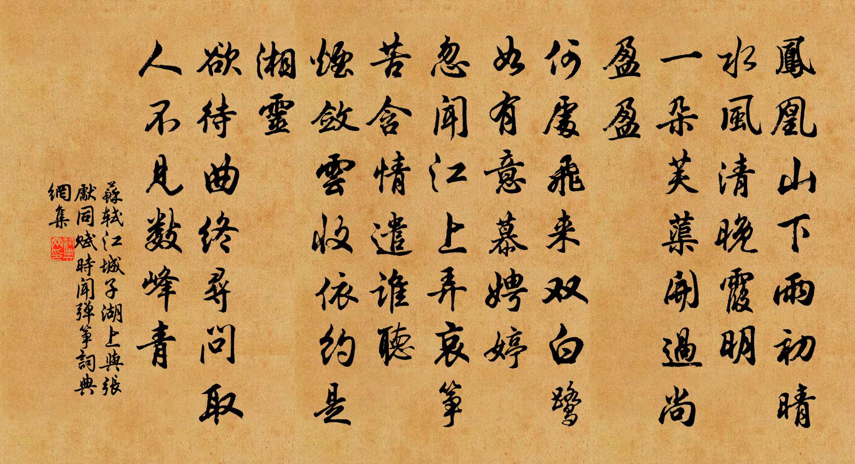 與此同時 ,“依約是湘靈”這總綰樂曲的一句,又隱喻彈箏人有如湘靈之美好。詞的最後,承“依約”一句正待寫人,卻又採取欲擒故縱的手法,不僅沒有正面去描寫人物,反而寫彈箏人已飄然遠逝,只見青翠的山峰仍然靜靜地立在湖邊,仿佛那哀怨的樂曲仍然蕩漾在山間水際 。“人不見,數峰青”兩句,用唐代詩人錢起《省試湘靈鼓瑟》詩“曲終人不見,江上數峰青 ”,是那樣的自然、貼切而又不露痕跡。它不僅意象動人 ,而且在結構上還暗承“ 依約是湘靈”一句,把上下用典結合起來 。“數峰青”又回應詞的開頭“鳳凰山下雨初晴”描寫的雨過山青的景象,真可謂言盡而味永。