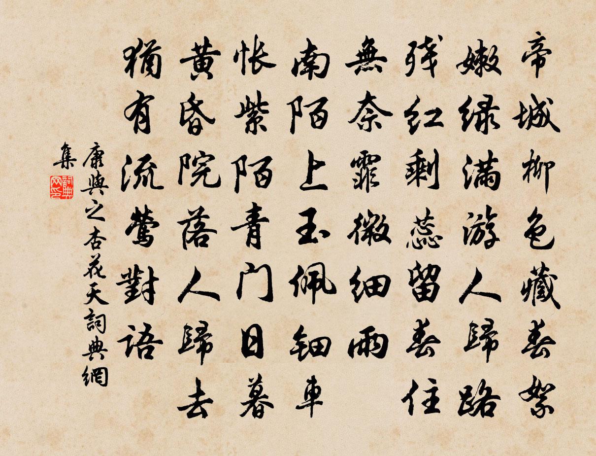 詩詞名句歷史字典書法欣賞書法字典國語詞典說文解字康熙字典古漢語字典標 題 作 者 詩 句 杏花天作者:康與之 朝代:宋代杏花天原文帝城柳色藏春絮。嫩綠滿、遊人歸路。殘紅剩蕊留春住。無奈霏微細雨。南陌上、玉佩鈿車,悵紫陌、青門日暮。黃昏院落人歸去。猶有流鶯對語。詩詞問答問:杏花天的作者是誰?答:康與之問:杏花天寫於哪個朝代?答:宋代問:杏花天是什麼體裁?答:詞康與之杏花天書法欣賞杏花天書法作品詩詞推薦牡丹任斯〔宋代〕日落簾垂春日長,懶晴天氣牡丹香。細看月面天然白,不必姚家宮樣黃。宮詞宋白〔宋代〕中使傳宣出未央,外宮庭燎髮榮光。怪來連夜摧儀注,元是平明同五王。黃盆渡次友人韻楊公遠〔宋代〕到得黃盆九月天,呼童弛擔駐征韉。迢迢江水天連楚,漠漠淮鄉稻滿田。酒旆風翻疎柳外,漁家綱曬夕陽邊。買將醉題陸游〔宋代〕生來避世傲公卿,海內無人識姓名。九節筇邊秋萬里,長明燈下雨三更。心安白髮何勞掃,藥熟黃金固可成。只待四和項安世〔宋代〕風節言言邁往,清詩字字高寒。奇古珊瑚碧樹,英明玉戚朱乾。連雨江漲二首蘇軾〔宋代〕越井岡頭雲出山,牂牁江上水如天。床床避漏幽人屋,浦浦移家蜑子船。龍捲魚蝦並雨落,人隨雞犬上牆眠。只應金山寺趙湘〔唐代〕眾木皆穿石,名香自合焚。兩廊吳分月,一閣楚天雲。雨過新燈露,潮平晚磬分。僧吟貝多偈,夜靜釣人聞。題光風霄月樓方鳳〔宋代〕人間底處無風月,知用何時最佳絕。芳播崇樓淑氣浮,影涵古桂清輝發。向來雅重無極翁,灑落襟懷與此同。去之頌一百則釋重顯〔宋代〕出草入草,誰解尋討。白雲重重,紅日杲杲。左顧無暇,右眄已老。君不見寒山子,行太早,十年歸不得,忘卻來唐律十首方岳〔宋代〕盡日此徘徊,青粘兩屨苔。鳥聲穿戶去,暝色過溪來。象齒劙鞭茁,銀刀罾繪材。空山人自老,醉眼向誰開。幼立弟死後簡寄幼能曾豐〔宋代〕動足燕巢幕,投身羝觸藩。驚風傷斷雁,落葉悟飛鳶。汝子頗難教,吾兒全未婚。重陽歸省罷,猶得對床論。仲行再示新句,複次韻述懷范成大〔宋代〕神仙懶學古浮丘,祖意慵參老趙州。四壁塵埃心似水,一生風露鬢先秋。病衰謹謝吳中客,技拙甘同楚國優。斥鷃武帝徐鈞〔宋代〕休道君王學苦空,要知積善福無窮。二梁猶僅存遺號,八相與唐同始終。初禪人持缽求傾釋正覺〔宋代〕佛事潛通興化門,用時斤斧莫成痕。全機超出輪迴際,一句拔除生死根。涼吹洗磨煩袂暑,素蟾排逐夜台昏。鵝王三山先賢祠落成八首熊禾〔宋代〕州牧風化遺,鄉賢典刊舊。年代較後先,人品類賢否。公議豈有情,祀典固非苟。道義思無疆,功言期不朽。詠竹月張玉孃〔宋代〕幽幽萬籟竹千竿,涼夜宜從自裹看。翠節參差訴玉兔,金波晃洋浴青鶯。半檐蒼月催詩思,一徑寒輝醒醉魂。吹徹卜運算元 譜太白詩語趙可〔元代〕明月在青天,借問今時幾。但見宵從海上來,不覺雲間墜。流水古今人,共看皆如此。惟願當歌對酒時,長照金尊夜檢故書得孫季蕃詞有懷其人二首劉克莊〔宋代〕中年豪宕以詞行,醉墨淋漓一座傾。昔競捧箋求少蘊,今誰瀝酒吊耆卿。戴花起舞生無悶,薦菊為餚死亦清。愁絕前用吉字韻問嚴子文疾再和問疾之詩不工甚矣崔敦禮〔宋代〕日來間何闊,坐見月初吉。欲往扣齋扉,政恐勞取瑟。聞公清淨緣,巧笑卻銀櫛。露骨秀寒松,烘晹嚥暖日。鍾乳送金簿解官歸天台五首金履祥〔宋代〕白雲蒼山東,歸驂邁長道。采采斑斕衣,怡怡華萼耀。俯仰浩無怍,歸來豈不好。正疑稅駕初,已有徵車召。努力名句推薦怠慢忘身,禍災乃作。荀子《荀子·勸學》 夸而有節,飾而不誣劉勰《文心雕龍·誇飾》 欲知悵別心易苦,向暮春風楊柳絲。李白《下途歸石門舊居》 天迥雲垂草,江空雪覆沙劉基《古戍》 西窗下,風搖翠竹,疑是故人來。秦觀《滿庭芳·碧水驚秋》 林臥愁春盡,開軒覽物華。孟浩然《清明日宴梅道士房 / 宴梅道士山房》 坐開桑落酒,來把菊花枝。杜甫《九日楊奉先會白水崔明府》 曲屏先暖鴛衾慣,夜寒深、都是思量。吳文英《風入松·為友人放琴客賦》 好水好山看不足,馬蹄催趁月明歸。岳飛《池州翠微亭》 醲肥辛甘非真味,真味只是淡無味洪應明《菜根譚·概論》