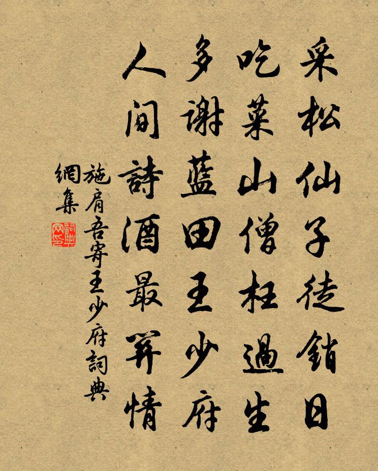 詩詞名句歷史字典書法欣賞書法字典國語詞典說文解字康熙字典古漢語字典標 題 作 者 詩 句 寄王少府作者:施肩吾 朝代:唐代寄王少府原文采松仙子徒銷日,吃菜山僧枉過生。多謝藍田王少府,人間詩酒最關情。詩詞問答問:寄王少府的作者是誰?答:施肩吾問:寄王少府寫於哪個朝代?答:唐代問:寄王少府是什麼體裁?答:七絕施肩吾寄王少府書法欣賞寄王少府書法作品注釋全唐詩:卷494-103詩詞推薦送王大校書孟浩然〔唐代〕導漾自嶓冢,東流為漢川。維桑君有意,解纜我開筵。雲雨從茲別,林端意渺然。尺書能不吝,時望鯉魚傳。依韻和吳沖卿新葺南齋梅堯臣〔宋代〕移病新秋厭直廬,自將僮僕治前除。已栽楚客江邊草,不學嚴陵瀨上魚。紅穗拂欄何蒨粲,綠叢無水亦蕭疏。從今次曾宏甫見寄韻曾幾〔宋代〕今晨尺書至,令我寸心寬。老去光陰速,人生會合難。竹輿雲洞暖,釣艇玉溪寒。小憩饒陽否,吾衰合掛冠。呈趙叔愚司理樂雷發〔宋代〕問戶垂楊句,江湖半世看。不應求五嶺,卻自建孤壇。浙社朋游盡,唐詩氣味寒。今朝流水譜,只可子期彈。遇南廂園叟感賦八十韻吳偉業〔清代〕寒潮沖廢壘,火雲燒赤岡。四月到金陵,十日行大航。平生遊宦地,蹤跡都遺忘。道遇一園叟,問我來何方。猶然峽山阻風李復〔宋代〕黃牛白馬渡驚灘,兩目盲飈更險艱。天地容身惟一榻,江湖駭浪動千山。豪商競利能爭捷,陰鬼多么故作慳。嘆息下竺周文璞〔宋代〕靜看唐人刻,相連坐石陰。鳥啼留客意,果熟住山心。野水流詩葉,天香襲道林。雲根有桂子,應待月中尋。長相思佚名〔宋代〕燕成雙。蝶成雙。飛去飛來楊柳旁。問伊因底忙。綠紗窗。篆爐香。午夢驚回書滿床。棋聲春晝長。寄吳拾遺齊己〔唐代〕新竹將誰榷重輕,皎然評里見權衡。非無苦到難搜處,合有清垂不朽名。疏雨晚沖蓮葉響,亂蟬涼抱檜梢鳴。野橋二月十七日偕賓暘市飲二首方回〔宋代〕無官豈畏犯金科,飲量真能海納河。人老自於春色淡,花開最恨雨聲多。向來伴侶今都盡,乃後光陰復幾何。更挈春日宴林亭陳襄〔宋代〕把灑春亭覽眾芳,水精簾箔逗山光。孤松冷落千年操,野槿紛華一日香。綠圃煙深迷蛺蝶,曲池波暖睡鴛鴦。文園鵲橋仙(五月四日仲遠浴兒)郭應祥〔宋代〕去年七夕,今年五日,兩見浴兒高會。乃翁種德已多年,看袞袞、公侯未艾。封胡羯末,綜維縝絳,堪羨金魚垂袋田制方岳〔宋代〕井田網變阡陌,網萬世以罪網秦。商君網信苛刻,不過民自民。漢名反秦火,當與三代鄰。今年田欲方,明年田欲王文伯將校藝漕闈過我取別肯作一夕飲酒竟猶彭龜年〔宋代〕已聞鼓篋無秦銳,肯為論文學賈留。奪我清風俄頃爾,夢回真若隔三秋。又次韻王珪〔唐代〕吟邊莫放酒杯乾,玉樹瓊樓不奈寒。授簡誰當梁苑賦,泛舟聊作剡溪看。但知盈尺占豐歲,豈為無氊笑冷官。想得歸長安許渾〔唐代〕三年何處淚汍瀾,白帝城邊曉角殘。非是無心戀巫峽,自緣□臂到長安。黔江水暖還曾飲,楚岫雲深不識寒。大抵病中排悶陸游〔宋代〕面骨崢嶸鬢雪新,承平版籍有遺民。心雖願繼無傳學,力不能支已廢身。開卷眼昏如隔霧,擁爐肺渴欲生塵。老龐雪程珌〔宋代〕北風傅信報登平,白帝宸游隨玉英。月下草玄疑蜀客,鼎邊得句失軒明。莊嚴東閣若為好,點綴南枝分外清。惟恨拜屺瞻墓有感馬廷鸞〔宋代〕我走金塘十五年,新年六十意悽然。扶藜策蹇趨廬下,洗盞將雛拜影前。蠹化不妨松飲露,鳳棲猶擬柏參天。微吟句吳璋〔宋代〕衣無錦繡勞心織,味乏膏粱困舌耕。名句推薦莎衫筠笠。正是村村農務急。盧炳《減字木蘭花·莎衫筠笠》 平岡細草鳴黃犢,斜日寒林點暮鴉。辛棄疾《鷓鴣天·陌上柔桑破嫩芽》 欲知方寸,共有幾許清愁,芭蕉不展丁香結。賀鑄《石州引·薄雨初寒》 東風不管琵琶怨。落花吹遍。許棐《後庭花·一春不識西湖面》 江碧鳥逾白,山青花欲燃。杜甫《絕句二首》 其出彌遠,其知彌少。老子《老子·德經·第四十七章》 山驛淒涼,燈昏人獨寢。陸游《清商怨·葭萌驛作》 為政之要,惟在得人。用非其才,必難致治。吳兢《貞觀政要·卷七·崇儒學》 野老念牧童,倚杖候荊扉。王維《渭川田家》 佇立傷神。無奈輕寒著摸人。朱淑真《減字木蘭花·春怨》