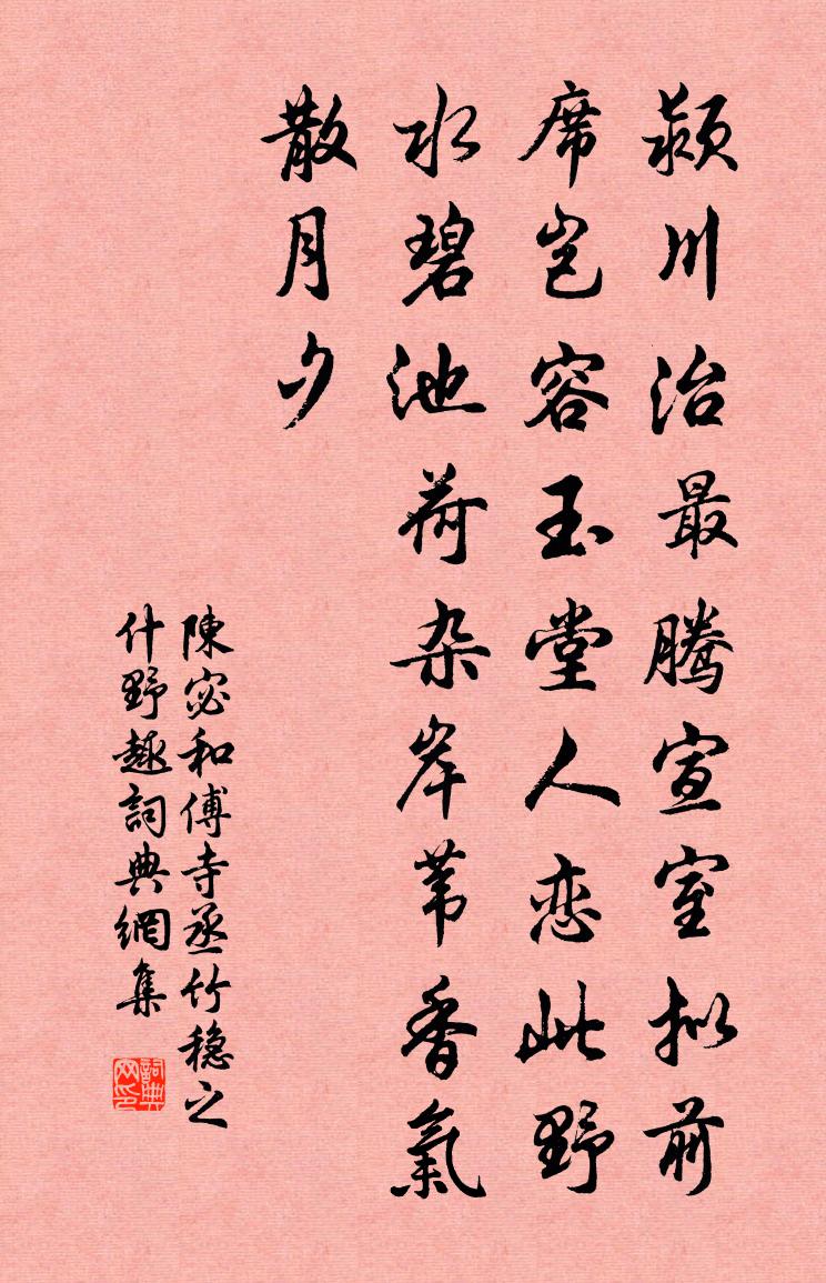 詩詞名句歷史字典書法欣賞書法字典國語詞典說文解字康熙字典古漢語字典標 題 作 者 詩 句 和傅寺丞竹穩之什野趣作者:陳宓 朝代:宋代和傅寺丞竹穩之什野趣原文潁川治最騰,宣室擬前席。豈容玉堂人,戀此野水碧。池荷雜岸葦,香氣散月夕。詩詞問答問:和傅寺丞竹穩之什野趣的作者是誰?答:陳宓問:和傅寺丞竹穩之什野趣寫於哪個朝代?答:宋代陳宓和傅寺丞竹穩之什野趣書法欣賞和傅寺丞竹穩之什野趣書法作品詩詞推薦句楊炎正〔宋代〕只今且為梅花醉。陳達獻菊花求頌釋印肅〔宋代〕滿地風光未足奇,霜前秋後吐金枝。靈山親舉唯迦葉,今日陳來眾共知。不獨陶生時節用,轉為華藏供阿彌。閒見送樊漕移帥瀘南李流謙〔宋代〕金龍直歲當玄冥,憶公剖竹江陽城。碧雞坊中駐千騎。裁詩餞送雙旌行。逢人到處說項斯,豈賤子故唯先盟。一官桐廬夜泊吳師道〔元代〕合江亭前秋水清,歸人罷市無餘聲。燈光隱見隔林薄,濕雲閃露青熒熒。樓台漸稀燈漸遠,何處 * 猶未斷?淒風醉下祝融峰林用中〔宋代〕祝融高處怯寒風,浩蕩飄凌震我胸。今日與君同飲罷,願狂酩酊下遙峰。與人游會潤州金山寺潘閬〔宋代〕浮生難會此,此寺絕塵埃。容易莫言去,等閒爭得來。江聲寒若吼,山色翠如堆。自是忘機者,憑闌不忍回。梁三朝雅樂歌 介雅 一沈約〔南北朝〕百福四象初。萬壽三元始。拜獻惟袞職。同心協卿士。北極永無窮。南山何足擬。雪後三首趙蕃〔宋代〕松竹夜枕聽,窗扉朝起看。雖成見晛喜,敢廢履冰難。照映形知穢,噓呵詩故寒。要難窮極覽,安得振飛翰。閒居秋日書事文同〔宋代〕秋雨晚蕭蕭,端居閒寂寥。雀飢爭配穗,蟬病落寒條。雲過茶煙沒,風歸硯水搖。惟當{言左右尼}圖史,閒日底丁寓田家有贈王維〔唐代〕君心印尚棲隱,印久欲傍歸印路。在朝印每為言,解印果成趣。晨雞鳴鄰里,群動從所務。農夫行餉田,閨妾起縫雪夜感懷吳殳〔明代〕酒盡燈殘夜二更,打窗風雪映空明。馳來北馬多驕氣,歌到南風盡死聲。海外更無奇事報,國中惟有旅葵生。不知山中三首劉應時〔宋代〕始看紅紫上花稍,倏忽春光半已消。最是幽窗斷魂處,杜鵑啼月過山腰。山中尋羽客不遇釋智圓〔宋代〕杖蔾尋隱跡,重疊過林泉。花暖幽禽語,堂空瑞獸眠。潤松寒有韻,茶爛冷無煙。知在何峰頂,高談會列仙。塵鏡詩庾信〔南北朝〕明鏡如明月。恆常置匣中。何須照兩鬢。終是一秋蓬。寄酬高輦推官齊己〔唐代〕道自閒機長,詩從靜境生。不知春艷盡,但覺雅風清。竹膩題幽碧,蕉乾裂脆聲。何當九霄客,重疊記無名。戰掉醜奴兒馬鈺〔元代〕茶來酒去人情事,匪道根由。惟獻惟酬。酒去無茶回奉休。便為讎。憐貧設粥非求報,建德如偷。更好真修。定是送蘇伯達之官西安七首李廌〔宋代〕湖山主人玉堂客,爾來華發故應多。安石雖雲江海士,元元蒼生將奈何。漢陽太白樓李群玉〔唐代〕江上層樓翠靄間,滿簾春水滿窗山。青楓綠草將愁去,遠入吳雲暝不還。挽知容詐明請陶公羅一鶚〔宋代〕月旦爭推重,邦人得范模。官資雖刺史,氣味一寒儒。簡淡根真性,清廉律薄夫。不知收卓行,曾入史編無。摸魚子許有孚〔元代〕買陂塘旋栽楊柳,新來已見成務。小山叢桂人如玉,何用為云為雨。懷北渚。悵渺渺予懷,目斷游龍嶼。憑誰寄語名句推薦小時了了,大未必佳。劉義慶《世說新語·言語》 渭城朝雨浥輕塵,客舍青青柳色新。王維《渭城曲 / 送元二使安西》 何處飛來林間鵲,蹙踏松梢微雪。辛棄疾《賀新郎·把酒長亭說》 章台柳,章台柳,昔日青青今在否?韓翃《章台柳·寄柳氏》 擬借寒潭垂釣,又恐鷗鳥相猜,不肯傍青綸。蘇舜欽《水調歌頭·滄浪亭》 能脫身牢籠外,便是大英雄。王永彬《圍爐夜話·第二八則》 淡盪春光寒食天。玉爐瀋水裊殘煙。李清照《浣溪沙·淡盪春光寒食天》 河邊獨自看星宿,夜織天絲難接續。王建《七夕曲》 一家之計在於和,一生之計在於勤。佚名《增廣賢文·上集》 卜以決疑,不疑何卜。李汝珍《鏡花緣·第十二回》