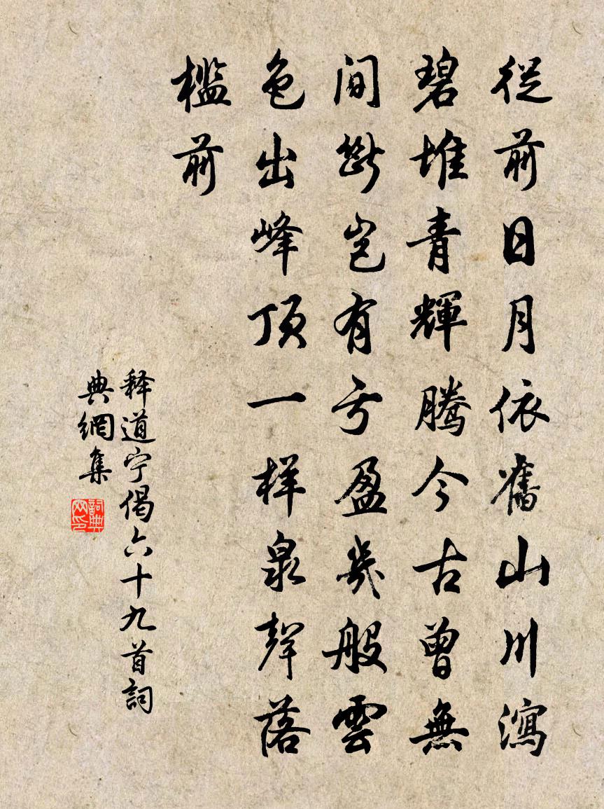詩詞名句歷史字典書法欣賞書法字典國語詞典說文解字康熙字典古漢語字典標 題 作 者 詩 句 偈六十九首作者:釋道寧 朝代:宋代偈六十九首原文從前日月,依舊山川。瀉碧堆青,輝騰今古。曾無間斷,豈有虧盈。幾般雲色出峰頂,一樣泉聲落檻前。詩詞問答問:偈六十九首的作者是誰?答:釋道寧問:偈六十九首寫於哪個朝代?答:宋代釋道寧偈六十九首書法欣賞偈六十九首書法作品詩詞推薦戲作樓鑰〔宋代〕二子為丞分越邑,女兒隨婿過江南。莫言屋裡成岑寂,匹似當初只住庵。登玄暢樓詩沈約〔南北朝〕危峯帶北阜。高頂發南岑。中有陵風榭。回望川之陰。岸險每增減。湍平互淺深。水流本三派。台高乃四臨。上有送張諷寺丞赴青州幕梅堯臣〔宋代〕朝廷久清明,賢相出賢牧。賢牧又選賢,森森備官屬。是以邦政修,良農播嘉穀。上無租賦逋,下有囷廩蓄。往者歷陽十詠之六天門山賀鑄〔宋代〕天門束箭流,北注據牛弩。淩高駐翠華,舟師燿威武。當時侍帷幄,誰復徵往古。虞舜有苗征,端為兩階舞。贈詹生謁徐徑坂趙汝騰〔宋代〕賢哉二生,不遠千里。瞻彼徑坂,今之泗水。予詩為容,有進無止。非殷洪喬,乃互鄉子。荊州書事二首楊時〔宋代〕江湖泛泛一虛舟,去作人間浪漫遊。歲晚光陰雲冉冉,畏途風雨日浮浮。萬鍾信是樊中雉,一棹聊同水上鷗。投老送許東傳李新〔宋代〕碧霄已覺少微明,帝所行看召老成。好夢謾依淮水去,秋風空見雪山輕。衣冠幾許披雲霧,父老於今識弟兄。黃閣小雨初霽陸游〔宋代〕歸來偶似老淵明,消渴誰憐病長卿?小雨染成芳草色,好風吹斷畫檐聲。剪燈院落晨猶冷,賣酒樓台晚旋晴。莫道垂虹亭米芾〔宋代〕斷雲一葉洞庭帆,玉破鱸魚金破柑。好作新詩寄桑薴,垂虹秋色滿東南。道源劉黻〔宋代〕父師兄弟一堂深,貌像如生世所欽。直向端倪明萬古,不專佔畢詔來今。地靈香火溪山護,嶺近衣冠嵐霧侵。各派登金山寺齊己〔唐代〕四面白波聲,中流翠嶠橫。望來堪目斷,上徹始心平。鳥向天涯去,雲連水國生。重來與誰約,題罷自吟行。九江逢盧員外韋莊〔唐代〕前年風月宿琴堂,大媚仙山近帝鄉。別後幾沾新雨露,亂來猶記舊篇章。陶潛豈是銅符吏,田鳳終為錦帳郎。莫怪指南錄後序文天祥〔宋代〕德祐二年二月十九日,予除右丞相兼樞密使,都督諸路軍馬。時北兵已迫修門外,戰、守、遷皆不及施。縉紳、大聞寇至初去柳州曾幾〔宋代〕剝啄誰敲戶,倉皇客抱衾。只看人似蟻,共道賊如林。兩岸論千里,扁舟抵萬金。病夫桑下戀,萬一有佳音。句吳光〔宋代〕獨鶴下隨雞飲啄,眾星高共月徘徊。峽中即事廉氏〔唐代〕清秋三峽此中去,鳴鳥孤猿不可聞。一道水聲多亂石,四時天色少晴雲。日暮泛舟溪漵口,那堪夜永思氛氳。送賀蘭廣赴選崔峒〔唐代〕而今用武爾攻文,流輩乾時獨臥雲。白髮青袍趨會府,定應衡鏡卻慚君。哭劉夫子於鵠〔唐代〕近問南州客,雲亡已數春。痛心曾受業,追服恨無親。孀婦歸鄉里,書齋屬四鄰。不知經亂後,奠祭有何人。六月八日遷寓侍郎橋方回〔宋代〕梧桐樓外雨蕭蕭,客里遷居意不聊。淨土偶鄰羅漢洞,閒人肯羨侍郎橋。蠹魚書少家何窘,行李船輕路匪遙。此□方太君生朝四首項安世〔宋代〕天邊歷草記年華,一日東風一莢花。春到平分爭一莢,庭萱吹出碧雲芽。名句推薦君子以言有物而行有恆。佚名《易傳·象傳下·家人》 婿為燕國王,身被詔獄加。李白《秦女休行》 治天下者當用天下之心為心,不得自專快意而已也。班固《漢書·傳·王貢兩龔鮑傳》 錦江春色來天地,玉壘浮雲變古今。杜甫《登樓》 雨足高田白,披蓑半夜耕。崔道融《田上》 雲中亂拍祿山舞,風過重巒下笑聲。杜牧《過華清宮絕句三首》 遠與君別者,乃至雁門關。江淹《古離別》 江上往來人,但愛鱸魚美范仲淹《江上漁者》 不是一番寒徹骨,怎得梅花撲鼻香!馮夢龍《醒世恆言·卷十七》 一事真,百事真。馮夢龍《醒世恆言·卷十六》