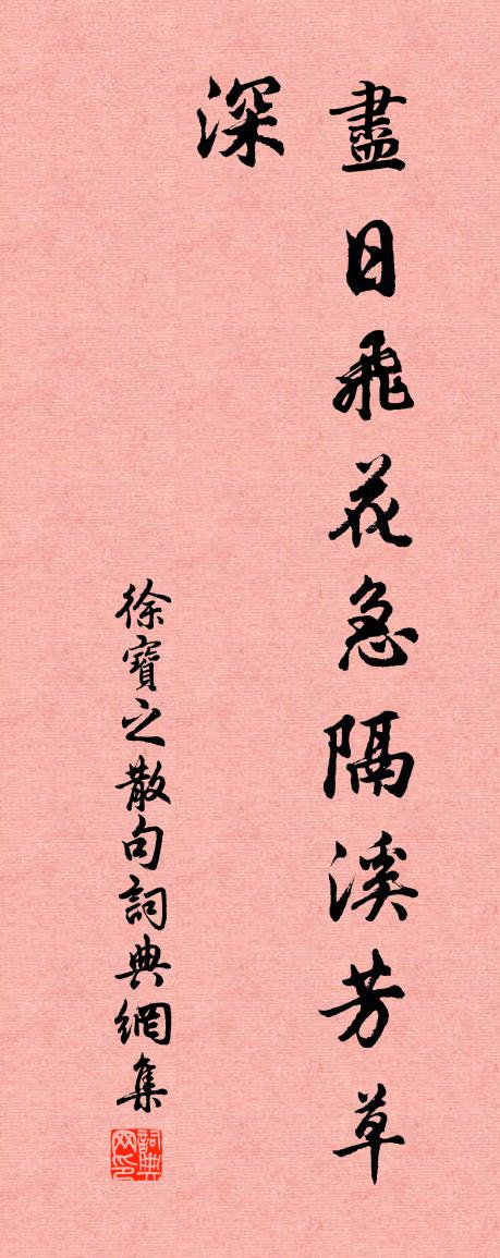 詩詞名句歷史字典書法欣賞書法字典國語詞典說文解字康熙字典古漢語字典標 題 作 者 詩 句 句作者:徐寶之 朝代:宋代句原文盡日飛花急,隔溪芳草深。詩詞問答問:句的作者是誰?答:徐寶之問:句寫於哪個朝代?答:宋代徐寶之句書法欣賞句書法作品詩詞推薦感懷王冕〔元代〕松柏引藤蘿,反被藤蘿繞。剗草養禾苗,禾苗不如草。物情有更變,世事何足道?君子小人交,豈能長永好?雲遊望蓬萊王哲〔元代〕聽我勸,公莫謾風流。猿馬不閒空踐野,光陰虛過度春秋。怎得免荒丘。如省悟,急急把心收。對景直須拋亡想,春帖子詞蘇軾〔宋代〕昨夜東風入律新,玉關知有受降人。聖恩與解河湟凍,共得中原草木春。學漁楊公遠〔宋代〕年來懶問是和非,謾向滄浪理釣磯。折取綠荷充蒻笠,收將紅芰緝蓑衣。秋風蓴菜鱸堪膾,春水桃花鱖正肥。身逐頌古釋道顏〔宋代〕面門出入見還難,無位真人只尺間。去路一身輕似葉,高名千古重如山。贈江西吳定夫劉宰〔宋代〕定夫江海士,瘦骨如臞仙。翩然及吾門,不假左右先。我方厭塵埃,一笑喜相延。肩縣兩破囊,既見始解纏。我欲方水滴子万俟紹之〔宋代〕質由良冶就,心向主人傾。外倣片金制,中藏勺水清。兔毫芳露染,龍尾濕雲生。終令雙眸炯,曾窺妙女成。子成兄年八十六史子久八十二舅氏八十一會於樓鑰〔宋代〕閭里舊遊能幾人,適齋猶有筆如神。莫言二老升沈異,各現宰官居士身。王鞏清虛堂蘇軾〔宋代〕清虛堂里王居士,閉眼觀身如止水。水中照見萬象空,敢問堂中誰隱几。吳興太守老且病,堆案滿前長渴睡。願君贈聽聲歐陽承務葉適〔宋代〕無心立臧否,有術驗榮衰。舉世聲中動,浮生骨還來。彈輕知福地,欬小應靈台。笑我老何及,是身惟死灰。再次交代韻四首袁說友〔宋代〕傳聞洞府鎖高清,探著詩成數啟扃。想見群仙書玉葉,更應交口嘆精靈。西風釋文珦〔宋代〕西風吹鬢鬢成霜,變異無端那有常。交友後先同昨夢,老人八十尚他鄉。書空雁字行疎密,泣砌蟲吟韻短長。儘是龜溪即事五首高斯得〔宋代〕父兄吳下宅,師友苕溪磯。亦欲從之游,煦濕相因依。睽孤諒無樂,旅瑣良可唏。古來遁世士,獨立取眾非。咨予句姚鍄〔宋代〕花枝冷濺昭陽雨,釣線斜牽太液風。次黃存之東皋韻黃文雷〔宋代〕負耒東皋下,溝塍稻秫分。污邪爭一溉,台笠事重耘。豳雅春稱壽,秦謳歲勞勤。無功虛作傳,農績未如君。登寶林佛閣次韻黃庚〔宋代〕曳杖陟高閣,登臨思渺然。閒身空歲月,老眼幾山川。落照明秋浦,飛帆濕暮煙。倚閣悵今昔,余恨付吟篇。和徐淵子九日開禧朝士〔宋代〕呼兒為我整烏紗,不是無心學孟嘉。要摘金英滿頭插,明朝還是過時花。游蘭溪 / 游沙湖蘇軾〔宋代〕黃州東南三十里為沙湖,亦曰螺師店。予買田其間,因往相田得疾。聞麻橋人龐安常善醫而聾。遂往求療。安常雖藉田詩蕭衍〔南北朝〕寅賓始出日。律中方星鳥。千畝土膏紫。萬頃陂色縹。嚴駕佇霞昕。浥露逗光曉。啟行天猶暗。伐鼓地未悄。蒼龍朝中措(代宋仲溫上德操)吳儆〔宋代〕文章聲價擅南州。人物更風流。豈久徒勞州縣,看看催上瀛洲。朱顏綠鬢,畫堂標王疑誤,寶帶垂鏐。睡起八磚影名句推薦來如春夢幾多時?去似朝雲無覓處。白居易《花非花》 風塵荏苒音書絕,關塞蕭條行路難。杜甫《宿府》 道傍榆莢仍似錢,摘來沽酒君肯否。岑參《戲問花門酒家翁》 四月十七,正是去年今日,別君時。韋莊《女冠子·四月十七》 樓台處處迷芳草,風雨年年怨落花。曾棨《維揚懷古》 和氏之璧,不飾以五采;隋侯之珠,不飾以銀黃。其質至美,物不足以飾之。韓非及後人《韓非子·解老》 外游者,求備於物;內觀者,取足於身。列子及其弟子《列子·仲尼》 松下問童子,言師採藥去。賈島《尋隱者不遇 / 孫革訪羊尊師詩》 目妄視則淫,耳妄聽則惑,口妄言則亂。劉安及其門客《淮南子·主術訓》 審定有無與其實虛,隨其嗜欲以見其志意。王詡《鬼谷子·捭闔》