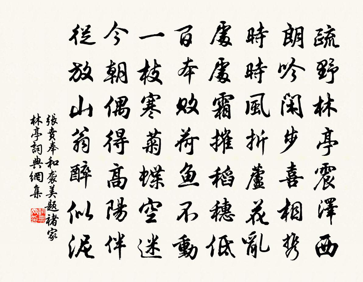 詩詞名句歷史字典書法欣賞書法字典國語詞典說文解字康熙字典古漢語字典標 題 作 者 詩 句 奉和襲美題褚家林亭作者:張賁 朝代:唐代奉和襲美題褚家林亭原文疏野林亭震澤西,朗吟閒步喜相攜。時時風折蘆花亂,處處霜摧稻穗低。百本敗荷魚不動,一枝寒菊蝶空迷。今朝偶得高陽伴,從放山翁醉似泥。詩詞問答問:奉和襲美題褚家林亭的作者是誰?答:張賁問:奉和襲美題褚家林亭寫於哪個朝代?答:唐代問:奉和襲美題褚家林亭是什麼體裁?答:七絕張賁奉和襲美題褚家林亭書法欣賞奉和襲美題褚家林亭書法作品注釋全唐詩:卷631-5詩詞推薦楊尚書和晴字韻詩適趨部宿再韻謝之魏了翁〔宋代〕冬令陰陰我獨晴,世間寒暑本思成。玉珂金鑰聲中睡,無限山林入耳聲。苕溪夜泛釋文珦〔宋代〕萍蹤人泛清苕去,水宿風餐幾度經。結網燈沈漁浦霧,待艐船泊酒家亭。樹頭號棲鷺疑殘雪,草上流螢似亂星。夜和孔教授武仲濟南四詠 環波亭蘇轍〔宋代〕南山迤邐入南塘,北渚岧嶢枕北牆。過盡綠荷橋斷處,忽逢朱檻水中央。鳧鷖聚散湖光淨,魚鱉噶瓦影涼。清境不韓祠三首劉克莊〔宋代〕萊相竹今供戌卒,武侯柏亦付胡兒。南來獨有昌黎木,神物千年尚護持。蓮子詩比成自覺醜甚戲題此作以解發君一笑耳龍輔〔宋代〕書罷題鍾字,要君知妝心。雖然非白雪,卻是重黃金。寄王仲衡尚書陳造〔宋代〕世態翻雲覆雨間,令人合眼夢還山。生平名義非肝膈,歲晚師門要面顏。鷗鷺波寬雖有約,鳳凰城近可容閒。留年流泉引李復〔宋代〕泉涓涓兮出重出,回抱山麓兮入於蒼淵。流來孔多兮自溢於林間,出始一勺兮下合成川。塍有稻兮壠有黍,聚以時步出城東門鄒登龍〔宋代〕步出城東門,與子各執手。遙望農累累,悲風發隴首。長松自青青,枯根帶骨朽。人生如朝露,嘉命那可久。世無偈公六十五首釋鹹傑〔宋代〕一手不獨拍,眾手鳴摑摑。豁開三要三玄門,堪與人天為軌開則。六月雨十一首許月卿〔宋代〕岫雲已喜能成雨,不卜先知今有秋。作楫作霖三說命,時暘時雨箕疇。數行竹樹清風夜,萬頃煙波明月洲。二客從次韻孔毅父久旱已而甚兩三首蘇軾〔宋代〕去年東坡拾瓦礫,自種黃桑三百尺。今年刈草蓋雪堂,日炙風吹面如墨。平生懶惰今始悔,老在勸農天所直。沛然次韻蘇主管青溪十絕句項安世〔宋代〕與君相別若耶溪,十載湘航與蜀梯。恰到六朝行樂處,台城東畔冶亭西。淡黃賈似道〔宋代〕淡黃生來腿腳白,三樣頭尖如琥珀。初秋鬭間最迷痴,末後逢強絕口敵。句馬擴〔宋代〕未敢此時非趙括,已愁他日類田豐。大聖樂(陶成之生日)蔣捷〔宋代〕笙月涼邊,翠翹雙舞,壽仙曲破。更聽得艷拍流星,慢唱壽詞初了,群唱蓮歌。主翁樓上披鶴氅,展一笑、微微紅五君詠五首魏齊公元忠張說〔唐代〕齊公生人表,迥天聞鶴唳。清論早揣摩,玄心晚超詣。入相廊廟靜,出軍沙漠霽。見深呂祿憂,舉後陳平計。甘心已亥雜詩 68龔自珍〔清代〕北游不至獨石口,東遊不至盧龍關。此記游耳非著作,馬蹄蹀躞書生孱,齊藉田樂歌 迎送神升歌江淹〔南北朝〕羽鑾從動。金駕時游。教騰義鏡。樂綴前修。率先丹耦。躬遵綠疇。靈之聖之。歲殷澤柔。大衍易吟四十首方回〔宋代〕易乃一量秤,銖銖分重輕。百千億萬事,義理是權衡。題明月堂舒坦〔宋代〕郢匠由來巧運斤,清光那復隔織塵。九秋萬里雲頭路,半夜千峰頂上人。坐見乾坤入肝膽,陡驚草木亦精神。應憐名句推薦侵陵雪色還萱草,漏泄春光有柳條。杜甫《臘日》 風流才子多春思,腸斷蕭娘一紙書。楊巨源《崔娘詩》 湖水無端浸白雲,故人書斷孤鴻沒。黃庭堅《秋懷二首》 半夜銜枚,滿城深雪,忽已亡懸瓠。李綱《念奴嬌·憲宗平淮西》 借問此何時?春風語流鶯。李白《春日醉起言志》 歸雁橫秋,倦客思家。張可久《折桂令·九日》 道之以政,齊之以刑,民免而無恥。孔子弟子《論語·為政篇》 酒濃春入夢,窗破月尋人。毛滂《臨江仙·都城元夕》 狎浪兒童,橫江士女,笑指漁翁一葉輕。吳偉業《沁園春·觀潮》 性孤高似柏,阿嬌金屋。陸容《滿江紅·詠竹》