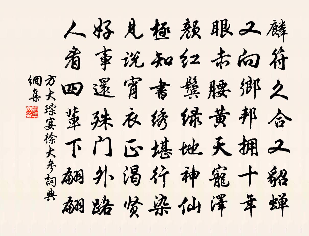 詩詞名句歷史字典書法欣賞書法字典國語詞典說文解字康熙字典古漢語字典標 題 作 者 詩 句 宴徐大參作者:方大琮 朝代:宋代宴徐大參原文麟符久合又貂蟬,又向鄉邦擁十年。眼赤腰黃天寵澤,顏紅鬢綠地神仙。極知書繡堪行染,見說宵衣正渴賢。好事還殊門外路,人看四輩下翩翩。詩詞問答問:宴徐大參的作者是誰?答:方大琮問:宴徐大參寫於哪個朝代?答:宋代方大琮宴徐大參書法欣賞宴徐大參書法作品詩詞推薦感皇恩(旅思)陸蘊〔宋代〕殘角兩三聲,催登古道。遠水長山又重到。水聲山色,看盡輪蹄昏曉。風頭日腳下,人空老。匹馬舊時,西征談笑次韻永堂沈說〔宋代〕鶯聲未改春,葉底一蟬新。幻境老無夢,醉鄉詩有神。整巾因把鏡,懶語怕逢人。似此衰遲者,勞君料理頻。蓮石白居易〔唐代〕青石一兩片,白蓮三四枝。寄將東洛去,心與物相隨。石倚風前樹,蓮栽月下池。遙知安置處,預想發榮時。領郡人月圓 雪中游虎丘 北曲聊樂府前集今張可久〔元代〕梅花渾似真真面,留我倚闌乾。雪晴天氣,松腰玉瘦,泉眼冰寒。興亡遺恨,一丘黃土,千古青山。老僧同醉,殘後九首劉克莊〔宋代〕吾今垂老示疾,君昔與人作緣。尚能續華佗傳,何敢負宋清錢。秋暮言志李世民〔唐代〕朝光浮燒野,霜華淨碧空。結浪冰初鏡,在徑菊方叢。約嶺煙深翠,分旗霞散紅。抽思滋泉側,飛想傅岩中。已獲頌古三十八首釋慧方〔宋代〕添得溈山笑轉新,當時覿面已呈君。明招漏泄溈山句,無限風光付與人。詠絲桐陽枋〔宋代〕地闊天寬人一般,琴心會得語言難。高山流水知音少,月白風清時自彈。贈六安文殊亮老王之道〔宋代〕我從布東蓼來,布水竹遂幽布討。崎嶇布至於六,獲見文殊老。文殊方外友,僧門素稱寶。平生首肯處,可嗣布禪雪後陳起〔宋代〕青山當戶牖,雪後非吾有。為問謝家池,綠波還在否。答次休上人白居易〔唐代〕姓白使君無麗句,名休座主有新文。禪心不合生分別,莫愛餘霞嫌碧雲。依韻酬吳春卿二首其一鶴范仲淹〔宋代〕華亭孤立病時身,終日徘徊尚海濱。露掌思高還警夜,芝田音斷欲務春。千年靈氣何求藥,八變奇姿已過人。莫厭過水車鋪二首楊萬里〔宋代〕轎里看書得晝眠,夢中驚浪撼漁船。覺來書捲風吹亂,忘卻前篇與後篇。平原郡王南園詩二十一首鮮霞姜特立〔宋代〕蟠桃花發景爭新,流水漂香幾換春。洞口霞光長蔽日,須知中有武陵人。憶秦娥朱敦儒〔宋代〕歌鍾列。公堂盛會酬佳節。酬佳節。皇恩宣布,早梅爭發。舞場椎鼓催回雪。金壺镟酒瓊酥熱。瓊酥熱。今朝不飲大人詞楊維楨〔元代〕有大鐵人,曰鐵牛鐵。絳人鐵甲子不能鐵記,曾識庖棲獸尾而蓬頭。見鍊石之女補天漏,涿鹿之帝殺蚩尤。上與伊病目作近體詩五首晁說之〔宋代〕病目經旬作夢中,只應天意欲教慵。詩成願作瞎太祝,位極恥為盲老公。不用千憂徒畫足,何妨一笑謾書空。頗不浣溪沙(再用前韻寄曾吉甫運使)向子諲〔宋代〕靄靄停雲覆短牆。夭夭臨水自然芳。猗猗無處著清香。珍重驀山溪句好,尊前頻舉不相忘。濠梁夢蝶盡春狂。奉送三榮王子文游益昌度正〔宋代〕料得人人喜自新,爾民元是漢人民。君王仁對於天下,元帥慈祥也似春。浴罷李處權〔宋代〕泉湯瀹膚垢如失,振衣坐覺神充實。挹其寒冽事清盥,三嚥逾甘過飴蜜。華清之池故有名,玉蓮出水香霧生。可憐名句推薦金吾不禁夜,玉漏莫相催。蘇味道《正月十五夜》 問別來、解相思否。吳文英《惜秋華·七夕前一日送人歸鹽官》 梅落繁枝千萬片,猶自多情,學雪隨風轉。馮延巳《鵲踏枝·梅落繁枝千萬片》 神女生涯原是夢,小姑居處本無郎。李商隱《無題·重幃深下莫愁堂》 明月照高樓,流光正徘徊。曹植《七哀》 山外青山樓外樓,西湖歌舞幾時休?林升《題臨安邸》 長袖善舞,多錢善賈。韓非及後人《韓非子·五蠹》 燕子來時新社,梨花落後清明。晏殊《破陣子·春景》 林下春晴風漸和,高崖殘雪已無多。王守仁《春晴》 長堤春水綠悠悠,畎入漳河一道流。王之渙《宴詞》