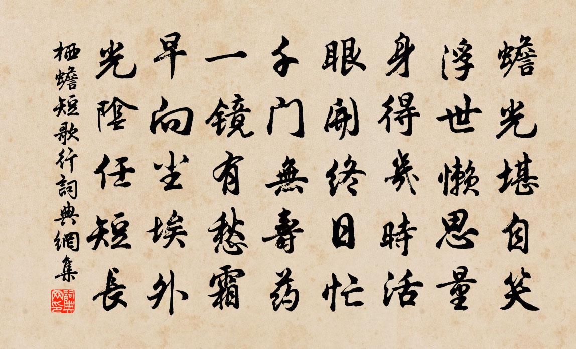 詩詞名句歷史字典書法欣賞書法字典國語詞典說文解字康熙字典古漢語字典標 題 作 者 詩 句 短歌行作者:棲蟾 朝代:唐代短歌行原文蟾光堪自笑,浮世懶思量。身得幾時活,眼開終日忙。千門無壽藥,一鏡有愁霜。早向塵埃外,光陰任短長。詩詞問答問:短歌行的作者是誰?答:棲蟾問:短歌行寫於哪個朝代?答:唐代問:短歌行是什麼體裁?答:樂府棲蟾短歌行書法欣賞短歌行書法作品注釋全唐詩:卷848-49詩詞推薦晉祠歐陽修〔宋代〕古城南出十裡間,鳴渠夾路何潺潺。行人望祠下馬謁,退即祠下窺水源。地靈草木得余潤,鬱郁古柏含蒼煙。並兒舟中作陸游〔宋代〕晤語無人與遣愁,出門聊復弄輕舟。山穿煙雨參差出,水赴陂塘散漫流。隔葉雄雌鳴谷鳥,傍林子母過吳牛。數家周十三丈約同馬三丈入青原山賦詩五首以記行趙蕃〔宋代〕渡江不待餉,勝士約三行。夢境故常在,重來年漫更。又成春霧掃,何日野田耕。要向思公問,燈明香縷橫。東武二首張舜民〔宋代〕小白獎周室,夷吾致其君。各竭當時力,未免後儒言。駿馬日千里,壯士舉百鈞。更欲加勉策,折髀與摧轅。中秋月薛瑩〔唐代〕三十六旬盈復缺,百年堪喜又堪傷。勸君莫惜登樓望,雲放嬋娟不久長。贈羽士陳宓〔宋代〕獨擅茲山四十年,凝之去後見君賢。羽衣時向雲間去,為愛飛泉不肯仙。挽王厚齋尚書牟巘五〔宋代〕清要三朝望,文章一世榮。掌綸夸獨直,荷橐青群英。石室資殫洽,金賴闡所明。孤臣傷暮景,風雨自雞鳴。宿天竺寺曉發羅源戴叔倫〔唐代〕黃昏投古寺,深院一燈明。水砌長杉列,風廊敗葉鳴。山雲留別偈,王事速歸程。迢遞羅源路,輕輿候曉行。黃太守元授輓詞二首楊萬里〔宋代〕我忝通家子,公如父行親。一書雖不欠,半面遂無因。旅櫬千江遠,銘旌兩竹新。慶門寧有此,造物豈其仁。霅山和丹岩晚春韻衛宗武〔宋代〕二阮當年總解詩,夷吾父子亦能棋。家庭粗有消閒樂,未似登山臨水時。送顧八分文學適洪吉州杜甫〔唐代〕中郎石經後,八分蓋憔悴。顧侯運爐錘,筆力破餘地。昔在開元中,韓蔡同贔屓。玄宗妙其書,是以數子至。御札贈希孝黃庭堅〔宋代〕金玉雖滿堂,一去誰能守。石交千秋期,程嬰報杵臼。絲隨丹青染,變態非復舊。竹杖寒蒼蒼,草木黃落後。匏從和臨清閣趙希逢〔宋代〕蔬羹相對潑油蔥,無事依僧萬慮空。強拾放心看語錄,肯將老眼犯塵紅。本來無物台非鏡,會得何心幡動風。料想階前石竹王績〔唐代〕上天布甘雨,萬物鹹均平。自顧微且賤,亦得蒙滋榮。萋萋結綠枝,曄曄垂朱英。常恐零露降,不得全其生。嘆息言志唐寅〔明代〕不鍊金丹不坐禪,不為商賈不耕田。閒來寫就青山賣,不使人間造孽錢!去歲十月六日由番江向安仁今歲十月回自廣信喻良能〔宋代〕去歲茲晨離楚東,今年飛蓋上晴空。煙雲晻靄江天暮,一笑都如夢寐中。如夢令朱敦儒〔宋代〕莫恨中秋無月。月又不甜不辣。幸有瓮頭春,閒坐暖雲香雪。香雪。香雪。滿引水晶蕉葉。見劉秀才與池州妓別杜牧〔唐代〕遠風南浦萬重波,未似生離別恨多。楚管能吹柳花怨,吳姬爭唱竹枝歌。金釵橫處綠雲墮,玉箸凝時紅粉和。待得送使廣州張九齡〔唐代〕家在湘源住,君今海嶠行。經過正中道,相送倍為情。心逐書郵去,形隨世網嬰。因聲謝遠別,緣義不緣名。呈謝資深縣丞源趙蕃〔宋代〕平生夢寐臨川郡,故在溪堂竹友齋。句法已看行世集,風聲猶得起人懷。有孫住著園依水,薄宦舊來松儼槐。縱是名句推薦縱然生得好皮囊,腹內原來草莽。曹雪芹《紅樓夢·第三回》 寧教我負天下人,休教天下人負我。羅貫中《三國演義·第四回》 李白如今已仙去,月在青天幾圓缺?唐寅《把酒對月歌》 飯疏食飲水,曲肱而枕之,樂亦在其中矣。不義而富且貴,於我如浮雲。孔子弟子《論語·述而篇》 曲岸持觴,垂楊系馬,此地曾經別。辛棄疾《念奴嬌·書東流村壁》 年華共,混同江水,流去幾時回納蘭性德《滿庭芳·堠雪翻鴉》 香消翠減,雨昏煙暗,芳草遍江南。喬吉《小桃紅·春閨怨》 舟非水不行,水入舟則沒佚名《孔子家語·六本》 搖落深知宋玉悲,風流儒雅亦吾師。杜甫《詠懷古蹟五首·其二》 樓台處處迷芳草,風雨年年怨落花。曾棨《維揚懷古》