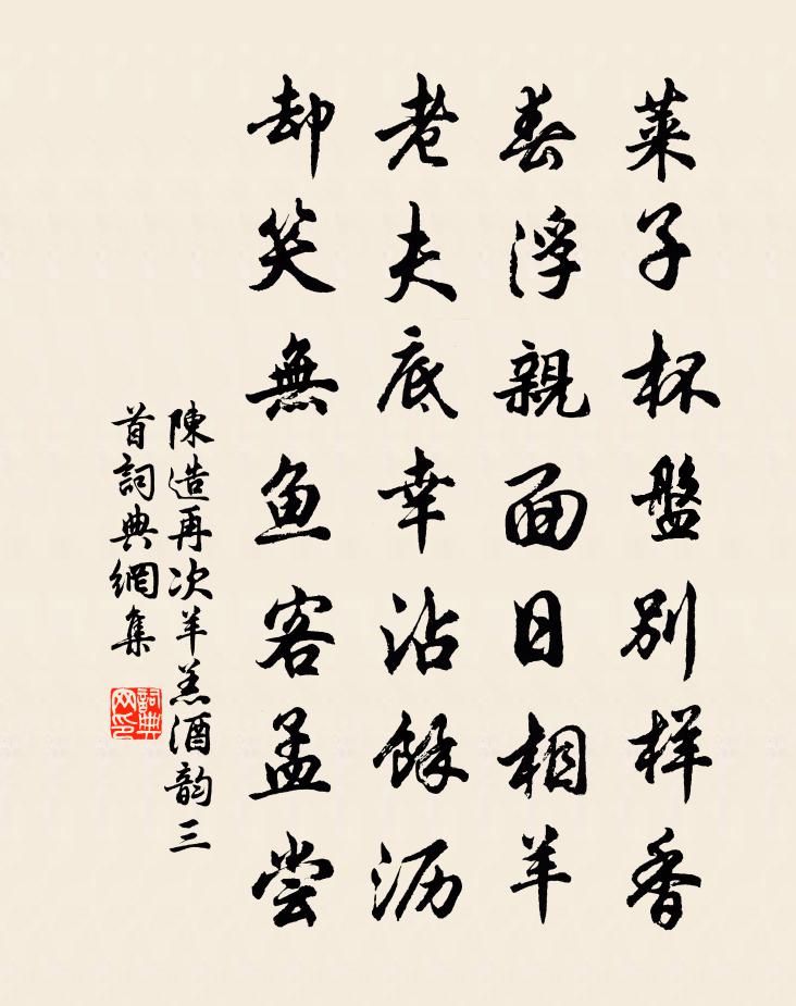 詩詞名句歷史字典書法欣賞書法字典國語詞典說文解字康熙字典古漢語字典標 題 作 者 詩 句 再次羊羔酒韻三首作者:陳造 朝代:宋代再次羊羔酒韻三首原文萊子杯盤別樣香,春浮親面日相羊。老夫底幸沾餘瀝,卻笑無魚客孟嘗。詩詞問答問:再次羊羔酒韻三首的作者是誰?答:陳造問:再次羊羔酒韻三首寫於哪個朝代?答:宋代陳造再次羊羔酒韻三首書法欣賞再次羊羔酒韻三首書法作品詩詞推薦和樓樞密過洛陽感舊二絕鄭剛中〔宋代〕十年滓穢已澄清,訪舊寧須得便行。早辟關中奉高租,重興禮樂定章程。雜詩張彪〔唐代〕富貴多勝事,貧賤無良圖。上德兼濟心,中才不如愚。商者多巧智,農者爭膏腴。儒生未遇時,衣食不自如。久與酬朱慶餘張籍〔唐代〕越女新妝出鏡心,自知明艷更沉吟。齊紈未是人間貴,一曲菱歌敵萬金。依韻酬葛秋岩陶體四首釋文珦〔宋代〕吾生一無營,終日衡門下。棲遲已成東,豈羨台與榭。相彼常汲汲,而我獨多暇。時聽蜾祝兒,於以知物化。夜坐張紹文〔宋代〕金鴨香殘酒半醒,夜深寒月過西欞。可憐心事無人識,詩眼與燈相對青。頌古釋慧空〔宋代〕錢塘潮頭來,成都藥市集。叵尀汝州風,吹落毛僧笠。諭子美淵明詩施德操〔宋代〕子美學古胸,萬卷郁含蓄。遇事時一麾,百怪森動目。淵明淡無事,空洞撫便腹。物色入眼來,指點詩句足。彼直滿庭芳陳瓘〔宋代〕擾擾匆匆,紅塵滿袖,自然心在溪山。尋思百計,真箇不如閒。浮世紛華夢影,囂塵路、來往循環。江湖手,長安煎筍釋法薰〔宋代〕錦繡乍脫玉為肌,更著油煎供養伊。鹽醋費他多少了,舌頭換卻不曾知。漁家傲可旻〔宋代〕人世罪冤知底數。前程不是無冥府。爭似靜焚香一炷。無行住。聲聲稱念彌陀父。罪業盡消生有處。彌陀願力堪憑凌歊台六首吳芾〔宋代〕莫辭千騎小徘徊,共上凌歊百尺台。過雨江山新似洗,連天草樹翠成堆。搜羅好景歸詩句,斷送閒愁付酒杯。對此癸酉春僑居無為寺歸雲閣以十五遊方今五十為釋行海〔宋代〕十五遊方今五十,羞將白髮對春風。故園泉石情長在,近日江湖趣不同。鶯友怕寒拋柳巷,蜂臣探暖到花叢。芳菲題天清寺安上人北軒賀鑄〔宋代〕南城繁氏台,維昔孝王築。歌吟寂無聞,萬楹聯佛屋。道人開北牖,俯就百喬木。八月鳴青蟬,槐蛾委平綠。客來予欲自嚴買船下七里灘謁嚴光祠而歸會灘淺陸陸游〔宋代〕客星祠下渺煙波,欠我扁舟舞短蓑。不為窮冬怕灘惡,正愁此老笑人多。翠微山居八首趙彥端〔宋代〕豈是栽松待茯苓,且圖山色鎮長青。他年行腳不歸去,留與人間作畫屏。記夢喻良能〔宋代〕小窗幽閣睡初勻,夢到鈞天侍紫宸。盤號搯桃真異器,果名黃棗豈常珍。殊恩並浹鴒原弟,美味初嘗鶴髮親。願竭和立齋元日韻王柏〔宋代〕之子善游遠,西征酹歐陽。亹亹歲月換,作詩思故鄉。老我絕世念,孤燈耿寒光。坐對三古書,繹繹搴純英。天地游王壽山蔡蒙古〔宋代〕王壽山頭石徑斜,不知何處有仙家。煙霞踏遍芒鞋破,一路春鳩啼落花。牧牛兒陸游〔宋代〕南村牧牛兒,赤腳踏牛立,衣穿江風冷,笠敗山雨急。長陂望若遠,隘巷忽相及。兒歸牛入欄,煙火茆檐濕。酹江月(趙氏席間即事,再用坡韻)劉辰翁〔宋代〕四無誰語,待推窗、初見江南風物。索笑巡檐無奈處,悄隔東鄰一壁。有酒如船,招呼滿載,只欠枝頭雪。疏花冷名句推薦新來雁闊雲音,鸞分鑒影,無計重見。盧祖皋《宴清都·初春》 一葉度春風,芳芳自相接。蕭衍《芳樹》 盡日空濛無所見,雁行斜去字聯聯。韋莊《登鹹陽縣樓望雨》 何處可為別,長安青綺門。李白《送裴十八圖南歸嵩山二首》 知人者智,自知者明。勝人者有力,自勝者強。知足者富。強行者有志。老子《老子·道經·第三十三章》 君子惜名,小人愛身。來俊臣《羅織經·保身卷第七》 蔞蒿滿地蘆芽短,正是河豚欲上時。蘇軾《惠崇春江晚景 / 惠崇春江曉景》 白髮漁樵江渚上,慣看秋月春風。楊慎《臨江仙·滾滾長江東逝水》 相思無因見,悵望涼風前。李白《折荷有贈》 密雲雙鳳,初破縷金團。米芾《滿庭芳·詠茶》