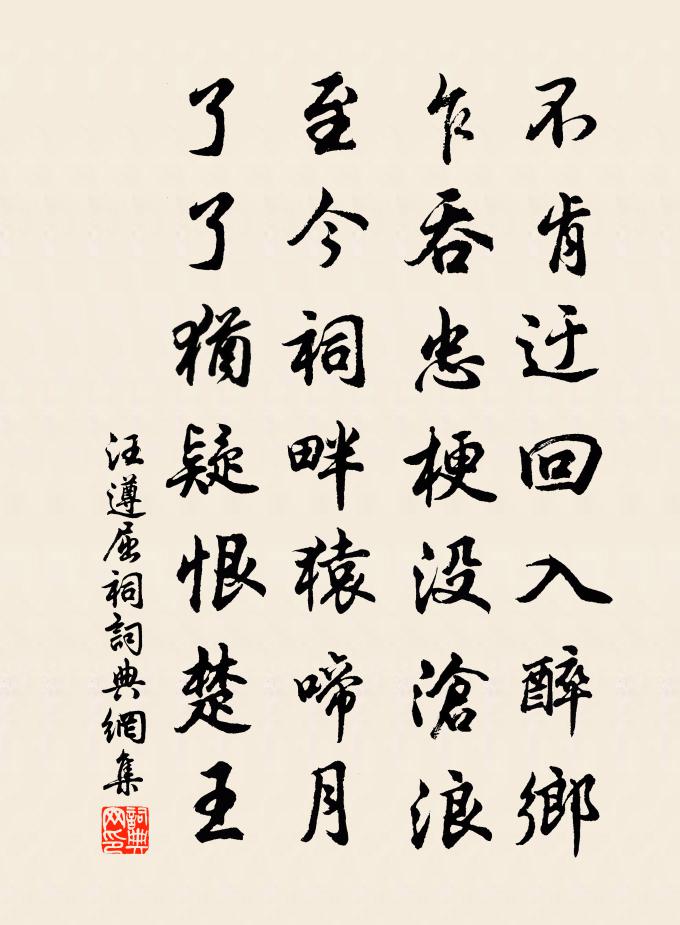 詩詞名句歷史字典書法欣賞書法字典國語詞典說文解字康熙字典古漢語字典標 題 作 者 詩 句 屈祠作者:汪遵 朝代:唐代屈祠原文不肯迂迴入醉鄉,乍吞忠梗沒滄浪。至今祠畔猿啼月,了了猶疑恨楚王。詩詞問答問:屈祠的作者是誰?答:汪遵問:屈祠寫於哪個朝代?答:唐代問:屈祠是什麼體裁?答:七絕汪遵屈祠書法欣賞屈祠書法作品注釋全唐詩:卷602-37詩詞推薦次韻趙德麟雪中惜梅且餉柑酒三首蘇軾〔宋代〕閬苑千葩映玉宸,人間只有此花新。飛霙要欲先桃李,散作千林火迫春。元夕醉梅山弟家陳著〔宋代〕為吾大患為吾身,假合將來認作真。烏兔有誰相與老,燕鶯於我已非春。再生未死客中客,萬事無聞人外人。獨有用元韻答秀叔王炎〔宋代〕老身強健幸無事,舊日交遊存者幾。後來阿秀詩句新,露滴金莖寒著齒。笑我胸中千斛塵,解纓未濯滄浪水。翠微和呂與叔觀藉田三絕張舜民〔宋代〕南薰門外禾千畝,觀稼亭前柳四垂。茭芡滿盤新熟酒,年年裝點早秋時。新秋杜范〔宋代〕大火西流日,秋風戶到時。斷痕依淺水,疊翠別高枝。氣每隨時改,人應共物萎。百年同一夢,身後欲何為。有感三首李覯〔宋代〕庭下縲囚何忿爭,刀筆少年初醉醒。黃金滿把未回眼,笑殺迂儒欲措刑。大衍易吟四十首方回〔宋代〕泰變即為蠱,否變僅為隨。元佑紹聖事,至今心骨悲。秋日即事八首郭印〔宋代〕風到秋宵特地涼,臥看斜月半侵床。來寒往暑誰能問,歸燕賓鴻各自忙。壽城圍解制參向君玉貺以凱歌和韻二首李曾伯〔宋代〕誰知匕箸落轟雷,三月新城兩月圍。吉語雖傳淮鶴捷,驚心幾動海鷗機。公毋夸伐稱全璧,我為憂疑已佩韋。何處聞楊和卿在館中讀易不去手贈以詩家鉉翁〔宋代〕人人讀醫經,知尊黃與岐。楊子讀醫經,乃以羲文周孔而為歸。易中有妙義,醫中之奧與易相表里。六十四卦字字遣興吳則禮〔宋代〕放船秋正佳,日落雁噭初。晨炊儻無米,寧尋謝胡奴。督郵端可揮,從事良欲呼。大是陶淵明,且還讀吾書。南歌子陳克〔宋代〕北固煙中寺,西津雨後山。看公英氣兩眉間。如在林霏、江月襲人寒。展翼聲名久,占熊福艾全。風流不是地行仙再書邊事張喬〔唐代〕萬里沙西寇已平,犬羊群外築空城。分營夜火燒雲遠,校獵秋雕掠草輕。秦將力隨胡馬竭,蕃河流入漢家清。羌戎九日高會有懷寧極韓維〔宋代〕親賓過我舍,置酒樂嘉節。不見箕山人,坐令歡意歇。霜風吹嘉菊,撩亂籬下發。欲寄一枝芳,雲深去鴻滅。春日劉翰〔宋代〕沉沉芳酌動金波,笑引疏梅泛玉荷。幾度天寒歸雁少,一番風雨落花多。功名好在知心懶,富貴重來奈老何。烏鵲鶯啼序·春晚感懷吳文英〔宋代〕殘寒正欺病酒,掩沉香繡戶。燕來晚、飛入西城,似說春事遲暮。畫船載、清明過卻,晴煙冉冉吳宮樹。念羈情、句王觀國〔宋代〕雨昏蘭芷湘君浦,煙鎖滄浪漁父家。遣朝華秦觀〔宋代〕夜霧茫茫曉柝悲,玉人揮手斷腸時。不須重向燈前泣,百歲終當一別離。雜曲歌辭升天行僧齊己〔唐代〕身不沉,骨不重。驅青鸞,駕白鳳。幢蓋飄飄入冷空,天風瑟瑟星河動。瑤闕參差阿母家,樓台戲閉凝彤霞。五三漁父詞一十八首神異呂岩〔唐代〕還返初成立變童,瑞蓮開處色輝紅。金鼎內,迥朦朧,換骨添筋處處通。名句推薦猶有遺簪,不展秋心,能卷幾多炎熱。張炎《疏影·詠荷葉》 月下飛天鏡,雲生結海樓。李白《渡荊門送別》 見人惡,即內省。有則改,無加警。李毓秀《弟子規·信》 願借天風吹得遠,家家門巷盡成春。李方膺《題畫梅》 思君如流水,何有窮已時。徐幹《室思》 事事要留個有餘不盡的意思,便造物不能忌我,鬼神不能損我。洪應明《菜根譚·概論》 言者所以在意,得意而忘言。莊子《莊子·雜篇·外物》 喧啾百鳥群,忽見孤鳳凰。韓愈《聽穎師彈琴》 盤心清露如鉛水,又一夜、西風吹折。張炎《疏影·詠荷葉》 此情可待成追憶?只是當時已惘然。李商隱《錦瑟》
