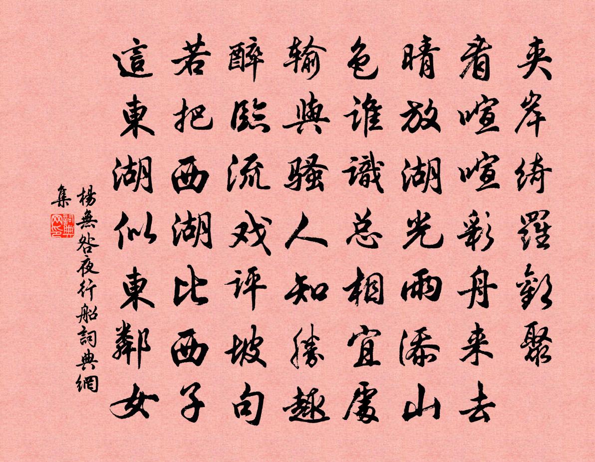 詩詞名句歷史字典書法欣賞書法字典國語詞典說文解字康熙字典古漢語字典標 題 作 者 詩 句 夜行船作者:楊無咎 朝代:宋代夜行船原文夾岸綺羅歡聚。看喧喧、彩舟來去。晴放湖光,雨添山色,誰識總相宜處。輸與騷人知勝趣。醉臨流、戲評坡句。若把西湖比西子,這東湖、似東鄰女。詩詞問答問:夜行船的作者是誰?答:楊無咎問:夜行船寫於哪個朝代?答:宋代問:夜行船是什麼體裁?答:詞楊無咎夜行船書法欣賞夜行船書法作品詩詞推薦次太守鄭安恭探梅過西湖韻二首張棟〔宋代〕金方正位鑿平湖,物景堪將入畫圖。兩岸雨垂楊柳重,一汀沙立鷺鷥孤。泓澄良夜搖明月,瀲灩高秋蘸碧蘆。寓目曲江鄭谷〔唐代〕細草岸西東,酒旗搖水風。樓台在煙杪,鷗鷺下沙中。翠幄晴相接,芳洲夜暫空。何人賞秋景,興與此時同。南嶽陶弼〔宋代〕祝融何峻極,下看白雲根。絕頂人稀,諸峰勢獨尊。闊能遮日域,高不避天閽。夜泛蘇泂〔宋代〕澄波湛湛接新秋,月子波心印一鉤。荷葉亂花看不見,夜深時有小龍游。句張載〔宋代〕無疑菱荇香。青杏兒劉處玄〔元代〕念道玉漿多。得真歡、大笑呵呵。自然酩酊逍遙快,依山臨水,雲霞洞外,忻後高歌。世景急如梭。戀恩山、灑灑上喻史君重建霞起堂六首陳夢建〔宋代〕丈人昔日經行處,草暗苔荒四十春。誰倚高寒訪陳跡,璇題寶墨一時新。射洪道中二首李流謙〔宋代〕遠墟行藹藹,滯緒豁欣欣。挾翠山能潤,矜晴草自薰。墮鳶那及吸,飛鷺可堪九。欲共江流說,滔滔故不聞。題王聲甫松坡樵苦唱後文天祥〔宋代〕倚柯睨蒼髯,短簑挾風雨。談道誰我知,對弈者其侶。狂吟發悲調,谷鳴相律呂。扊扅豈不怨,寧售大夫股。長鑱試黜寄余景仁陳藻〔宋代〕六經不合窮稍深,入場下筆無知音。吐辭從實理從是,誰肯暮途生悔心。臨漳推官韙我筆,累舉悞疑當第一。夜光南陽道中許渾〔唐代〕月斜孤館傍村行,野店高低帶古城。籬上曉花齋後落,井邊秋葉社前生。飢烏索哺隨雛叫,乳牸慵歸望犢鳴。荒草和劉會之野堂韻杜范〔宋代〕草草春又過,淒晦風雨夕。三年烏傷夢,不斷一區宅。台山在何許,空有塵滿屐。英英江夏公,老龍蟠古澤。尋勝送謝先生歸紫霄峰強至〔宋代〕不同賣藥入都市,又異執帚見相君。冠蓋臨門求上劑,公台解榻叩多聞。應思夜鶴侶蕙帳,卻笑伯鸞家布裙。藜杖左僕射相國冀公東齋幽居(同黎拾遺賦獻)岑參〔唐代〕丞相百僚長,兩朝居此官。成功雲雷際,翊聖天地安。不矜南宮貴,只向東山看。宅占鳳城勝,窗中雲嶺寬。午時送趙叔靜教授閩中四首陳傅良〔宋代〕家無宿舂糧,適意恣所向。征鞍催上官,帆海看疊嶂。有言及當代,浩飲益悲壯。以茲寘周行,盍在幾人上。柳絮韓琦〔宋代〕絮雪紛紛不自持,亂愁縈困滿春暉。有時穿入花枝過,無限蜂兒作隊飛。送人赴雅州任李復〔宋代〕去年送君走邊州,今年送君入蜀道。上官南北不自知,風卷孤雲離海嶠。場屋爭飛二十年,垂翼空歸嘆潦倒。綠衣孟浩然雪驢圖方回〔宋代〕往年一上岳陽樓,西風倏忽四十秋。詩牌高掛詩兩首,他人有詩誰敢留。其一孟浩然,解道氣吞雲夢澤。其二杜子偈頌十二首釋原妙〔宋代〕者個,爭得那個。既得那個,忘卻者個。除夕方岳〔宋代〕短髮蕭蕭老侍祠,夜壇三上華封辭。皇儲天啟重輪日,帝座春環萬壽卮。材具不供當世用,林居亦望太平時。羽衣名句推薦昔時人已沒,今日水猶寒。駱賓王《於易水送人 / 於易水送別》 楊柳千條拂面絲,綠煙金穗不勝吹。溫庭筠《題柳》 人世幾回傷往事,山形依舊枕寒流。劉禹錫《西塞山懷古》 遙憐故園菊,應傍戰場開。岑參《行軍九日思長安故園》 窮猿投林,豈暇擇木!房玄齡《晉書·列傳·第六十二章》 憑高眺遠,見長空萬里,雲無留跡。蘇軾《念奴嬌·中秋》 父兮生我,母兮鞠我。佚名《蓼莪》 禍在於好利;害在於親小人尉繚《尉繚子·十二陵》 易求無價寶,難得有心郎。魚玄機《贈鄰女 / 寄李億員外》 燕子飛來窺畫棟,玉鉤垂下簾旌。歐陽修《臨江仙·柳外輕雷池上雨》