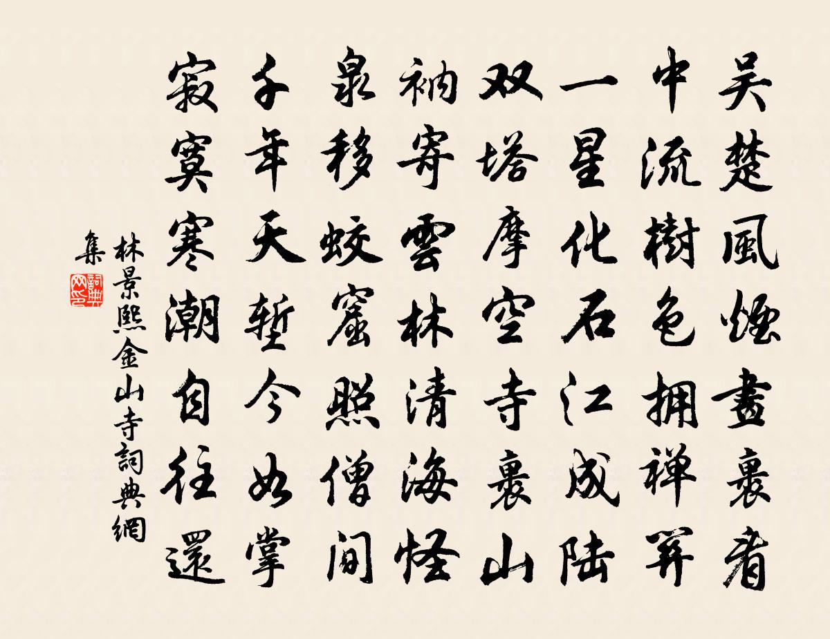 詩詞名句歷史字典書法欣賞書法字典國語詞典說文解字康熙字典古漢語字典標 題 作 者 詩 句 金山寺作者:林景熙 朝代:宋代金山寺原文吳楚風煙畫裹看,中流樹色擁禪關。一星化石江成陸,雙塔摩空寺裹山。衲寄雲林清海怪,泉移蛟窟照僧間。千年天塹今如掌,寂寞寒潮自往還。詩詞問答問:金山寺的作者是誰?答:林景熙問:金山寺寫於哪個朝代?答:宋代林景熙金山寺書法欣賞金山寺書法作品詩詞推薦陪盱眙王使君東遊四首陳造〔宋代〕紅旗圍皂蓋,離迾碧山隅。水色涵雲樹,賓筵著畫圖。香溫金鑿落,花亞錦屠蘇。醉里銀絲鱠,漁舟不待呼。和昌甫見寄韻陳文蔚〔宋代〕每日相親一卷書,席門猶是昔年如。似公長者今時少,花外何時見上車。花降圖唐寅〔明代〕江南春色鶯花老,又汲新泉浸芰荷。春色後先君莫訝,後頭花更得春多。無題佚名〔唐代〕春水春池滿,春時春草生。春人飲春酒,春鳥弄春聲。君生我未生,我生君已老。君恨我生遲,我恨君生早。人歸洛花不望而至次相兄韻洪遵〔宋代〕多謝吳中客,移花五畝園。灰心勞遠夢,繭足蹈前言。定是黃金蕊,真須白玉尊。從今付幽賞,不用賦招魂。寓乾明觀五首楊公遠〔宋代〕無奈雨潺潺,驅除惡況難。三杯官酒薄,一掬客心酸。畫卷慵拈起,書編謾展看。更誰堪與話,時對老黃冠。蘆蕭崱〔宋代〕江客因貧識荻芽,一清鏖退雜魚暇。燒來味挾蠔邊雨,掘得身離雁外沙。春饌且供行釜菜,秋妝莫管釣舡花。食根湖上王同祖〔宋代〕湖頭春水千丈碧,湖堤嫋柳不盈尺。唱歌女兒棹船回,驚起沙鷗對對立。元夕醉梅山弟家陳著〔宋代〕行年八十病餘身,梅塢留連率見真。花到詩家方吐氣,酒無菜飣不成春。世情風雨妨婦路,古道山林有主人。珍重故諫議大夫鮮于公欲作新堂以傳世譜名曰卓絕李廌〔宋代〕商朝有仁人,為奴恥榮祿。九疇傳帝秘,八教清濊俗。苗裔散諸華,慶澤鍾左蜀。崢嶸多望人,冠冕稱盛族。清平樂(雪)趙彥端〔宋代〕悠悠漾漾。做盡輕模樣。昨夜瀟瀟窗外響。多在梅梢柳上。畫樓拂曉簾開。六花一片飛來。卻被金爐香霧,騰騰扶夏日東齋曹松〔唐代〕三庚到秋伏,偶來松檻立。熱少清風多,開門放山入。題東溪公幽居李白〔唐代〕杜陵賢人清且廉,東谿卜築歲將淹。宅近青山同謝朓,門垂碧柳似陶潛。好鳥迎春歌后院,飛花送酒舞前檐。客到枝江九日簡周宰黃大受〔宋代〕日車不照出郊車,門外天雲尚鹿。青州未有居士供,白衣知是誰家奴。江山有恨橫飢眼,茱菊無情對臥壺。贏得閒夜讀傳燈雜書六言八首劉克莊〔宋代〕孫以獻公稱祖,妻以康子謚夫。何必議郎博士,千秋萬歲稱呼。寄題劉永年桂堂曾豐〔宋代〕四時之氣秋氣清,月之掬之水中精。四時之月秋月明,桂之掬之木中英。沆瀣蒸開黃爛熳,分似群仙清鼻觀。君家寄鄉人范仲淹〔宋代〕長白一寒儒,登榮三紀餘。百花春滿地,二麥雨隨車。鼓吹前迎道,煙霞指舊廬。鄉人莫相羨,教子讀詩書。鵲韓偓〔唐代〕偏承雨露潤毛衣,黑白分明眾所知。高處營巢親鳳闕,靜時閒語上龍墀。化為金印新祥瑞,飛向銀河舊路岐。莫怪清平樂楊無咎〔宋代〕花陰轉午。小院清無暑。雪碗冰甌凝灝露。自滌紫毫雞距。麝煤落紙生春。只應李衛夫人。我亦前身逸少,莫嗔太予賦雁湖詩蒙友社諸文繼聲不一輒復自和四首李壁〔宋代〕少年努力在三餘,暇日那無水石俱。自昔空傳盤谷引,只今何似輞川圖。伴人寂寞為鷳客,登俎橫斜有蟹奴。便學名句推薦紅橋路,正一派、畫船蕭鼓中流住。納蘭性德《摸魚兒·午日雨眺》 殘月臉邊明,別淚臨清曉牛希濟《生查子·春山煙欲收》 悠悠洛陽道,此會在何年。陳子昂《春夜別友人二首·其一》 那作商人婦,愁水復愁風。李白《長干行二首》 相思了無益,悔當初相見。朱彝尊《憶少年·飛花時節》 又聞子規啼夜月,愁空山李白《蜀道難》 冷艷全欺雪,余香乍入衣。丘為《左掖梨花》 劍外忽傳收薊北,初聞涕淚滿衣裳。杜甫《聞官軍收河南河北》 前年伐月支,城上沒全師。張籍《沒蕃故人》 一簾鳩外雨,幾處閒田,隔水動春鋤。張炎《渡江雲·山陰久客一再逢春回憶西杭渺然愁思》