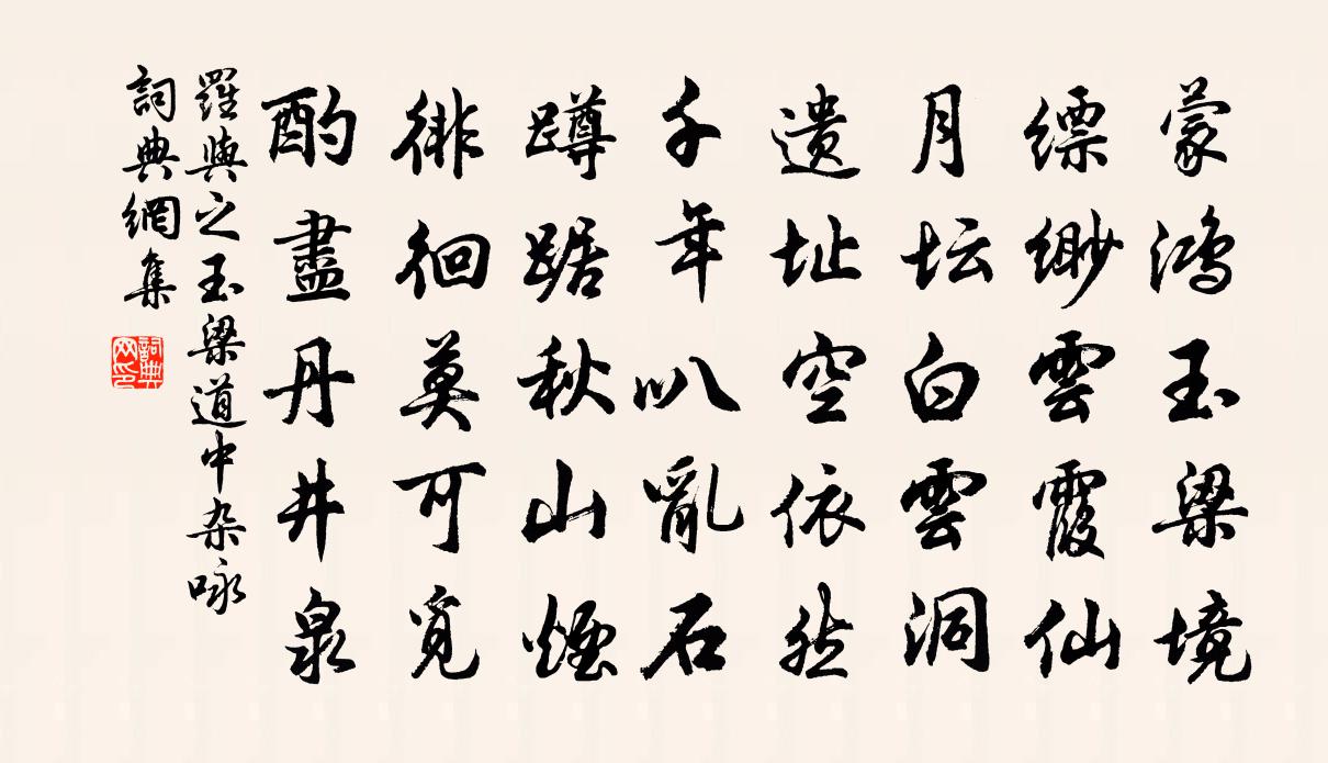 詩詞名句歷史字典書法欣賞書法字典國語詞典說文解字康熙字典古漢語字典標 題 作 者 詩 句 玉梁道中雜詠作者:羅與之 朝代:宋代玉梁道中雜詠原文濛鴻玉梁境,縹緲雲霞仙。月壇白雲洞,遺址空依然。千年叭亂石,蹲踞秋山煙。徘徊莫可覓,酌盡丹井泉。詩詞問答問:玉梁道中雜詠的作者是誰?答:羅與之問:玉梁道中雜詠寫於哪個朝代?答:宋代羅與之玉梁道中雜詠書法欣賞玉梁道中雜詠書法作品詩詞推薦送談星辰吳山人楊萬里〔宋代〕牙籌入手風前快,玉李行天鏡里看。紫闈青規吾不夢,子言欲試故應難。贈別皇甫曾靈一〔唐代〕幽人從遠岳,過客愛春山。高駕能相送,孤游且未還。紫苔封井石,綠竹掩柴關。若到雲峰外,齊心去住間。雨中明慶賞牡丹蘇軾〔宋代〕霏霏雨露作清妍,爍爍明燈照欲然。明日春陰花未老,故應未忍著酥煎。早謁禹廟張伯玉〔宋代〕曉出五雲扃,皎日麗初宿霧斂嚴祠款靈秘。拂衽天風散,不聽{下缺}冬日野外宋祁〔宋代〕野迥人來少,天平鳥去長。魚梁四寸罟,樵市五家漿。谷轉留寒霧,霞休罷夕陽。不須教目極,即是到迴腸。次繆仲右韻二首洪咨夔〔宋代〕窗暖楊花撲,庭空燕子過。年侵歡易減。春惱病宜多。攬涕論兵事,扶頭讀凱歌。日來能飲未,正好醉亡何。清畏軒鄭伯熊〔宋代〕樹蕙余百畝,世蘭當路岐。清風一披拂,香氣無不之。紉為楚累佩,辱我幽靚姿。小草生潤底,雨露無恩私。不入道院遣興陸游〔宋代〕微官不復嘆頭顱,高棟虛窗樂有餘。中夜塔鈴空際語,望秋庭樹月中疏。甗炊青飯留岩客, * 朱毫勘玉書。猶恨勸魚吟徐照〔宋代〕一寒游魚不可見,春暖游魚初見面。淵清人稀魚可游,勸魚切勿親金鉤。山居即事釋紹嵩〔宋代〕徑轉危峰逼,遍令兩眼明。涼風吹詠思,幽竹送寒聲。砧響家家急,溪陰寸寸生。含情不得語,拂石記閒名。聽琴黎廷瑞〔宋代〕虛籟起還休,輕絲斷復抽。鬼啼湘竹雨,木落洞庭秋。因子作浙操,令人悲楚囚。蒼梧不可叫,杳杳暮雲愁。梨花陸游〔宋代〕開向春殘不恨遲,綠楊窣地最相宜。征西幕府煎茶地,一幅邊鸞畫折枝。九日韋應物〔唐代〕一為吳郡守,不覺菊花開。始有故園思,且喜眾賓來。第一百九十六卷慈氏閣樂雷發〔宋代〕崢嶸梵閣礙銀潢,且對畦衣問馬王。落日斷云云楚粵,缺鍾壞像雜梁唐。英豪已往雄圖歇,棟宇猶存古意荒。惆悵送僧往湖南(一作送清上人)劉商〔唐代〕閒出東林日影斜,稻苗深淺映袈裟。船到南湖風浪靜,可憐秋水照蓮花。喜同費君長官游周敦頤〔宋代〕尋山尋水侶尤難,愛利愛名心少間。此亦有君吾茂樂,不辭高遠共躋攀。次前韻吳山甫解嘲陳著〔宋代〕望春山下剡溪湄,窮處無聊甚繫纍。竹會依然思二阮,苗凶行矣入三危。梟聲只盍聞而睡,蛇影堪期達者知。試問暮雨楊冠卿〔宋代〕飄飄為客久,在在與春期。暮雨森寒意,花香閟舊枝。看成南國老,慚誦北山移。已悞世緣惡,懷哉歸去遲。挽故開府節使觀文趙公二首蘇泂〔宋代〕杵臼孤無食,詩書卒致身。佩琴重化蜀,衣錦卻歸鄞。不廢先君養,難忘舊日貧。公卿如匹士,伯父更何人。禁直偶作三首曹勛〔宋代〕緩移淑景覺暄妍,春晚尤宜聽管弦。院宇日斜花欲睡,池塘風澹柳初眠。名句推薦客思似楊柳,春風千萬條。王安石《壬辰寒食》 幾度紅窗,誤認鳴鑣。斷腸風月可憐宵。蔡伸《一剪梅·堆枕烏雲墮翠翹》 軍聽了軍愁,民聽了民怕。王磐《朝天子·詠喇叭》 昨夜星辰昨夜風,畫樓西畔桂堂東。李商隱《無題·昨夜星辰昨夜風》 再折柳穿魚,賞梅催雪。詹玉《齊天樂·送童瓮天兵後歸杭》 柳外輕雷池上雨,雨聲滴碎荷聲。歐陽修《臨江仙·柳外輕雷池上雨》 學者非必為仕,而仕者必如學。荀子《荀子·大略》 方慚不耕者,祿食出閭里。韋應物《觀田家》 故百工從事,皆有法所度。今大者治天下,其次治大國,而無法所度,此不若百工辯也。墨子《墨子·04章 法儀》 謀無主則困,事無備則廢。管仲《管子·霸言》