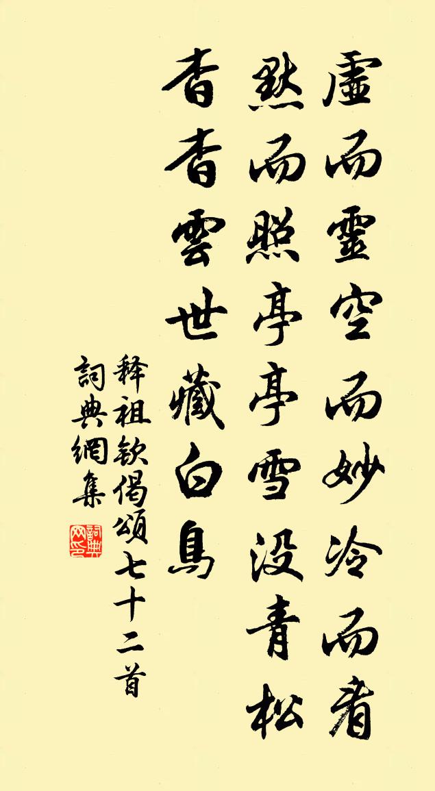 詩詞名句歷史字典書法欣賞書法字典國語詞典說文解字康熙字典古漢語字典標 題 作 者 詩 句 偈頌七十二首作者:釋祖欽 朝代:宋代偈頌七十二首原文虛而靈,空而妙。冷而看,默而照。亭亭雪,沒青松,杳杳雲,世藏白鳥。詩詞問答問:偈頌七十二首的作者是誰?答:釋祖欽問:偈頌七十二首寫於哪個朝代?答:宋代釋祖欽偈頌七十二首書法欣賞偈頌七十二首書法作品詩詞推薦洞仙歌佚名〔宋代〕梳風洗雨,蘭蕙摧殘後。玉蕊檀芳做霜曉。板橋平,溪岸小。月下歸來、乘露冷,贏得清香滿抱。一枝春在手,細舟次嚴陵方岳〔宋代〕與雁分洲宿,連雲做夢清。江風人事老,夜雨客心驚。潮急仍吞瀨,更寒不過城。子陵吾所韙,蓑外底須名。阮郎歸(寄人)姜特立〔宋代〕綠陰庭院記年時。家人捧壽卮。樂聲催拍送腰支。香風匝地衣。清夢斷,彩雲飛。劉郎今鬢絲。強將杯酒破愁眉。四月初十日得蜂蠆繭絲之句方回〔宋代〕深言懼忤時,聊復一評之。靡暇防蜂蠆,惟工竭繭絲。因循終不恤,平定豈無期。麥赭秧田廢,人家半忍飢。祭九鼎十二首真宗〔宋代〕工祝致辭,黃流協鬯。爰登清歌,載期神享。噫予誠心,精社是虔。嘉予陳祀,豈盈豆籩。山居三首廖行之〔宋代〕鳥語喚回春夢,雞聲叫出朝暾。一段可人晴景,幾家深處田村。訴衷情侯善淵〔元代〕陰陽返復勿令差。守正莫心邪。常進藥爐丹鼎,龍虎動三車。收神水,煉精華。結靈砂。水晶宮裡,玉兔金雞,吐再和胡寅〔宋代〕紛紛狼籍下天風,萬里寒光鏡色空。莫學袁安但高臥,也須斗酒醉新豐。漳南十詠圓山廟蔡襄〔宋代〕風雅遺芬岳有神,此山靈祀越千春。彩毫佳句言猶在,翠剡新詞意未真。絕頂黑林長帶雨,曲崖飛磴不留塵。瘴雲潘子賤改月帖贊岳珂〔宋代〕公立柱下,直聲凜如。氣則不餒,而況於書。待人以情,真意浹洽。於嗟前修,動則可法。送永陽崔明府司空曙〔唐代〕古國群舒地,前當桐柏關。連綿江上雨,稠疊楚南山。沙館行帆息,楓洲候吏還。乘籃若有暇,精舍在林間。念往王炎〔宋代〕疇昔鱅溪翁,重為子相攸。謂我稍可教,許以相匹儔。此德未及報,黃髮歸山邱。今又舍我去,垂老增百憂。深念闕下言懷上執政王禹偁〔宋代〕謬提文筆侍先皇,謫宦歸來遇國喪。仙駕只留燒藥鼎,繐帷猶認諫書囊。北辰別見天垂象,西內渾疑海變桑。昨日頌古三十八首釋從瑾〔宋代〕無目仙人揣骨頭,暗中摸索認王侯。價高畢竟無人買,冷卻勾欄懡?休。贈太子太傅王尚書輓詞二首梅堯臣〔宋代〕平生性忠厚,所守必尊君。面實賢愚混,心惟白黑分。事光中執法,書集右將軍。天意苦埋沒,北邙松柏墳。柳李靜獨〔宋代〕顏色鮮明能幾時,未辭黃葉已辭枝。都緣愛管閒離別,多恨多愁故早衰。晨興陳文蔚〔宋代〕書窗欲曙夢初還,起坐披衣百慮間。誰識斯時會心處,靜聽鳥語樂相關。田園樂七首·其五王維〔唐代〕山下孤煙遠村,天邊獨樹高原。一瓢顏回陋巷,五柳先生對門。曾德禮墨梅竹篆隸皆精歲在己未示似墨梅酬價曾豐〔宋代〕北枝頑頓如不仁,南枝警敏如有神。方當群有急歸宿,忽自太無偷發春。畫畫清修枝拔萃,點點精明花引類。幻盡次韻向和卿行松滋縣與鄒天錫夜語南極亭二首黃庭堅〔宋代〕雪泥滑滑到山郭,提壺勸沽亦不惡。林中解道不如歸,家人應念思歸樂。名句推薦古者聖人為猛禽狡獸暴人害民,於是教民以兵行。墨子《墨子·21章 節用(中)》 弱齡寄事外,委懷在琴書。陶淵明《始作鎮軍參軍經曲阿作》 禹廟空山里,秋風落日斜。杜甫《禹廟》 行人與我玩幽境,北風切切吹衣冷。李頎《少室雪晴送王寧》 月色穿簾風入竹,倚屏雙黛愁時。顧敻《臨江仙·月色穿簾風入竹》 初報邊烽照石頭,旋聞胡馬集瓜州。陸游《送七兄赴揚州帥幕》 江亭暇日堪高會,醉諷離騷不解愁邊貢《午日觀競渡》 總把春山掃眉黛,不知供得幾多愁?李商隱《代贈二首》 竹里繰絲挑網車,青蟬獨噪日光斜。李賀《南園十三首》 百歲落半途,前期浩漫漫。李白《登敬亭山南望懷古贈竇主簿》