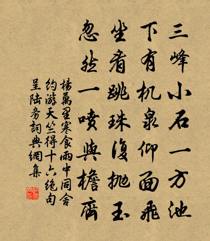 三峰小石一方池,下有機泉仰面飛。坐看跳珠復拋玉,忽然一噴與檐齊。