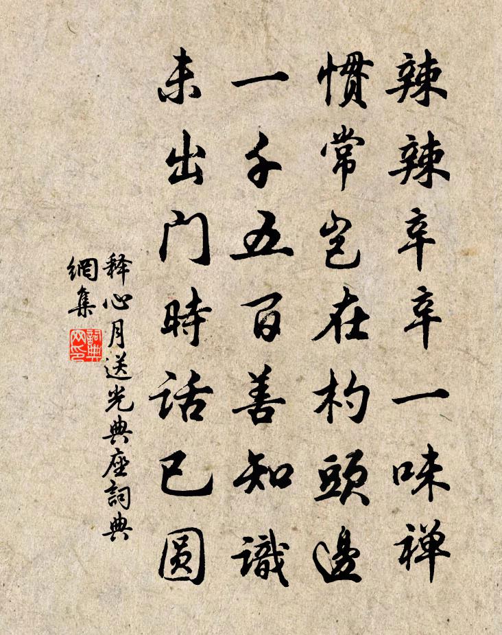 詩詞名句歷史字典書法欣賞書法字典國語詞典說文解字康熙字典古漢語字典標 題 作 者 詩 句 送光典座作者:釋心月 朝代:宋代送光典座原文辣辣辛辛一味禪,慣常豈在杓頭邊。一千五百善知識,未出門時話已圓。詩詞問答問:送光典座的作者是誰?答:釋心月問:送光典座寫於哪個朝代?答:宋代釋心月送光典座書法欣賞送光典座書法作品詩詞推薦出遊歸臥得雜詩陸游〔宋代〕壯歲經春在醉鄉,老來數酌不禁當。正須獨倚 * 坐,領略明窗半篆香。偶成曹彥約〔宋代〕當敬不敬謂這悖,當正不正謂之諛。是中適莫俱難著,意態微生已覺疏。依韻奉和判府經略司徒侍中春陰馬上之什強至〔宋代〕濕雲落地未回天,墜絮將飛力尚綿。霧重自侵旗尾潤,日高誰傍瓮頭眠。行田歲望三登谷,按轡詩成萬選錢。霖雨夏初臨曹冠〔宋代〕翠入煙嵐,綠鋪槐幄,薰風初扇微和。茂樾扶疏,絳榴花映庭柯。瀑泉飛下層坡。間新篁、夾逕青莎。良辰佳景,贈寫真劉敏叔秀才二首楊萬里〔宋代〕冰監傳神苦未工,傳來恰恰五秋風。又將老醜形骸子,般入劉家畫苑中。不寐二首劉克莊〔宋代〕□□憑書作睡媒,夜窗危坐亂書堆。甫從安樂窩移去,又向華胥國遣回。轉枕易如炊斗黍,據梧聽徹奏□□。□□春日書懷虞儔〔宋代〕吳興太守也堪憐,十日齋廚九不煙。索漠清懷寒食夜,顛狂風雨落花天。流鶯百囀還求友,化鶴重來不是仙。待得送祖龍學赴陝府酌飲贈別次歐陽永叔韻江休復〔宋代〕西掖門外駐征軒,修書院中傾別酒。諸公磊落公具來,顧我衰遲亦何有。祖侯銜使才北歸,亟請甘棠復西走。函關仙都山柳紳〔宋代〕獨出諸峰表,周圍一丈圓。千尋雄鎮地,萬仞上擎天。湖浪動星際,荷花生日邊。終當駕雲鶴,絕頂會神仙。憶書鄭剛中〔宋代〕先子晚漂泊,家藏無全書。屋壁零落者,雨壞鼠竊餘。餘生苦嗜古,葺漢十載逾。上自大父來,手澤之沾濡。下自羅浮山上過鐵橋白玉蟾〔宋代〕飛雲頂下見羅浮,五色珍禽繞石樓。行過鐵橋猿嘯罷,稚川丹灶冷颼颼。國一見代宗來起立釋了惠〔宋代〕立在威儀外,全身在裹頭。重重賜龍袖,難掩面門羞。題張應之縣齋歐陽修〔宋代〕小官窗嘆簿領,窗夫子臥高窗齋。五斗窗未能去,一丘真所懷。綠苔長秋雨,黃葉堆空階。縣古仍無柳,池清尚有為裴使君賦擬峴台王安石〔宋代〕君作新台擬峴山,羊公千載得追攀。歌鍾殷地登臨處,花木移春指顧問。城似大堤來宛宛,溪如清漢落潺潺。時平聞雨張說〔唐代〕窮冬萬花匝,永夜百憂攢。危戍臨江火,空齋入雨寒。斷猿知屢別,嘶雁覺虛彈。心對爐灰死,顏隨庭樹殘。舊恩挽吳鶴林尚書三首李曾伯〔宋代〕鳳翥鶴林邑,來儀鴛鷺群。陳謨傾帝聽,摛翰媲皇墳。位且踐台斗,心惟寄岫雲。詔綸方夜下,天曷喪斯文。步蟾宮(木犀)蔣捷〔宋代〕綠華翦碎嬌雲瘦。剩妝點、菊前蓉後。娟娟月也染成香,何況、纖羅襟袖。秋窗一夜西風驟。翠奩鎖、瓊珠花鏤。清漣磯獨坐韓維〔宋代〕綠篠清漣得釣磯,制名翻與實相違。沉鉤不忍潛魚亂,回棹常侵宿鳥飛。林靄散余知月上,水風清極怯秋歸。興來偈頌一百一十七首釋紹曇〔宋代〕嶺上雲磨松偃蹇,岩前瀑漱石琮琤。瞿曇面目全彰露,誰道今朝始誕生。跛雲門棒,休放拍盲。一杓香湯三拜著,舞曲歌辭白紵歌張籍〔唐代〕皎皎白紵白且鮮,將作春衫稱少年。裁縫長短不能定,自持刀尺向姑前。復恐蘭膏污纖指,常遣傍人收墮珥。衣裳名句推薦數年前也放狂,這幾日全無況。康海《雁兒落帶得勝令·飲中閒詠》 勝概日相與,思君心鬱陶。岑參《鞏北秋興寄崔明允》 顧此耿耿存,仰視浮雲白。文天祥《正氣歌》 貂不足,狗尾續。房玄齡《晉書·列傳·第二十九章》 水隔淡煙修竹寺,路經疏雨落花村。楊徽之《寒食寄鄭起侍郎》 雪消門外千山綠,花發江邊二月晴。歐陽修《春日西湖寄謝法曹歌》 可憐白骨攢孤冢,盡為將軍覓戰功。張蠙《吊萬人冢》 戰陣之間,不厭詐偽。韓非及後人《韓非子·難一》 卻憶安石風流,東山歲晚,淚落哀箏曲辛棄疾《念奴嬌·登建康賞心亭呈史致道留守》 才過斜陽,又是黃昏雨。晏幾道《蝶戀花·笑艷秋蓮生綠浦》