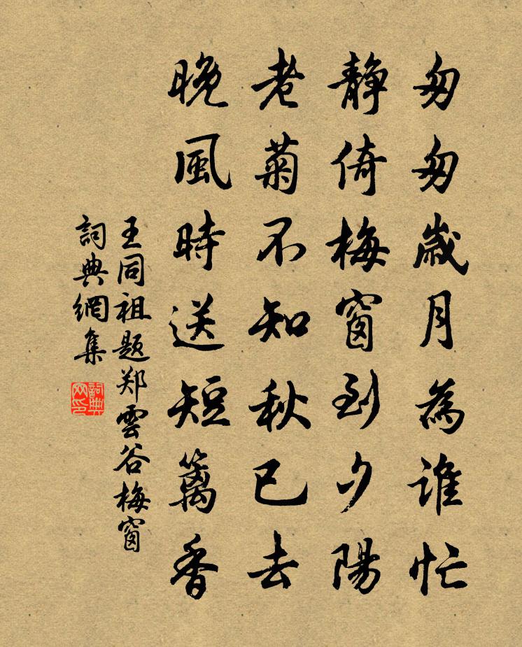 詩詞名句歷史字典書法欣賞書法字典國語詞典說文解字康熙字典古漢語字典標 題 作 者 詩 句 題鄭雲谷梅窗作者:王同祖 朝代:宋代題鄭雲谷梅窗原文匆匆歲月為誰忙,靜倚梅窗到夕陽。老菊不知秋已去,晚風時送短籬香。詩詞問答問:題鄭雲谷梅窗的作者是誰?答:王同祖問:題鄭雲谷梅窗寫於哪個朝代?答:宋代王同祖題鄭雲谷梅窗書法欣賞題鄭雲谷梅窗書法作品詩詞推薦偈頌七十一首釋了惠〔宋代〕洞山有物黑似漆,老倒玉泉裩赫赤。赤者吉中有凶,黑者凶中有吉,明眼衲僧難辨的。即今吉凶悔吝拈向一邊,玉寄題永新張氏無盡藏堂周必大〔宋代〕山間明月江上風,取之無禁用不窮。仇仙一發醯雞蒙,往往擇勝貪天功。斯堂飛梁挾雙虹,坐客常滿尊不空。翰林書懷陸游〔宋代〕不飢不寒萬事足,有山有水一生閒。朱門莫管渠痴絕,自愛茅茨三兩間。十絕句呈章茂深安撫陳造〔宋代〕詩伯於今第一流,清篇傳誦到鰲頭。共推句法源流遠,伯仲夔州只楚州。妻子第一百四十七文天祥〔宋代〕世亂遭飄蕩,飛藿共徘徊。十口隔風雪,反畏訊息來。淳熙七年端午帖子詞皇帝合六首崔敦詩〔宋代〕采縷盤金麗,香蒲鏤玉勻。君王千萬壽,歲歲樂茲辰。夢澤李商隱〔唐代〕夢澤悲風動白茅,楚王葬盡滿城嬌。未知歌舞能多少,虛減宮廚為細腰。贈李郢端公方乾〔唐代〕非唯孤峭與世絕,吟處斯須能變通。物外搜羅歸大雅,毫端剪削有餘功。山川正氣侵靈府,雪月清輝引思風。別得次韻元禮春懷十首黃庭堅〔宋代〕聞道鄰家有酒缾,三更不臥叩柴扃。我身便是鴟夷榼,肯學離騷要獨醒。再次韻二首陳造〔宋代〕飽食頻頻只鴬斯,可堪迅景隙駒馳。不逢猶是桐為弩,當價胡寧菌作芝。天策寂埋三弄笛,楚山窮處四愁詩。將壇送李丞使宣州皎然〔唐代〕結駟何翩翩,落葉暗寒渚。夢裡春谷泉,愁中洞庭雨。聊持剡山茗,以代宜城醑。再用前韻答之道弟府教授晁補之〔宋代〕文辭便是升堂賈,談辯寧非入幕超。已謂襄中能出穎,那知車下正哀謠。但從袁盎無何飲,莫笑馮公不見招。伴我園中陸游〔宋代〕霜凋櫸柳枝無葉,風折安榴子滿房。冬日園林元自好,老人懷抱自多傷。雜詠一百首臧氏劉克莊〔宋代〕嬖與賢分國,賢疏嬖在旁。未嘗無樂克,其柰有臧倉。久思蔣智由〔清代〕久思詞筆換兜鍪,浩蕩雄姿不可收。地覆天翻文字海,可能歌哭挽神州?出真陽峽十首楊萬里〔宋代〕未必陽山天下窮,英州窮到骨中空。郡官只怨無供給,支與真陽數石峰。說詩宋湘〔清代〕豫章出地勢輪囷,細草孤花亦可人。獨有五通仙杜老,各還命脈各精神。至日圜丘攝事禮畢早歸馬上口占宋庠〔宋代〕祠館宵燈罷,歸驂曉轡輕。天規斜抱苑,斗柄曲臨城。路記仙輿轍,林空寶雉聲。上元新甲子,休氣接平明。漢中行黃裳〔宋代〕漢中沃野如關中,四五百里煙蒙蒙。黃雲連天夏麥熟,水稻漠漠吹秋風。七月八月{左禾右罷}稏紅,一家往往收送筍菰與方德潤大琮石史遙求霜毫王邁〔宋代〕玉版丰標清更臞,紫姑道味頗甘腴。遣渠問訊紫薇老,後省廚供有此無。名句推薦阿香秋夢起嬌啼,玉女傳幽素。吳文英《燭影搖紅·越上霖雨應禱》 勝而不驕,敗而不怨。商鞅《商君書·戰法》 會天大雨,道不通,度已失期司馬遷《陳涉世家》 半卷紅旗臨易水,霜重鼓寒聲不起。李賀《雁門太守行》 凡彼禍難也,先者恆凶,後者恆吉。佚名《黃帝四經·十大經·雌雄節》 夜合花開香滿庭,夜深微雨醉初醒。竇叔向《夏夜宿表兄話舊》 又是重陽近也,幾處處,砧杵聲催。秦觀《滿庭芳·碧水驚秋》 水波而上,盡其搖而復下,其勢固然者也。管仲《管子·君臣下》 高風吹玉柱,萬籟忽齊飄司空曙《風箏》 愁絕行人天易暮,行向鷓鴣聲里住納蘭性德《菊花新·用韻送張見陽令江華》