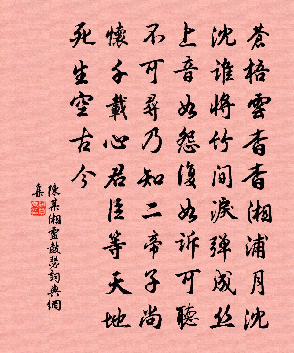 詩詞名句歷史字典書法欣賞書法字典國語詞典說文解字康熙字典古漢語字典標 題 作 者 詩 句 湘靈鼓瑟作者:陳某 朝代:宋代湘靈鼓瑟原文蒼梧雲杳杳,湘浦月沈沈。誰將竹間淚,彈成絲上音。如怨復如訴,可聽不可尋。乃知二帝子,尚懷千載心。君臣等天地,死生空古今。詩詞問答問:湘靈鼓瑟的作者是誰?答:陳某問:湘靈鼓瑟寫於哪個朝代?答:宋代陳某湘靈鼓瑟書法欣賞湘靈鼓瑟書法作品詩詞推薦再次前韻林季仲〔宋代〕野性由來愛水雲,強將麋鹿著冠巾。救時或用魯連子,談古空如司馬筠。胡雁驚心雙淚落,吳霜點鬢二毛新。腐儒春晚李群玉〔唐代〕思鄉之客空凝嚬,天邊欲盡未盡春。獨攀江樹深不語,芳草落花愁 * 。贈刀鑷王誠三首徐元傑〔宋代〕刀鑷王生勇黜妻,痛憐白髮有親慈。紛紛世上私妻子,聞有斯人死愧之。【中呂】普天樂_吳門客中九任昱〔元代〕吳門客中九秋天,三吳地,江空寒早,天遠書遲。 * 開,丹楓墜。流水行雲無拘系,好光陰枉自驅馳。塵心自洗臨江仙秦觀〔宋代〕千里瀟湘挼藍浦,蘭橈昔日曾經。月高風定露華清。微波澄不動,冷浸一天星。獨倚危檣情悄悄。遙聞妃瑟泠泠,鸂鶒許渾〔唐代〕池寒柳復凋,獨宿夜迢迢。雨頂冠應冷,風毛劍欲飄。故巢迷碧水,舊侶越丹霄。不是無歸處,心高多寂寥。即事十絕劉克莊〔宋代〕飲血吞奴羯,盛溲餉佛貍。勿論城大小,但問守城誰。大隱坊。章仇將軍良棄功守貧(一作贈章仇兵馬使)孟郊〔唐代〕飲君江海心,詎能辨淺深。挹君山嶽德,誰能齊嶔岑。東海精為月,西嶽氣凝金。進則萬景晝,退則群物陰。我欲閏月二十日離玉山八月到餘干易舟又二日抵鄱趙蕃〔宋代〕試登雲錦閣,還上揖仙亭。棟宇雖摧落,江山自典型。衝風聊策杖,晚日更揚舲。要寫吳江句,初無六尺屏。西掖寓直春曉聞殘漏姚合〔唐代〕直廬仙掖近,春氣曙猶寒。隱隱銀河在,丁丁玉漏殘。微風飄更切,萬籟雜應難。鳳閣明初啟,雞人唱漸闌。靜宜口占趙蕃〔宋代〕稍不作山行,山行眼界生。晚禾場已築,宿麥地初耕。丱角收牛策,青裙負水甖。自安如有道,所樂是無營。我亦過王濬墓李隆基〔唐代〕吳國分牛斗,晉室命龍驤。受任敵已滅,策勛名不彰。居美未盡善,矜功徒自傷。長戟今何在,孤墳此路傍。不觀贈壽上人釋智朋〔宋代〕覓諸方偈眼能乖,不把炊巾亂展開。知得一峰天下秀,地從西竺國飛來。頌一百則釋重顯〔宋代〕江國春風吹不起,鷓鴣啼在深花里。 * 浪高魚化龍,痴人猶戽夜塘水。拜星月慢·林鐘羽姜石帚以盆蓮數十置中庭宴客其中吳文英〔宋代〕絳雪生涼,碧霞籠夜,小立中庭蕪地。昨夢西湖,老扁舟身世。嘆遊蕩,暫賞、吟花酌露尊俎,冷玉紅香罍洗。眼重午於潛道中吳錫疇〔宋代〕逢人篸艾知重午,漫把青錢問酒杯。豈是醉狂慵弔古,獨醒不禁客愁來。偈頌一百二十三首釋普度〔宋代〕雨洗炎威,秋磨霄漢。風傳{左禾右罷}稏香,鼓腹寒岩畔。位轉功回木馬嘶,劫外不須重借伴。洞仙歌(雨)陳亮〔宋代〕瑣窗秋暮,夢高唐人困,獨立西風萬千恨。又檐花、落處滴碎空階,芙蓉院、無限秋容老盡。枯荷摧欲折,多少離郡事多冗命繩翁拉彥翔則明德素游趙園彥翔歸程公許〔宋代〕俗氛妨人選勝,危坐待歸啜茶。聽渠說山說水,撩我清夢還家。和虞滄江梅花四絕句程公許〔宋代〕暖日籠寒意小忺,為君索笑一巡簷。細挼玉糝浮杯麵,猶自詩腸示屬厭。名句推薦遠看山有色,近聽水無聲王維《畫》 東風漸綠西湖柳,雁已還、人未南歸。周密《高陽台·送陳君衡被召》 壯心未與年俱老,死去猶能作鬼雄。陸游《書憤五首·其二》 去年寄書報陽台,今年寄書重相催。李白《久別離》 浮生只合尊前老。雪滿長安道。舒亶《虞美人·寄公度》 聖人之官人,猶匠之用木也,取其所長,棄其所短。司馬光《資治通鑑·周紀一》 但見淚痕濕,不知心恨誰。李白《怨情》 君子恥其言而過其行。孔子弟子《論語·憲問篇》 何期小會幽歡,變作離情別緒。柳永《晝夜樂·洞房記得初相遇》 曾伴浮雲歸晚翠,猶陪落日泛秋聲。高蟾《金陵晚望》