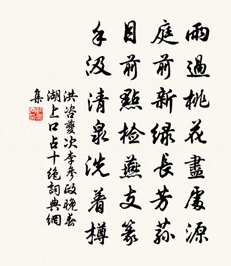 詩詞名句歷史字典書法欣賞書法字典國語詞典說文解字康熙字典古漢語字典標 題 作 者 詩 句 次李參政晚春湖上口占十絕作者:洪咨夔 朝代:宋代次李參政晚春湖上口占十絕原文**盡處源,庭前新綠長芳蓀。目前點檢燕支篆,手汲清泉洗著樽。詩詞問答問:次李參政晚春湖上口占十絕的作者是誰?答:洪咨夔問:次李參政晚春湖上口占十絕寫於哪個朝代?答:宋代洪咨夔次李參政晚春湖上口占十絕書法欣賞次李參政晚春湖上口占十絕書法作品詩詞推薦岳陽樓雜詠十二絕胡寅〔宋代〕黃帝鈞天曲未終,至今煙糧舞魚龍。臨風更欲吹長笛,搖盪波心碧玉峰。友人楚孟德過余縱言及神仙余謂之無孟德謂之司馬光〔宋代〕仙術有地終未知,眠看白髮亂如絲。何時得接浮丘袂,滄海橫飛萬餘里。次韻楊宰捕蝗宿競岩四首陳造〔宋代〕歸來聞道頗休閒,蝗事今隨暑氣殘。我欲一樽供軟腳,還能沖雨過蘇端。和文與可洋川園池三十首 寒蘆港蘇軾〔宋代〕溶溶晴港漾春暉,蘆筍生時柳絮飛。還有江南風物否,桃花流水鮆魚肥。和葺芷筍詩鄭清之〔宋代〕我貧每笑齊之斶,晚食雖甘未忘肉。梅肥尚餘風折綠,溟涬餐英命騷仆。藩籬剟彼羝角觸,送似玉堂如楚束。惡詩小步晚興董嗣杲〔宋代〕板橋孤渡險,草屋四檐穿。遠客感新月,短髭傷壯年。水籬微雪冱,天宇列星懸。無地尋朋好,歸情托七弦。禱晴獲應喜而賦詩馮伯規〔宋代〕才通香火上高穹,雨腳隨收不見蹤。豈但五民保狼戾,也緣造物相龍鍾。連山杮栗難勝摘,入市禾麻乍出舂。一飽相和歌辭。輓歌白居易〔唐代〕丹旐何飛揚,素驂亦悲鳴。晨光照閭巷,輀車儼欲行。蕭條九月天,哀輓出重城。借問送者誰,妻子與弟兄。蒼蒼輞川集白石灘王維〔唐代〕清淺白石灘,綠蒲向堪把。家住水東西,浣紗明月下。【正宮】白鶴子關漢卿〔元代〕鳥啼花影里,人立粉牆頭。春意兩絲牽,秋水雙波溜。句趙訥軒〔宋代〕門外須臾風竹定,櫓聲搖曳出蘆花。白鳥一雙簾外去,蘆花風靜釣舟閒。冬暮郊居魏野〔宋代〕村落欲黃昏,寒雲片片凝。隔城鍾似磬,遠岫燒如燈。名利堪彈指,林泉但枕肱。何由遂閒散,自喜本無能。梅高似孫〔宋代〕舍南舍北雪猶存,山外斜陽不到門。一夜冷香清入夢,野梅千樹月明村。偈頌六十五首釋普濟〔宋代〕三八念誦,勞動大眾。五月升堂,說短論長。打鼓入室,逼狗透牆。已至湖尾望見西山三首楊萬里〔宋代〕好風穩送五湖船,萬頃銀濤半霎間。已入江西猶未覺,忽然對面是西山。拜於湖張狀元墓留題朱曠〔宋代〕瘦馬踏亂山,盤折度村塢。處處花柳明,耕鋤遍壠畝。麥苗見膚寸,拳屈方出土。乃知去夏旱,布種坐遲暮。夏租雜詩二十七首曹勛〔宋代〕欣欣花木遞香紅,雲散天容靜碧空。恰是韶華濃似酒,柳絲澹蕩杏花風。凌雲寺晁公溯〔宋代〕問途出青郊,踐勝得紺園。始登十尋閣,敬禮兩足尊。仰觀碧玉螺,瑞光發麵門。飛霞在指瑞,甘泉生耳根。屹為題陰山七騎圖李石〔宋代〕回岩客子賣墨人,諸孫賣筆筆有神。墨翁已入蓬萊殿,筆孫有愧中書君。邇來小孫兼好畫,兩幅溪藤七匹馬。虎狼雜詠一百首樊通德劉克莊〔宋代〕妝束姑隨世,風流亦動人。等閒擁髻語,千載尚如新。名句推薦愛多者則法不立,威寡者則下侵上。韓非及後人《韓非子·內儲說上七術》 欲祭疑君在,天涯哭此時。張籍《沒蕃故人》 應難奈,故人天際,望徹淮山,相思無雁足。史達祖《八歸·秋江帶雨》 一言既出,駟馬難追。佚名《增廣賢文·上集》 萋萋春草秋綠,落落長松夏寒。王維《田園樂七首·其四》 相見情已深,未語可知心。李白《相逢行二首》 何以解憂?唯有杜康。曹操《短歌行》 鑒懸日月,辭富山海。百齡影徂,千載心在。劉勰《文心雕龍·徵聖》 跨馬出郊時極目,不堪人事日蕭條杜甫《野望》 脫鞍暫入酒家壚,送君萬里西擊胡岑參《送李副使赴磧西官軍》
