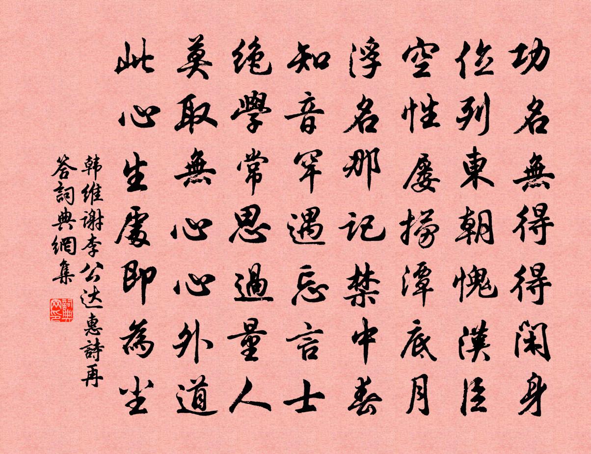 詩詞名句歷史字典書法欣賞書法字典國語詞典說文解字康熙字典古漢語字典標 題 作 者 詩 句 謝李公達惠詩再答作者:韓維 朝代:宋代謝李公達惠詩再答原文功名無得得閒身,位列東朝愧漢臣。空性屢撈潭底月,浮名那記禁中春。知音罕遇忘言士,絕學常思過量人。莫取無心心外道,此心生處即為塵。詩詞問答問:謝李公達惠詩再答的作者是誰?答:韓維問:謝李公達惠詩再答寫於哪個朝代?答:宋代韓維謝李公達惠詩再答書法欣賞謝李公達惠詩再答書法作品詩詞推薦謁金門(懷故居作)蘇庠〔宋代〕何處所。門外冷雲堆浦。竹里江梅寒未吐。茅屋疏疏雨。誰遣愁來如許。小立野塘官渡。手種凌霄今在否。柳浪迷鷓鴣天元好問〔金代〕內府清虛息萬緣。逍遙真是地行仙。從他玉帶金魚貴,聽我綸巾羽扇偏。傾美醞,祝長年。休辭瀲灩十分圓。來年惜白髮宋庠〔宋代〕曉鑒霜毛亂欲飄,感衰懷壯兩無聊。淵明雅思真高世,也解嘲人插素標。送惠法師游天台,因懷智大師故居劉長卿〔唐代〕翠屏瀑水知何在,鳥道猿啼過幾重。落日獨搖金策去,深山誰向石橋逢。定攀岩下叢生桂,欲買雲中若個峰。憶想句佚名〔唐代〕輪中別有物,光外更無空。(《詠月》)次主簿昌英叔鑷白韻楊萬里〔宋代〕滴盡思親淚,猶殘影吊形。眼花渾作黑,頷底更能青。少也投三賦,今焉忽一星。此生成底事,用腳不曾停。水調歌頭程公許〔宋代〕駝褐倚禪榻,絲鬢揚茶煙。誰知老子方寸,歷歷著千年。試問汗青餘幾,一笑腰黃縈夢,我自樂天全。出處兩無累菩薩蠻賀鑄〔宋代〕綠楊眠後拖煙穗。日長掃盡青苔地。香斷入簾風。爐心檀燼紅。蘭溪修祓禊。上巳明朝是。不許放春慵。景陽臨曉殘酌晚餐白居易〔唐代〕閒傾殘酒後,暖擁小爐時。舞看新翻曲,歌聽自作詞。魚香肥潑火,飯細滑流匙。除卻慵讒外,其餘盡不知。萬安香城寺別虔守趙公周敦頤〔宋代〕公暇頻陪塵外游,朝天仍得送行舟。軒車更共入山腳,旌旆且從留渡頭。精舍泉聲清??,高林雲色淡悠悠。談終擬水西寺東峰亭九詠棲煙鳥梅堯臣〔宋代〕斑斑遠林鳥,極目波煙中。各識時早暮,不忘巢西東。推物得真意,吾將效陶公。風俗鄭剛中〔宋代〕民生各異俗,王制論不詭。惟茲封州郡,山之一谷爾。麥秋無青黃,霜冬有紅紫。嗜好既殊尚,言語亦相抵。問之楊柳枝溫庭筠〔唐代〕兩兩黃鸝色似金,裊枝啼露動芳音。春來幸自長如線,可惜牽纏盪子心。送王應祥李石〔宋代〕進取雖狂我不狂,跨鰲今日鄭公鄉。未偕西蜀三年計,來訪東湖九月霜。桃李山城漫紅白,橘橙峽路看青黃。修門梅峰許巽〔宋代〕一峰突兀倚天際,千嶂蘢蔥龍眼中。宇宙自偏人世遠,塵埃不到佛樓空。主公真得庵居相,俗子那容線路能。山北自合浦還清湘寄虛中弟陳瓘〔宋代〕三年已絕生還望,一日天恩到海涯。路過清湘猶間闊,當時何不住長沙。雲際嶺李呂〔宋代〕凌空石磴三千丈,匝地瑤林百萬花。自有眼來方見此,直疑身山到仙家。和薛子晉來慶癸未登第韻二首袁說友〔宋代〕雲霧油然托應龍,姓名偶徹大明宮。臚傳殿廡千官肅,聲到旌旗萬馬雄。黃蝶飛來驚拜命,青衫誤著敢言功。如何鐵壁釋慧開〔宋代〕巍然一座黑金城,縫罅全無及戶扃。堪笑英雄難進步,聖凡到此絕途程。發宿遷縣文天祥〔宋代〕夜夢入星槎,曉行隨斗柄。衣暖露自乾,鬢寒冰欲凝。將軍戴鐵笠,壯士敲金鐙。白眼睨青天,我生不有命。名句推薦治大國,若烹小鮮。老子《老子·德經·第六十章》 金風細細。葉葉梧桐墜。晏殊《清平樂·金風細細》 借問江潮與海水,何似君情與妾心?白居易《浪淘沙·借問江潮與海水》 濛柳添絲密,含吹織空羅。李世民《詠雨》 若得鼓而進於義,則吾義豈不益進哉。墨子《墨子·49章 魯問》 雨過橫塘水滿堤,亂山高下路東西。曾鞏《城南·雨過橫塘水滿堤》 江寒水不流,魚嚼梅花影。釋敬安《題寒江釣雪圖》 戀樹濕花飛不起,愁無比,和春付與東流水。朱服《漁家傲·小雨纖纖風細細》 茂苑人歸,秦樓燕宿,同惜天涯為旅。吳文英《齊天樂·新煙初試花如夢》 君埋泉下泥銷骨,我寄人間雪滿頭。白居易《夢微之》