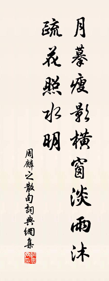 詩詞名句歷史字典書法欣賞書法字典國語詞典說文解字康熙字典古漢語字典標 題 作 者 詩 句 句作者:周麟之 朝代:宋代句原文月摹瘦影橫窗淡,雨沐疏花照水明。詩詞問答問:句的作者是誰?答:周麟之問:句寫於哪個朝代?答:宋代周麟之句書法欣賞句書法作品詩詞推薦季札墓王冕〔元代〕識君因讀春秋傳,今日墳前見斷碑。大義可令吳俗變,高風不獨魯人知。劍光注壑生靈草,樹影懸空動羽旗。休問蒹葭杜甫〔唐代〕摧折不自守,秋風吹若何。暫時花戴雪,幾處葉沉波。體弱春風早,叢長夜露多。江湖後搖落,亦恐歲蹉跎。和何元清韻九絕王炎〔宋代〕春深繞屋綠陰稠,卻掃無人識冗侯。獨肯叩關相勞問,不妨挾冊共藏修。五泄山三學院十題石門釋鹹潤〔宋代〕雙峰起雲際,仿佛五侯門。煙霞鎖不開,曾無車馬奔。寄趙紫芝蘇泂〔宋代〕同年今半百,同病半年賒。瘦骨如枯木,殘身類晚花。人言關念慮,書字覺欹斜。且願逢靈藥,清吟老鬢華。閱秦紀二首孫嵩〔宋代〕泰岳聊逃雨,湘山偶阻風。伐樹仍封樹,元無罪與功。淡圃兄生辰有詩次韻艾可翁〔宋代〕來壽吾兄玉局仙,郎君亦自醉頹然。亂離難得團圞日,清健何須少壯年。投老宦情雲在壑,憂時心事日行天。遐齡與副伴王領衛論弈象袁說友〔宋代〕輕兵三十二,一著見安危。疋馬渡河日,腳踏車馳敵時。棘門漫兒戲,淝水付枰棋。小試平戎手,將軍更出奇。醒心亭曾協〔宋代〕主人誰與解春酲,百斛香醪一小亭。兀兀泠泠俱可樂,醒來還醉醉還醒。試院中王安石〔宋代〕青燈照我夢城西,坐上傳觴把菊枝。忽忽覺來頭更白,隔牆聞語趁朝時。龐婆報兒兒即倚鋤立化圖贊釋紹曇〔宋代〕小姝先行,老爺踵去。無意奔喪,急尋死路。哭泣煞孤孀這老娘,钁頭邊事難分付。挽喬民瞻王洋〔宋代〕楚鄉槐市憶當年,錦繡文章六藝先。朱紱哀憐應有在,白頭故舊各悽然。修文地下埋英骨,遺愛江城付彩編。造化蕃艤舟湘西之明夕鄭仲理吳德夫周伯壽黎季成趙蕃〔宋代〕情親獨數君。贈詩難卒和,別酒易成醺。渺渺江山恨,飄飄鴻雁群。不忘相博約,未可間知聞。晚春吳錫疇〔宋代〕書策爐熏了日閒,雨余庭砌綠迴環。一春又是尋常過,兩鬢誰知容易斑。輕薄楊花芳草岸,淒涼杜宇夕陽山。不嫌魏總乾嘉父以果齋求詩為賦二章曹彥約〔宋代〕偶向齋名見一斑,其中蓄德尚多端。講明自有安心要,出處還須中節看。持以贈君成我拙,歸而求此有兄難。當年題劉文簡所藏墨梅卷劉宰〔宋代〕煙雨和成宛擅場,新來翻著雪衣裳。以吾不可學渠可,善學楊君祗此郎。聞歌二絕葛立方〔宋代〕初唱城堙雁影寒,玉喉窈窱嚲雲簪。小叢底處傳歌樣,供奉梨園人姓南。獲鬼章二十二韻蘇軾〔宋代〕青唐有逋寇,白首已窮妖。竊據臨洮郡,潛通講渚橋。廟謀周召虎,邊帥漢班超。堅壘千兵破,連航一炬燒。擒奸題老悟畫卷四首裘萬頃〔宋代〕中興以前作山水,只說李成與郭熙。誰知淳熙有此老,健筆不減巨然師。秋夜不寐楊萬里〔宋代〕秋氣侵人冷欲永,不由老境不愁生。雨聲己遣儂無睡,更著寒蛩泣到明。名句推薦半畝方塘一鑒開,天光雲影共徘徊。朱熹《活水亭觀書有感二首·其一》 秋風吹地百草乾,華容碧影生晚寒。李賀《開愁歌》 竹樹無聲或有聲,霏霏漠漠散還凝。杜荀鶴《春日山中對雪有作》 文豈有常體,但以有體爲常李大師、李延壽《南史·列傳·卷三十二》 忙日苦多閒日少,新愁常續舊愁生。陸游《浣溪沙·和無咎韻》 擬把傷離情緒,待曉寒重說。納蘭性德《好事近·簾外五更風》 士雖有學,而行為本焉。墨子《墨子·02章 修身》 岸邊兩兩三三,浣沙游女。柳永《夜半樂·凍雲黯淡天氣》 將之器,其用大小不同。諸葛亮《將苑·卷一·將器》 晚風庭院落梅初。淡雲來往月疏疏。李清照《浣溪沙·髻子傷春慵更梳》