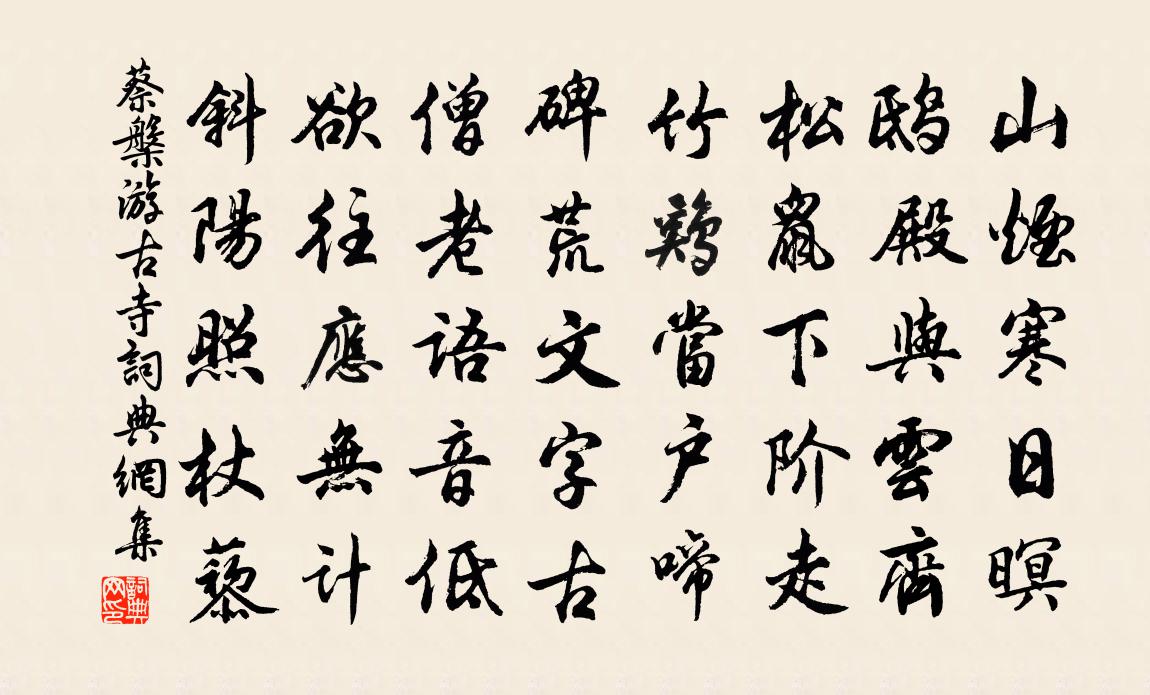 詩詞名句歷史字典書法欣賞書法字典國語詞典說文解字康熙字典古漢語字典標 題 作 者 詩 句 游古寺作者:蔡槃 朝代:宋代游古寺原文山煙寒日暝,鴟殿與雲齊。松鼠下階走,竹雞當戶啼。碑荒文字古,僧老語音低。欲往應無計,斜陽照杖藜。詩詞問答問:游古寺的作者是誰?答:蔡槃問:游古寺寫於哪個朝代?答:宋代蔡槃游古寺書法欣賞游古寺書法作品詩詞推薦梅鄭谷〔唐代〕江國正寒春信穩,嶺頭枝上雪飄飄。何言落處堪惆悵,直是開時也寂寥。素 * 尊桃莫比,孤香黏袖李須饒。離人送柳郎中(一作柳侍御,一作李侍郎)裴起居武元衡〔唐代〕沱江水綠波,喧鳥去喬柯。南浦別離處,東風蘭杜多。長亭春婉娩,層漢路蹉跎。會有歸朝日,班超奈老何。柳梢青陳允平〔宋代〕沁月凝霜。精神好處,曾悟花光。帶雪煎茶,和冰釀酒,聊潤枯腸。看花小立疏廊。道是雪、如何恁香。幾度巡檐八六子鄭熏初〔宋代〕憶南花洲。紺波花縈繞,垂花楊翠拂朱花樓。念十載風流夢覺,滿身花影人扶,舊曾暗游。無言空愴離憂。醉袖裛游中梁山於鄴〔唐代〕僻地好泉石,何人曾陸沈。不知青嶂外,更有白雲深。因此見喬木,幾回思舊林。殷勤猿與鳥,唯我獨何心。馬詩二十三首·其十五李賀〔唐代〕不從桓公獵,何能伏虎威?一朝溝隴出,看取拂雲飛。書憤陸游〔宋代〕山河自古有乖分,京洛腥膻實未聞。劇盜曾從宗父命,遺民猶望岳家軍。上天悔禍終平虜,公道何人肯散群?白首三月十七日以檄出行賑貸旬日而復反自州門至趙蕃〔宋代〕浦口江頭艇子呼,有懷逸興恐成孤。非鬭郵傳憎塵土,自愛江山入畫圖。峰勢宛如神峻拔,瀑痕渾似筆濃枯。顧憐望仙門晏殊〔宋代〕紫薇枝上露華濃。起秋風。管弦聲細出簾櫳。象筵中。仙酒斟雲液,仙歌轉繞樑虹。此時佳會慶相逢。慶相逢。歡米元章寶月觀詩帖贊岳珂〔宋代〕月之行空,四海清輝,豈獨於一觀見之。覽層宇之翬,地高而天隨,而後可以觀公之詩。和彭世昌項安世〔宋代〕有山有水勝吾閭,非舊非親借屋居。醉尉訶人何所恨,老彭於我未全疏。右車牙少愁看栗,左目眵多怕讀書。比似道損司門前日過訪別且雲計程二月到郡正看暗梅堯臣〔宋代〕蜀州海棠勝兩川,使君欲賞意已猶。春露洗開千萬株,燕脂點素攢細梗。朝看不足暮秉燭,何暇更尋桃與杏。青泥憶端子三首胡寅〔宋代〕不知埋玉已經年,忽值生朝倍黯然。空向夢魂期遠大,謬於方技覓安全。翩翩翰墨留身後,炯炯精神在黃泉。汝翁雪中洞山黃櫱二禪師相訪蘇轍〔宋代〕江南氣暖冬未回,北風吹雪真快哉。雪中訪我二大士,試問此雪從何來。君不見六月赤日起冰雹,又不見臘月幽谷送杜元穎元稹〔唐代〕江上五年同送客,與君長羨北歸人。今朝又送君先去,千里洛陽城裡塵。喜張仲景范與蔡仲見過晁公溯〔宋代〕昔游房相湖,乃適與子逢。迨其景將入,不盡湖所窮。今子聯翩來,二難復相從。散策破莓苔,循池詠芙蓉。子勿醵飲劉園趙汝鐩〔宋代〕隨意攜盤饌,毋煩事禮文。燕飛沖幕過,鶯語隔牆聞。興自樽前發,韻從花下分。詩成似供課,醉墨競紛紜。句梅詢〔宋代〕我有集仙經始在,勞君一到為重脩。墨梅家鉉翁〔宋代〕非香之香,非色之色。伴我孤吟,風清月白。建士施霆亨自夔以相迓魏了翁〔宋代〕三峽雲連白帝城,風波九死得餘生。虎頭狼尾亂流濟,貓面馬肝緣壁行。中衍何妨需在險,心亨但見坎常平。況逢名句推薦君子泰而不驕,小人驕而不泰。孔子弟子《論語·子路篇》 天際兩蛾凝黛,愁與恨、幾時極。韓元吉《霜天曉角·題採石蛾眉亭》 三過平山堂下,半生彈指聲中。蘇軾《西江月·平山堂》 以治氣養生則後彭祖,以修身自名則配堯、禹。宜於時通,利以處窮,禮信是也。荀子《荀子·修身》 握手西風淚不乾,年來多在別離間。納蘭性德《於中好·送梁汾南還為題小影》 怒濤卷霜雪,天塹無涯。柳永《望海潮·東南形勝》 楓林凋翠,寒雁聲悲。趙長卿《柳梢青·過何郎石見早梅》 知一切法無我。得成於忍。鳩摩羅什譯《金剛經·不受不貪》 勸我早還家,綠窗人似花。韋莊《菩薩蠻·紅樓別夜堪惆悵》 半壁見海日,空中聞天雞。李白《夢遊天姥吟留別 / 別東魯諸公》